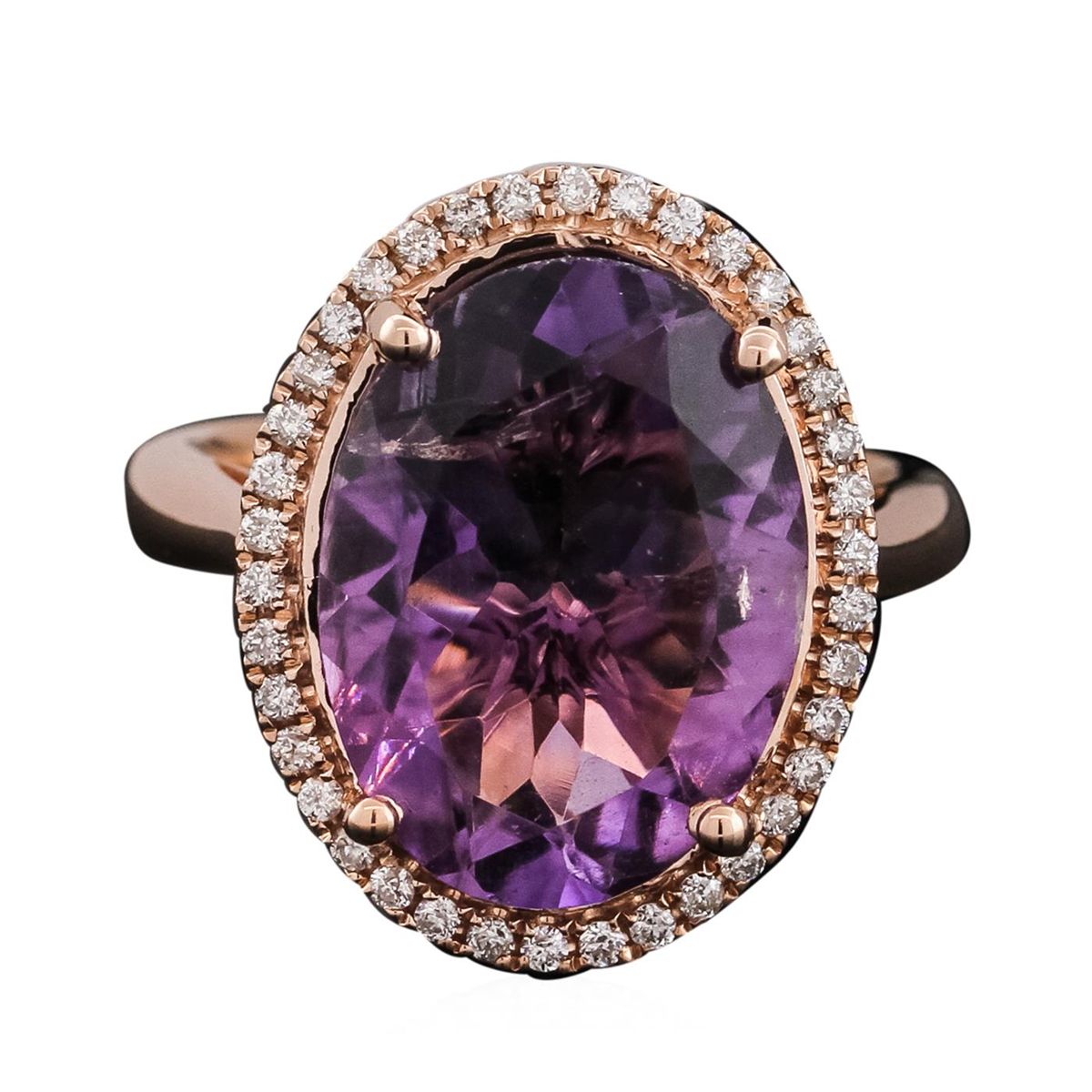 One electronically tested 14KT rose gold ladies combination cast & assembled amethyst and diamond ring with a flat shank with a bright polish finish. Identified with markings of "14K". Condition is new. Containing: One prong set oval modified brilliant cut natural amethyst, measuring 15.91 x 11.79 x 6.53mm, approximate weight of 6.66ct., clarity is eye clean, type II, medium, moderately strong, purple color, (GIA P 5/4), cut is good. Thirty-Eight prong set round brilliant cut diamonds, measuring 1.10 - 1.10 x 0.66mm (depth est.) stated total weight of 38 Stones = 0.18ct. Clarity: I-1 to I-2. Color: I - J, Cut is Good. Colored gemstones are presumed to have been subjected to commonly used enhancement processes. All diamonds and colored gemstones are graded in the mounting, unless otherwise stated total weight of Colored Stones 6.66ct. Total Weight of Diamonds 0.18ct. Total Weight of Ring 7.00 grams. GGL Appraised at $3,640.00.
