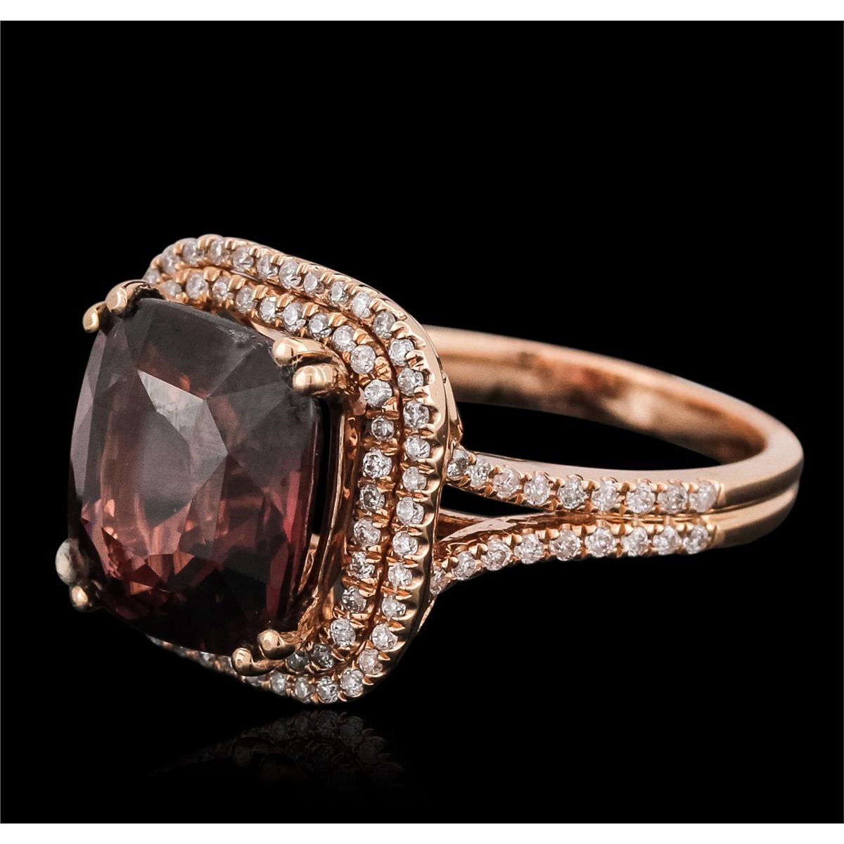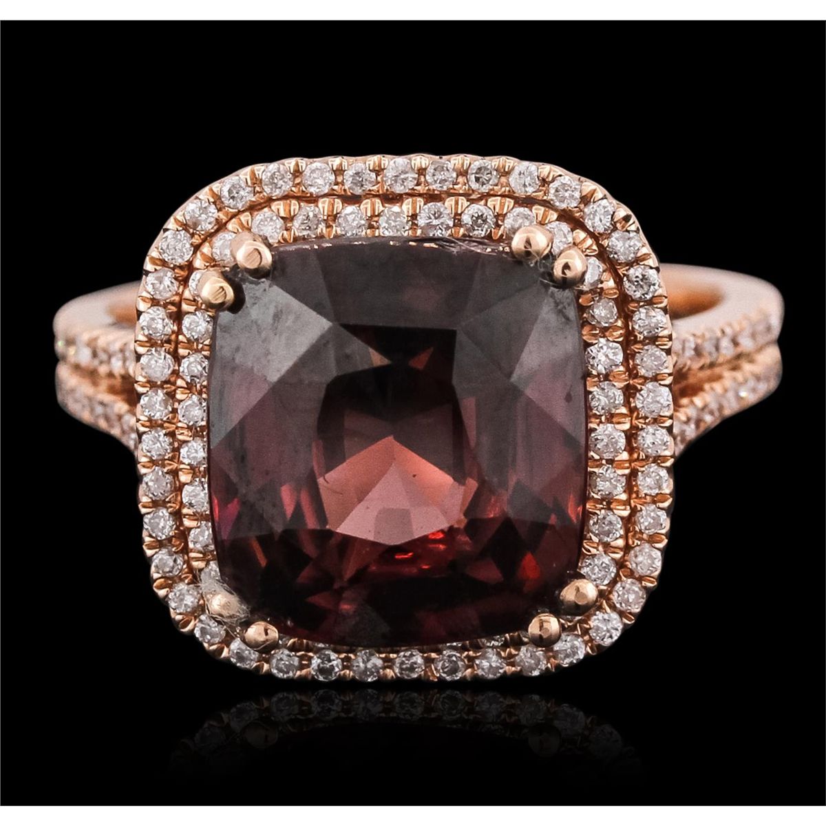 One electronically tested 14KT rose gold ladies combination cast & assembled ring with a bright polish finish. Identified with markings of "14K". Condition is new. Containing: One prong set square cushion modified brilliant cut natural rhodolite garnet, measuring 10.50 x 10.50 x 6.83mm, approximate weight of 6.72ct., clarity is eye clean, type II, medium, very slightly grayish, reddish purple color, (GIA rP 5/3), cut is good. One Hundred Twelve prong set round brilliant cut diamonds, measuring 1.00 - 1.00 x 0.60mm (depth est.) approximate total weight of 112 Stones = 0.40ct. Clarity: I-1 to I-2. Color: I - J, Cut is Good. Colored gemstones are presumed to have been subjected to commonly used enhancement processes. All diamonds and colored gemstones are graded in the mounting, unless otherwise stated. Total Weight of Colored Stones 6.72ct. Total Weight of Diamonds 0.40ct. Total Weight of Ring 7.50 grams. GGL Appraised at $5,890.00.
