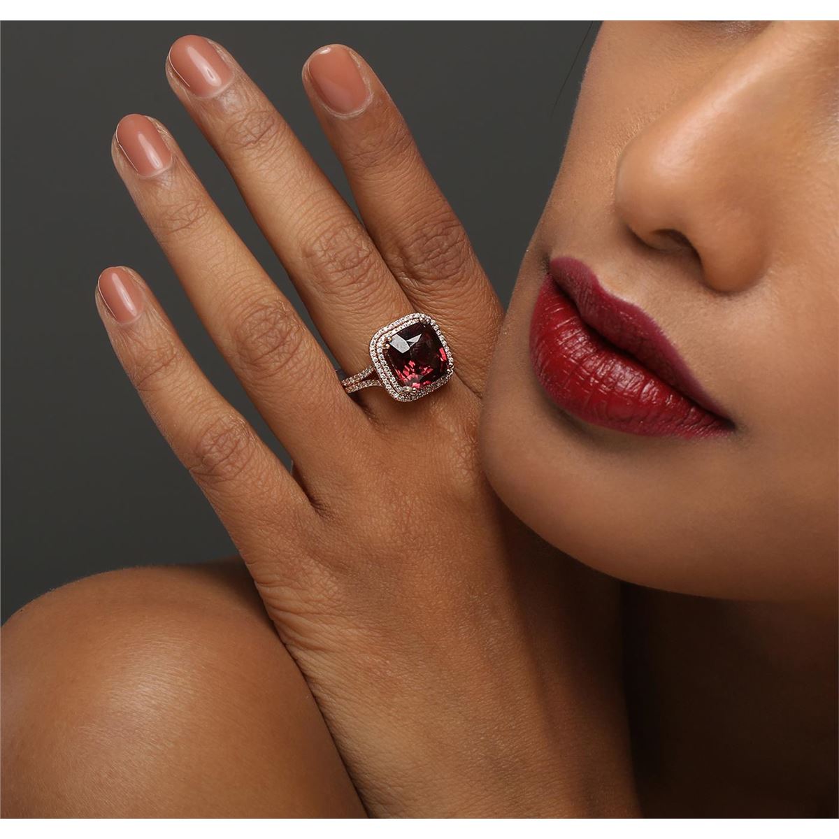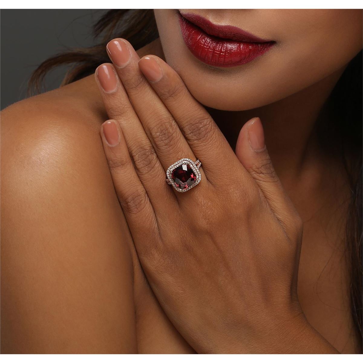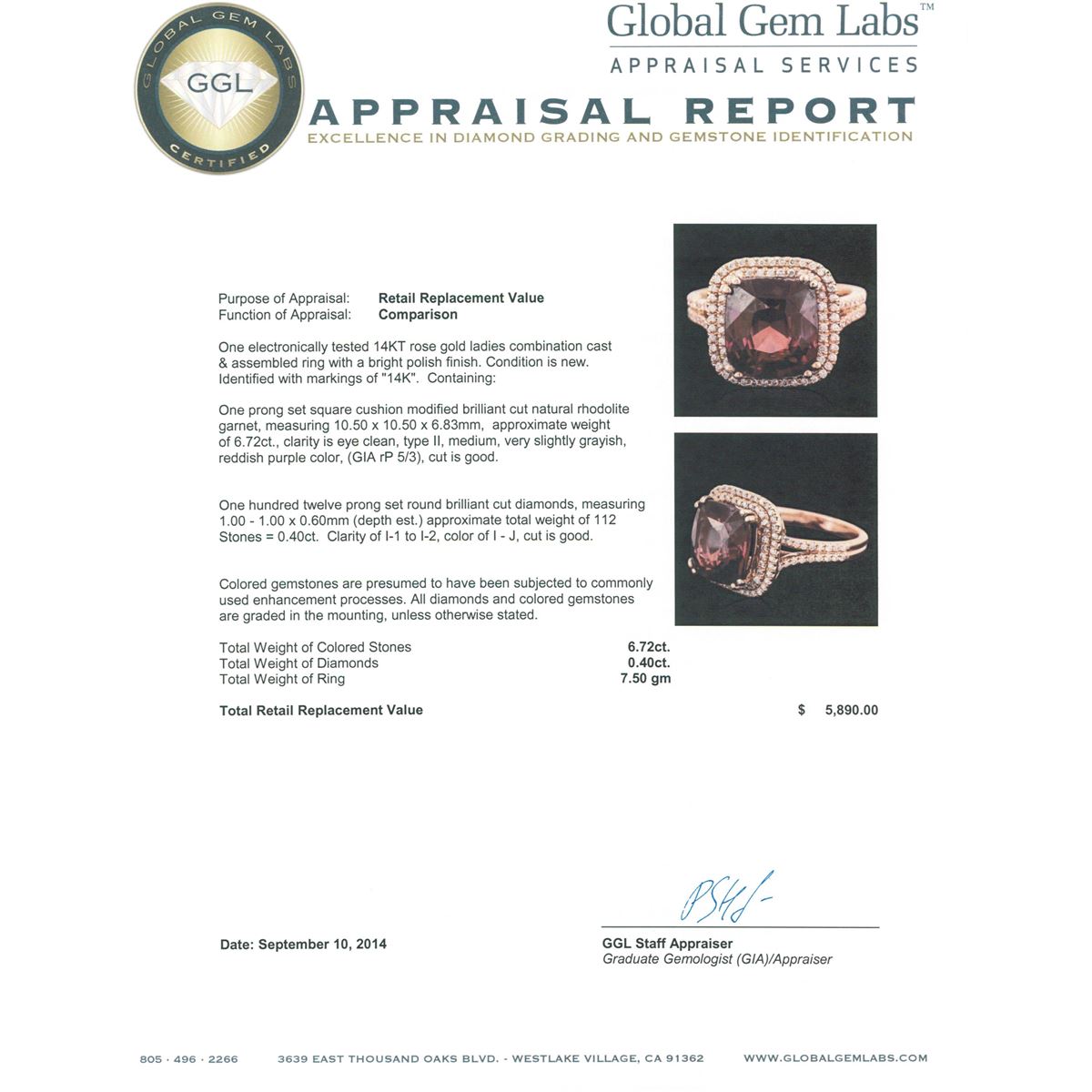 One electronically tested 14KT rose gold ladies combination cast & assembled ring with a bright polish finish. Identified with markings of "14K". Condition is new. Containing: One prong set square cushion modified brilliant cut natural rhodolite garnet, measuring 10.50 x 10.50 x 6.83mm, approximate weight of 6.72ct., clarity is eye clean, type II, medium, very slightly grayish, reddish purple color, (GIA rP 5/3), cut is good. One Hundred Twelve prong set round brilliant cut diamonds, measuring 1.00 - 1.00 x 0.60mm (depth est.) approximate total weight of 112 Stones = 0.40ct. Clarity: I-1 to I-2. Color: I - J, Cut is Good. Colored gemstones are presumed to have been subjected to commonly used enhancement processes. All diamonds and colored gemstones are graded in the mounting, unless otherwise stated. Total Weight of Colored Stones 6.72ct. Total Weight of Diamonds 0.40ct. Total Weight of Ring 7.50 grams. GGL Appraised at $5,890.00.