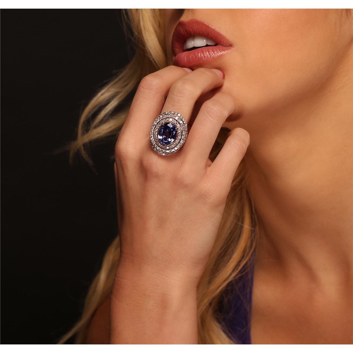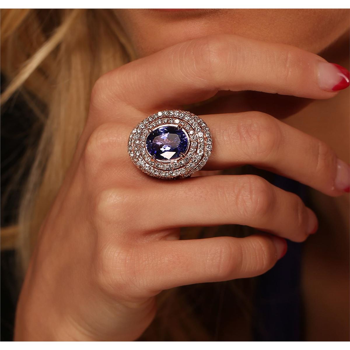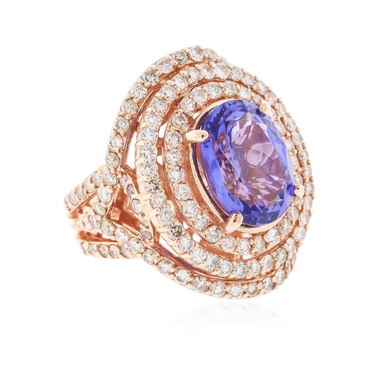 One electronically tested 14KT rose gold ladies cast tanzanite and diamond ring with a bright polish finish. Condition is new, good workmanship. The featured tanzanite is set within a two tiered diamond bezel, supported by intertwined ribbons of diamonds as shoulders and completed by a four millimeter wide band. Identified with markings of "K14". Containing: One prong set oval mixed cut natural tanzanite, measuring 13.50 x 10.60 x 6.50mm, 8%. bulge factor, approximate weight of 6.83ct., clarity is eye clean, type I, medium dark, very slightly grayish, bluish violet color, (GIA bV 6/3), cut is good. Transmitting light with no distortion, transparent. Colored Stone Grading Report attached. Graded in the setting. Tanzanite is a very rare gemstone that is only found in the country of Tanzania. Originally discovered in 1967. Tiffany & Company, named the stone Tanzanite. It is found in the Usumburu Mountains that border the Umba Valley of northern Tanzania. Tanzanite occurs in gray, brown, violet, blue, reddish-purple, & green. The gem is interesting because of its exceptional pleochroism. Rotated in different directions a tanzanite will exhibit multiple changes of color. Tanzanite has a low tolerance to ultrasonic cleaning, and should not be cleaned using this method. One Hundred Thirty-Nine prong set round brilliant cut diamonds, measuring 2.00 - 1.90 x 1.17mm (depth est.) approximate. Total Weight of 139 Stones = 3.86ct. Faint brown secondary color throughout. Graded in the setting. Clarity: SI-1 to I-1. Color: I - K. Total Weight of Colored Stones 6.83ct. Total Weight of Diamonds 3.86ct. Total Weight of Ring 16.90 grams. AIG Appraised at $28,400.00.