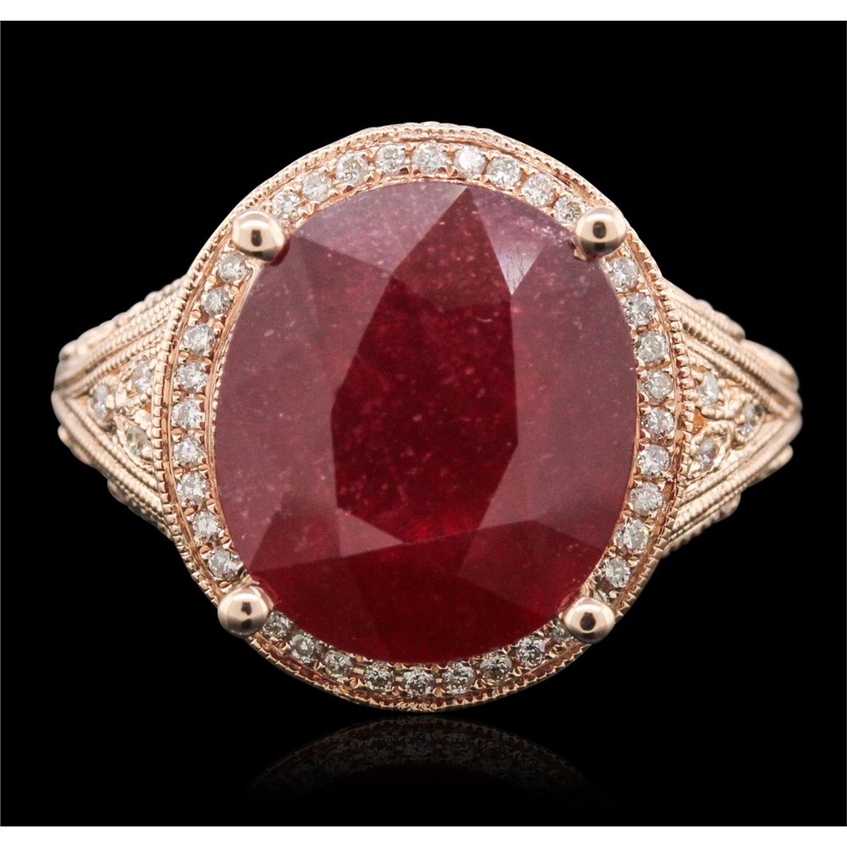 One electronically tested 14KT rose gold ladies cast ruby and diamond ring. Condition is new, good workmanship. The featured ruby is set within a diamond bezel supported by elaborate diamond accented shoulders, completed by a two and one-half millimeter wide band. Bright polish finish with milgrain detailing throughout. Trademark is PMI. Identified with markings of "14K". Containing: One prong set oval mixed cut natural ruby, measuring 13.30 x 10.16 x 5.75mm, 10%. bulge factor, approximate weight of 6.96ct., clarity is heavily included, type II, dark, very slightly brownish, red color, (GIA R 7/3), cut is good. Transmitting light somewhat diffusely, transparent to translucent. Naturally occurring internal & external characteristics are present. Indications of laboratory high temperature heat treatment, with glass & flux additives. Graded in the setting. Ruby has a low tolerance to rhodium plating, repolishing the surface, & ultrasonic cleaning. Forty-Six prong set round brilliant cut diamonds, measuring 1.10 - 1.00 x 0.63mm (depth est.) approximate. Total Weight of 46 Stones = 0.29ct. Graded in the setting. Clarity: SI-1 to I-1. Color: G - I. Total Weight of Colored Stones 6.96ct. Total Weight of Diamonds 0.29ct. Total Weight of Ring 8.50 grams. AIG Appraised at $3,935.00.