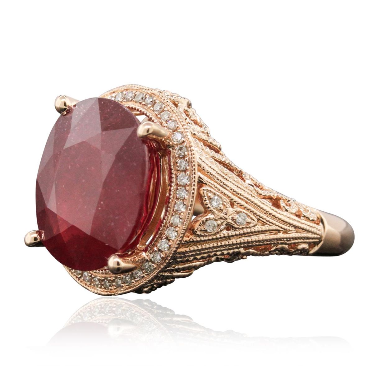 One electronically tested 14KT rose gold ladies cast ruby and diamond ring. Condition is new, good workmanship. The featured ruby is set within a diamond bezel supported by elaborate diamond accented shoulders, completed by a two and one-half millimeter wide band. Bright polish finish with milgrain detailing throughout. Trademark is PMI. Identified with markings of "14K". Containing: One prong set oval mixed cut natural ruby, measuring 13.30 x 10.16 x 5.75mm, 10%. bulge factor, approximate weight of 6.96ct., clarity is heavily included, type II, dark, very slightly brownish, red color, (GIA R 7/3), cut is good. Transmitting light somewhat diffusely, transparent to translucent. Naturally occurring internal & external characteristics are present. Indications of laboratory high temperature heat treatment, with glass & flux additives. Graded in the setting. Ruby has a low tolerance to rhodium plating, repolishing the surface, & ultrasonic cleaning. Forty-Six prong set round brilliant cut diamonds, measuring 1.10 - 1.00 x 0.63mm (depth est.) approximate. Total Weight of 46 Stones = 0.29ct. Graded in the setting. Clarity: SI-1 to I-1. Color: G - I. Total Weight of Colored Stones 6.96ct. Total Weight of Diamonds 0.29ct. Total Weight of Ring 8.50 grams. AIG Appraised at $3,935.00.