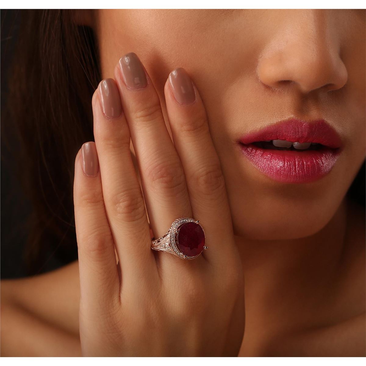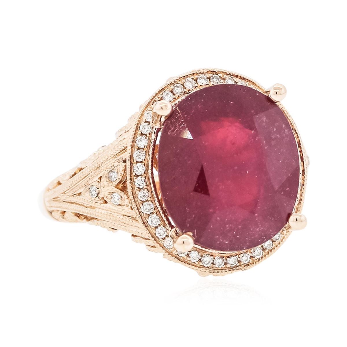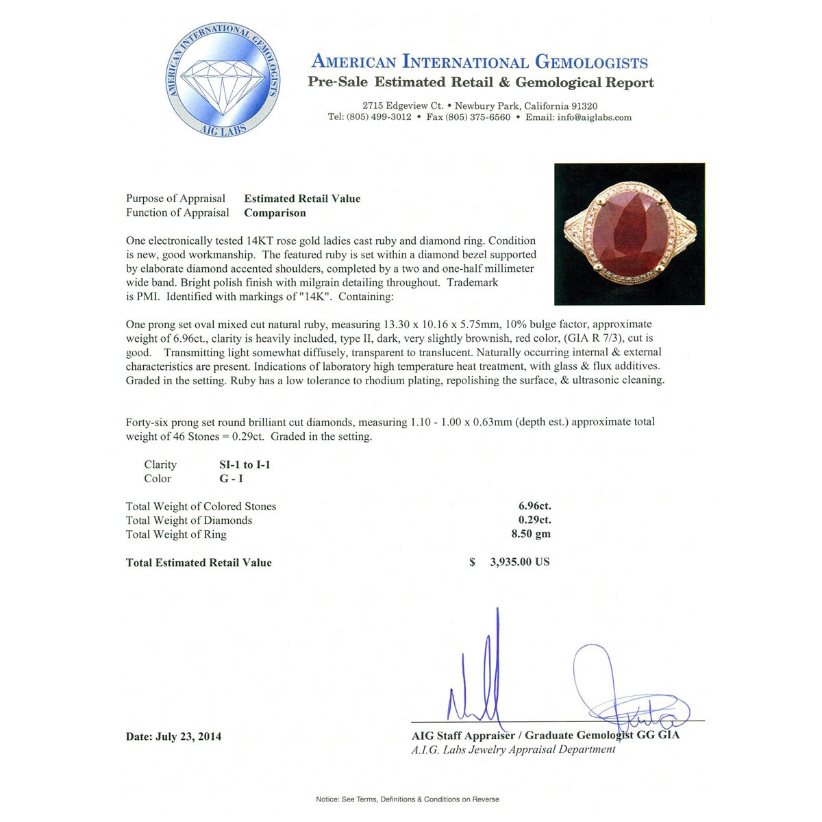 One electronically tested 14KT rose gold ladies cast ruby and diamond ring. Condition is new, good workmanship. The featured ruby is set within a diamond bezel supported by elaborate diamond accented shoulders, completed by a two and one-half millimeter wide band. Bright polish finish with milgrain detailing throughout. Trademark is PMI. Identified with markings of "14K". Containing: One prong set oval mixed cut natural ruby, measuring 13.30 x 10.16 x 5.75mm, 10%. bulge factor, approximate weight of 6.96ct., clarity is heavily included, type II, dark, very slightly brownish, red color, (GIA R 7/3), cut is good. Transmitting light somewhat diffusely, transparent to translucent. Naturally occurring internal & external characteristics are present. Indications of laboratory high temperature heat treatment, with glass & flux additives. Graded in the setting. Ruby has a low tolerance to rhodium plating, repolishing the surface, & ultrasonic cleaning. Forty-Six prong set round brilliant cut diamonds, measuring 1.10 - 1.00 x 0.63mm (depth est.) approximate. Total Weight of 46 Stones = 0.29ct. Graded in the setting. Clarity: SI-1 to I-1. Color: G - I. Total Weight of Colored Stones 6.96ct. Total Weight of Diamonds 0.29ct. Total Weight of Ring 8.50 grams. AIG Appraised at $3,935.00.