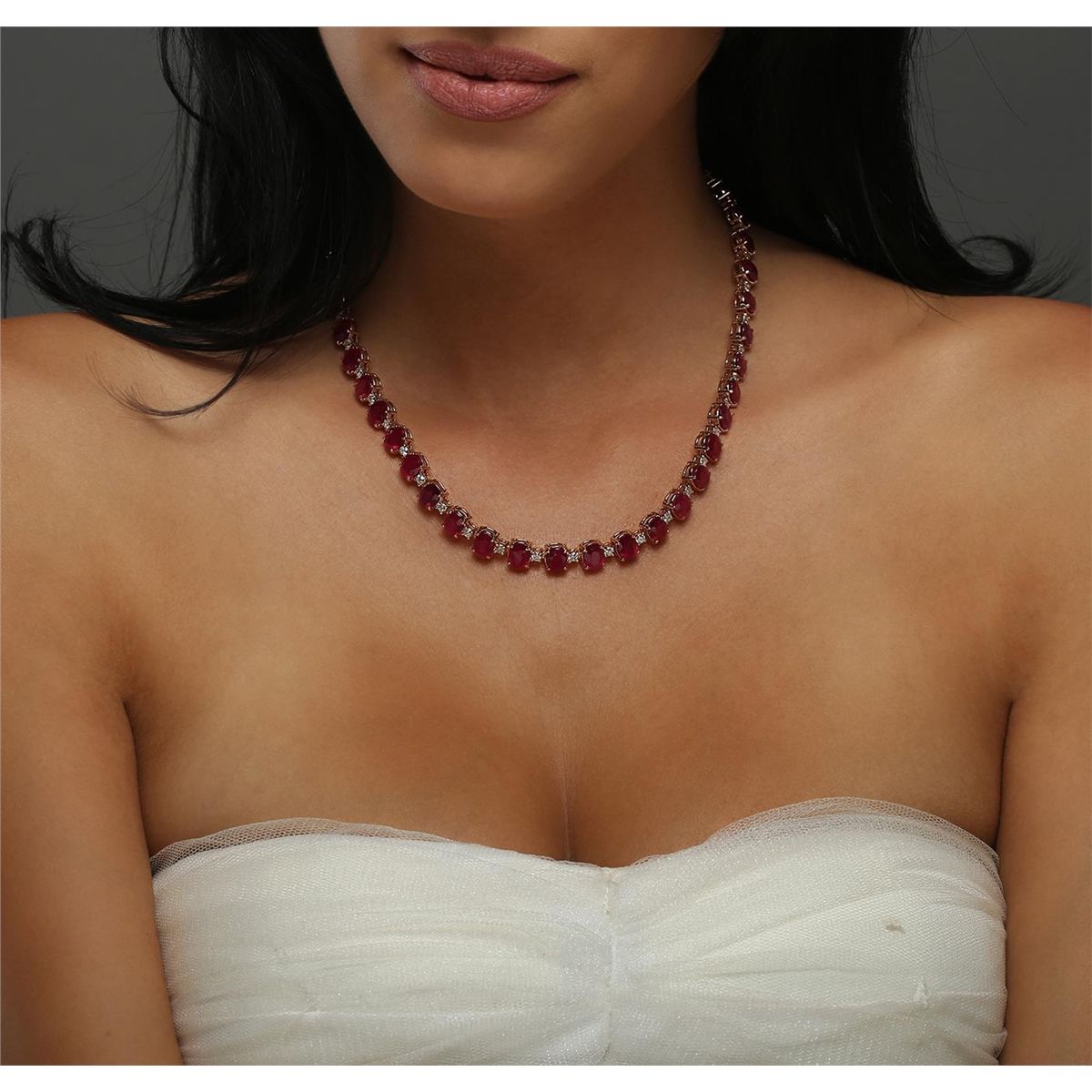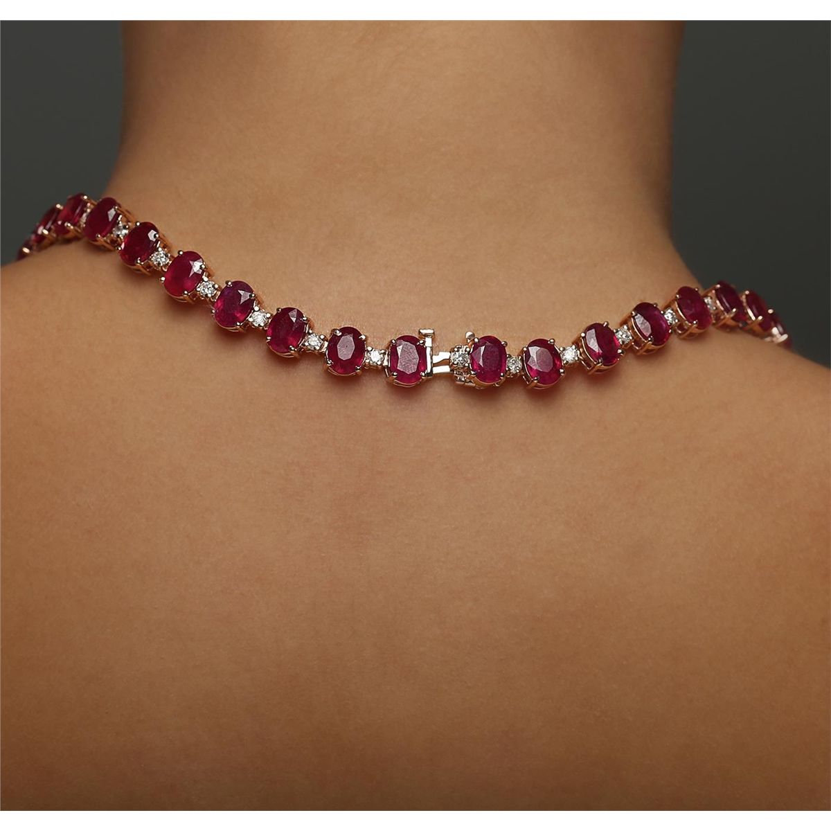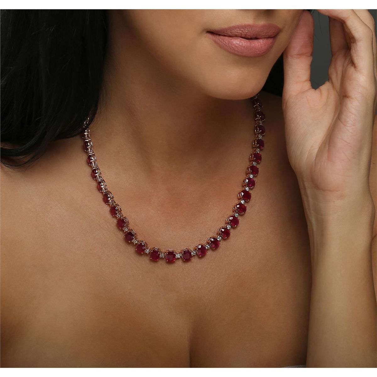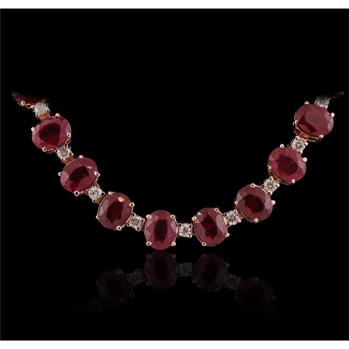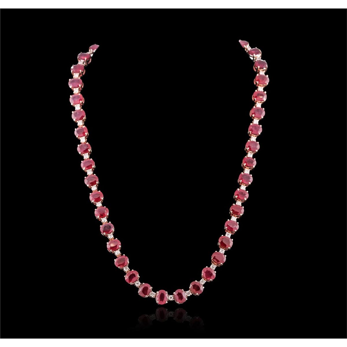 One electronically tested 14KT rose gold ladies combination cast & assembled necklace with a hidden box clasp with a bright polish finish. Measurements: 17.50" in length. Identified with markings of "14K". Condition is new. Containing: Forty-four prong set oval modified brilliant cut natural rubies, measuring 8.00 x 6.00 x 3.50mm, approximate total weight of 69.00ct., clarity is heavily included, medium, moderately strong, strongly purplish red color, (GIA stpR 5/4), cut is good. Forty-Four prong set round brilliant cut diamonds, measuring 2.50 - 2.50 x 1.50mm (depth est.) approximate total weight of 44 Stones = 2.51ct. Clarity: SI-2 to I-2. Color: H - J, Cut is Good. Colored gemstones are presumed to have been subjected to commonly used enhancement processes. All diamonds and colored gemstones are graded in the mounting, unless otherwise stated. Total Weight of Colored Stones 69.00ct. Total Weight of Diamonds 2.51ct. Total Weight of Necklace 48.80 grams. GGL Appraised at $23,315.00.