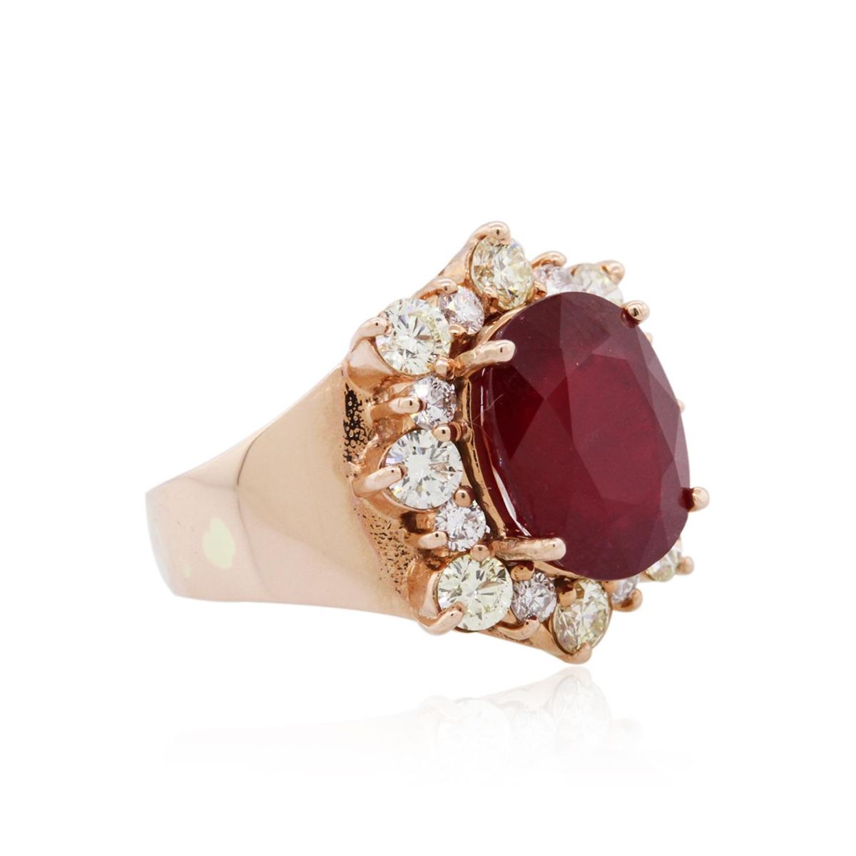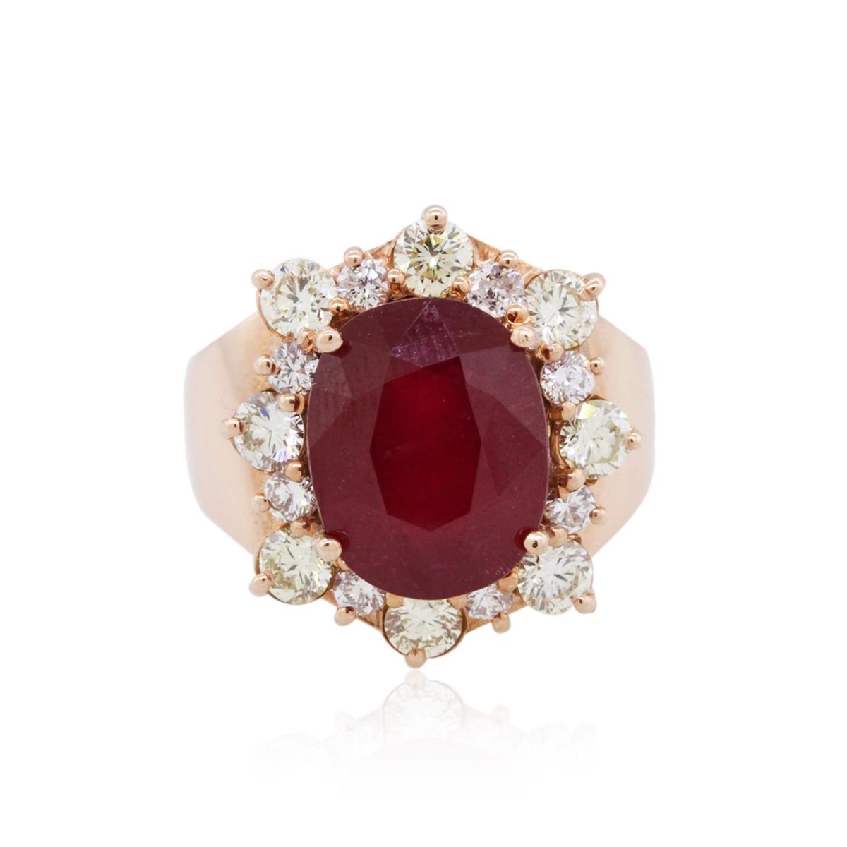 One polished, stamped, and electronically tested solid 14K rose gold ring mounted with: 1 genuine ruby center stone weighing 7.12 carats and 16 genuine round diamonds weighing 1.36 carats. This item weighs 9.9 grams, condition is new, excellent workmanship. AIGL Appraised at $8,065.00.