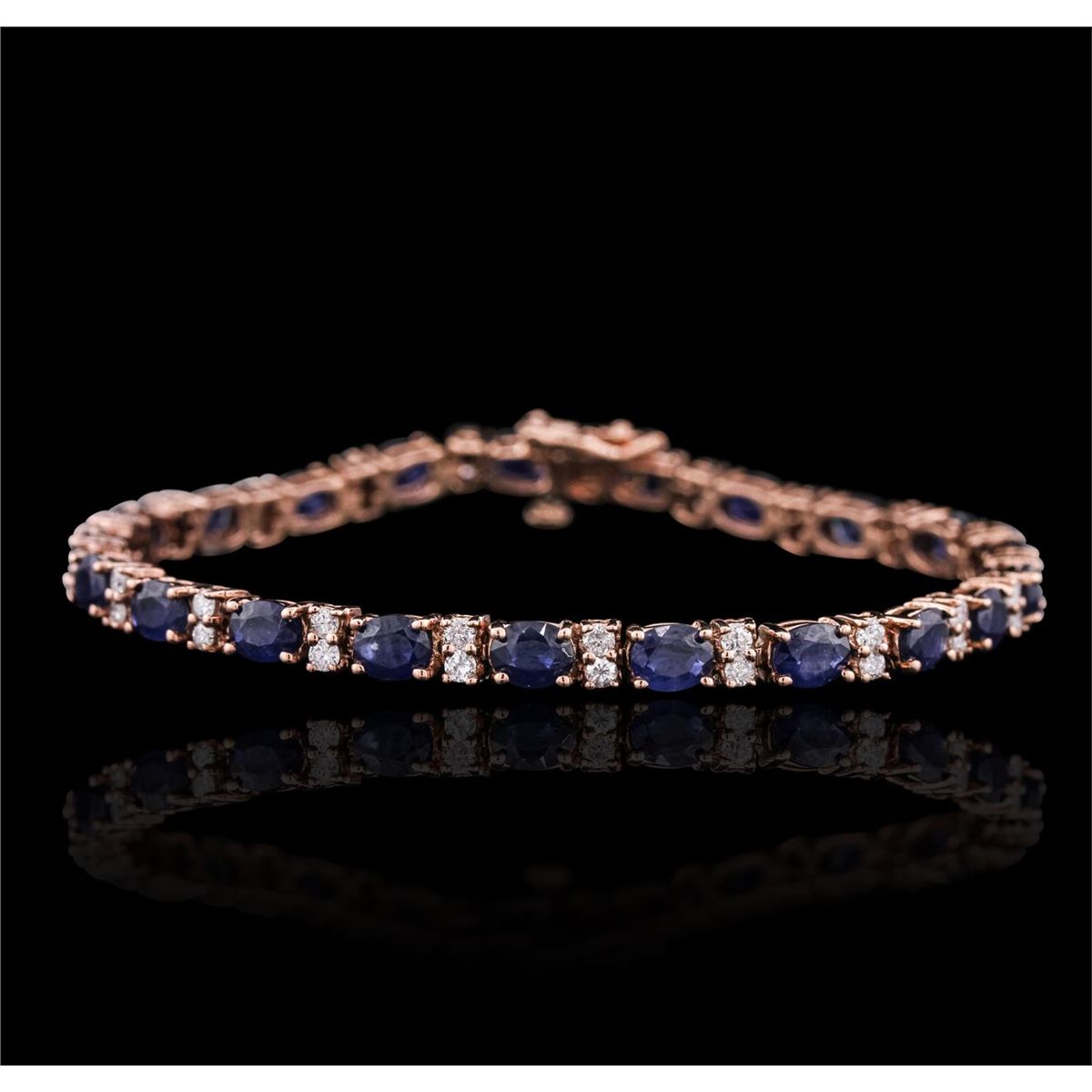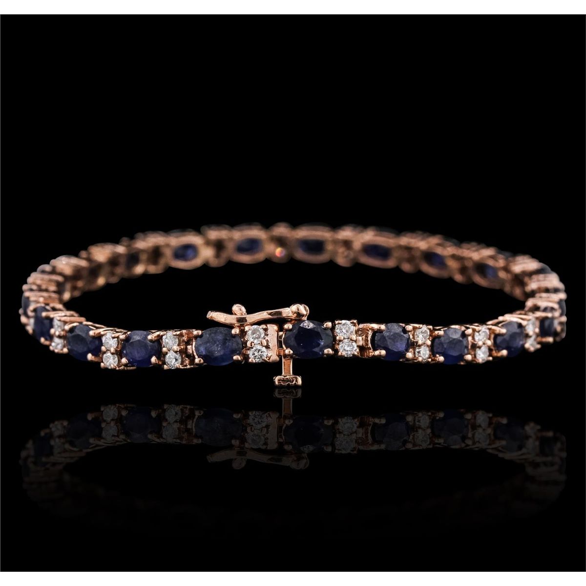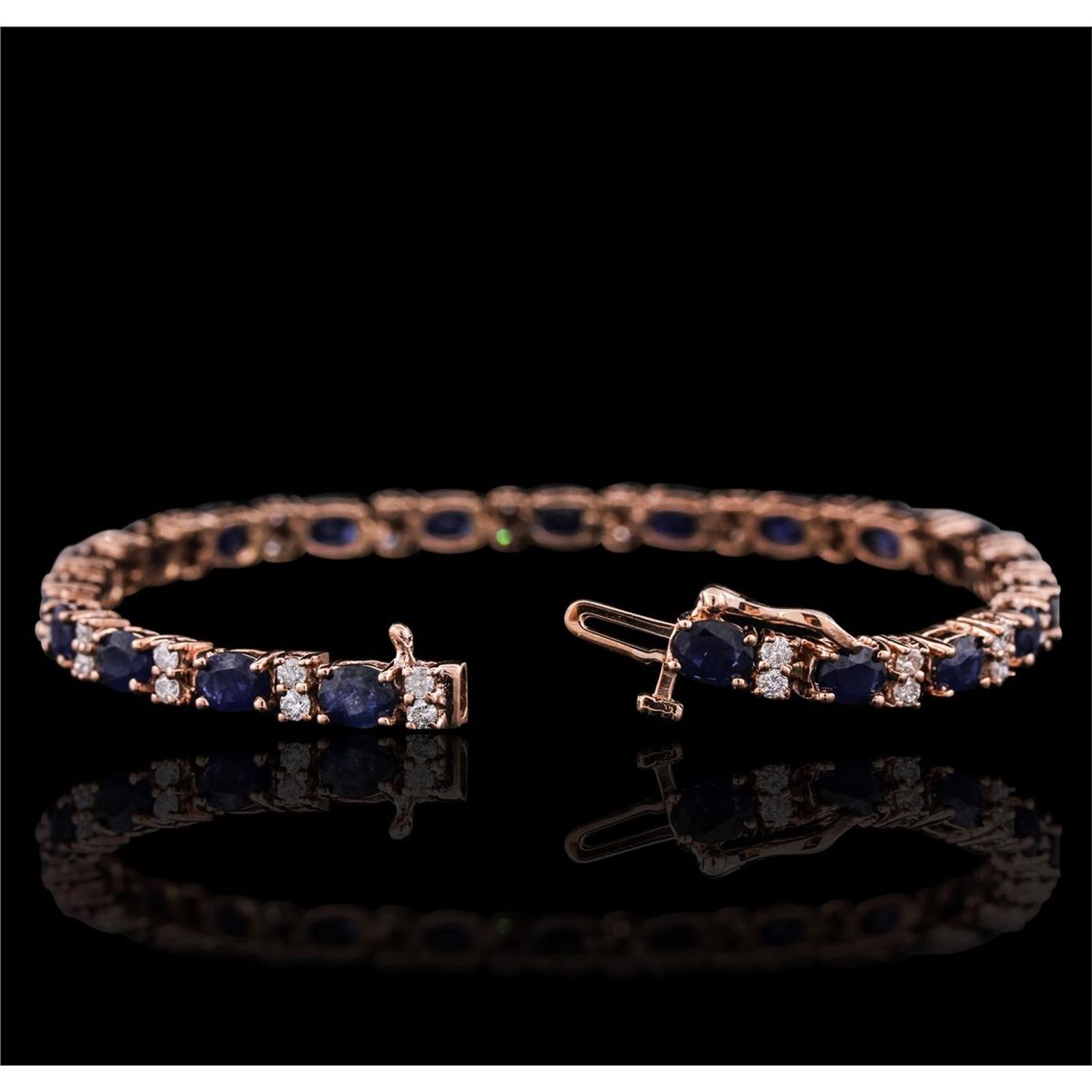 14KT Rose Gold 7.14ctw Sapphire and Diamond Bracelet. One electronically tested 14KT rose gold ladies combination cast & assembled bracelet with a bright polish finish. Measurements: 7" in length. Identified with markings of "14K". Condition is new. Containing: Twenty-one prong set oval modified brilliant cut natural blue sapphires, measuring 5.20 x 3.90 x 2.05mm, approximate total weight of 7.14ct., clarity is heavily included, type II, dark, moderately strong, blue color, (GIA B 7/4), cut is good. Forty-Two prong set round brilliant cut diamonds, measuring 2.00 - 2.00 x 1.20mm (depth est.) approximate total weight of 42 Stones = 1.22ct. Clarity: I-1 to I-2. Color: I - J, Cut is Good. Colored gemstones are presumed to have been subjected to commonly used enhancement processes. All diamonds and colored gemstones are graded in the mounting, unless otherwise stated. Total Weight of Colored Stones 7.14ct. Total Weight of Diamonds 1.22ct. Total Weight of Bracelet 13.10 grams. GGL Appraised at $9,275.00.