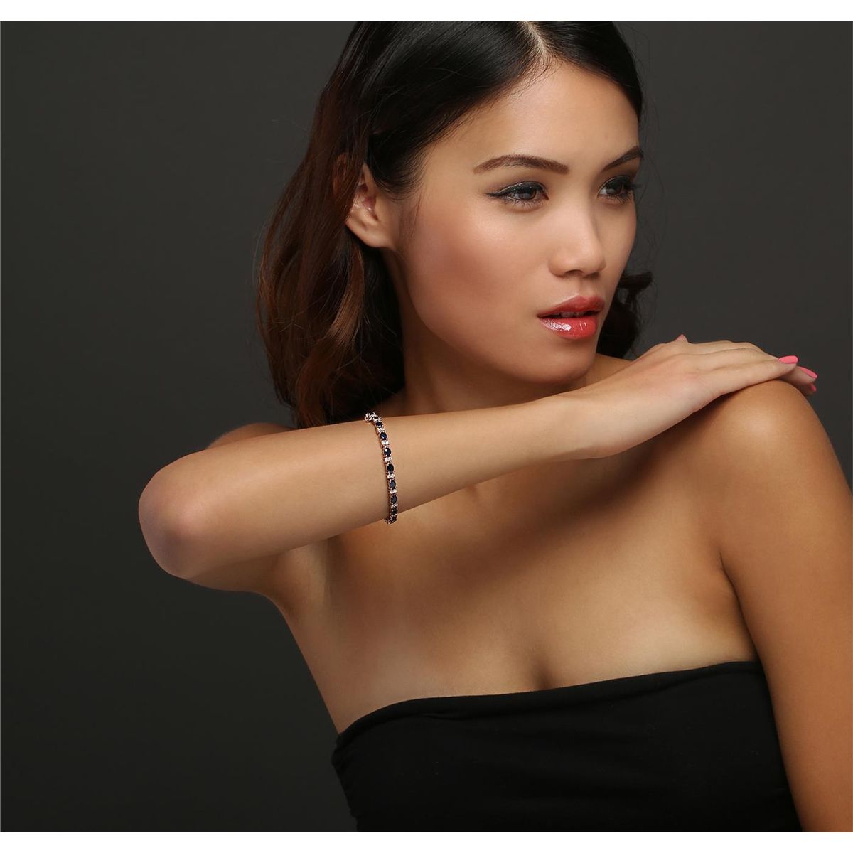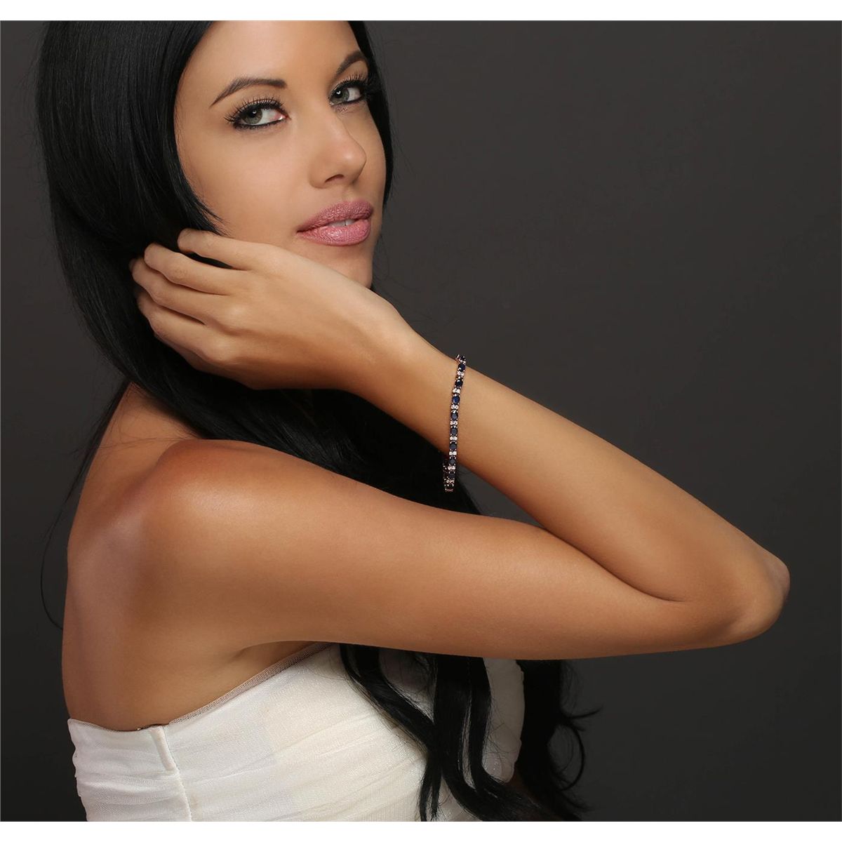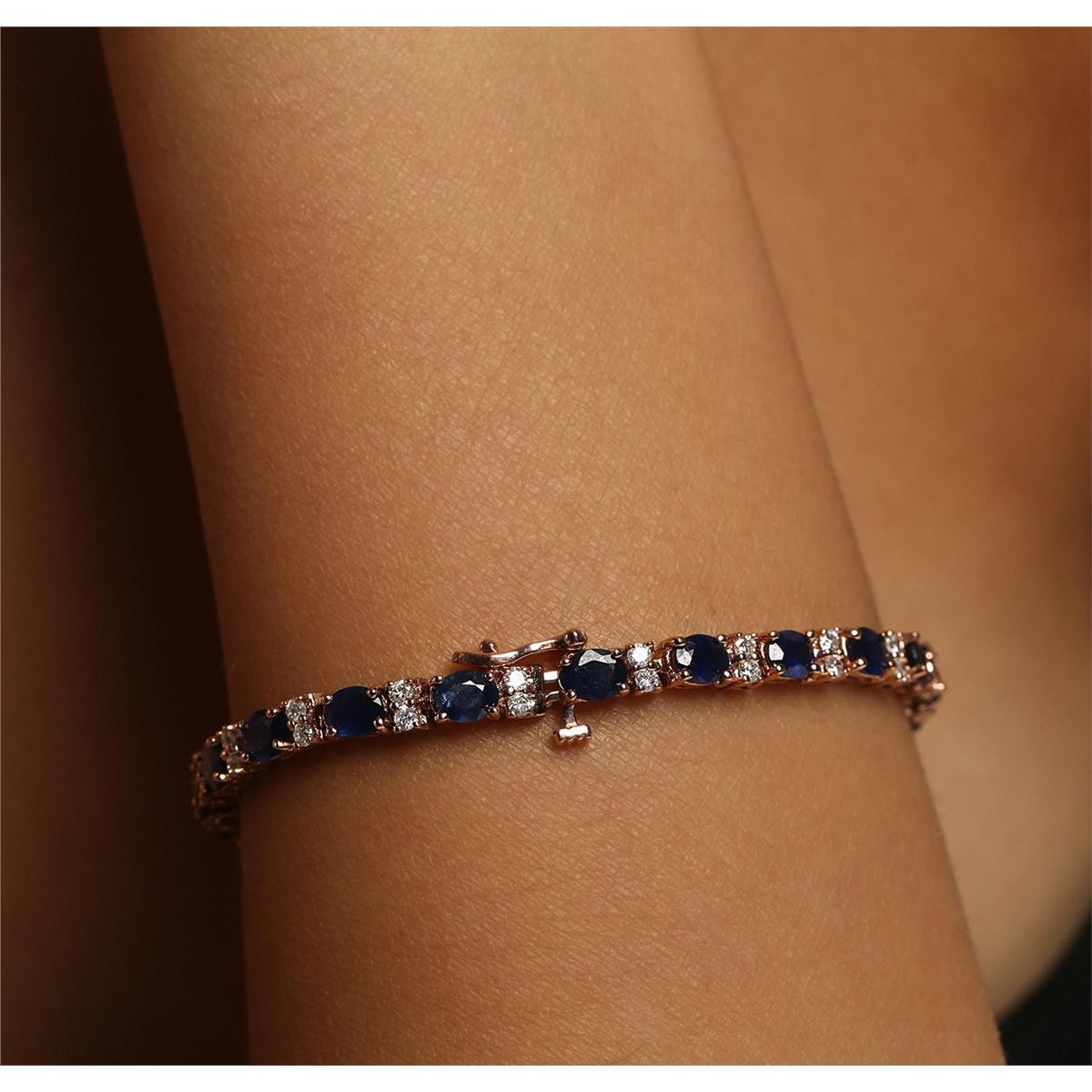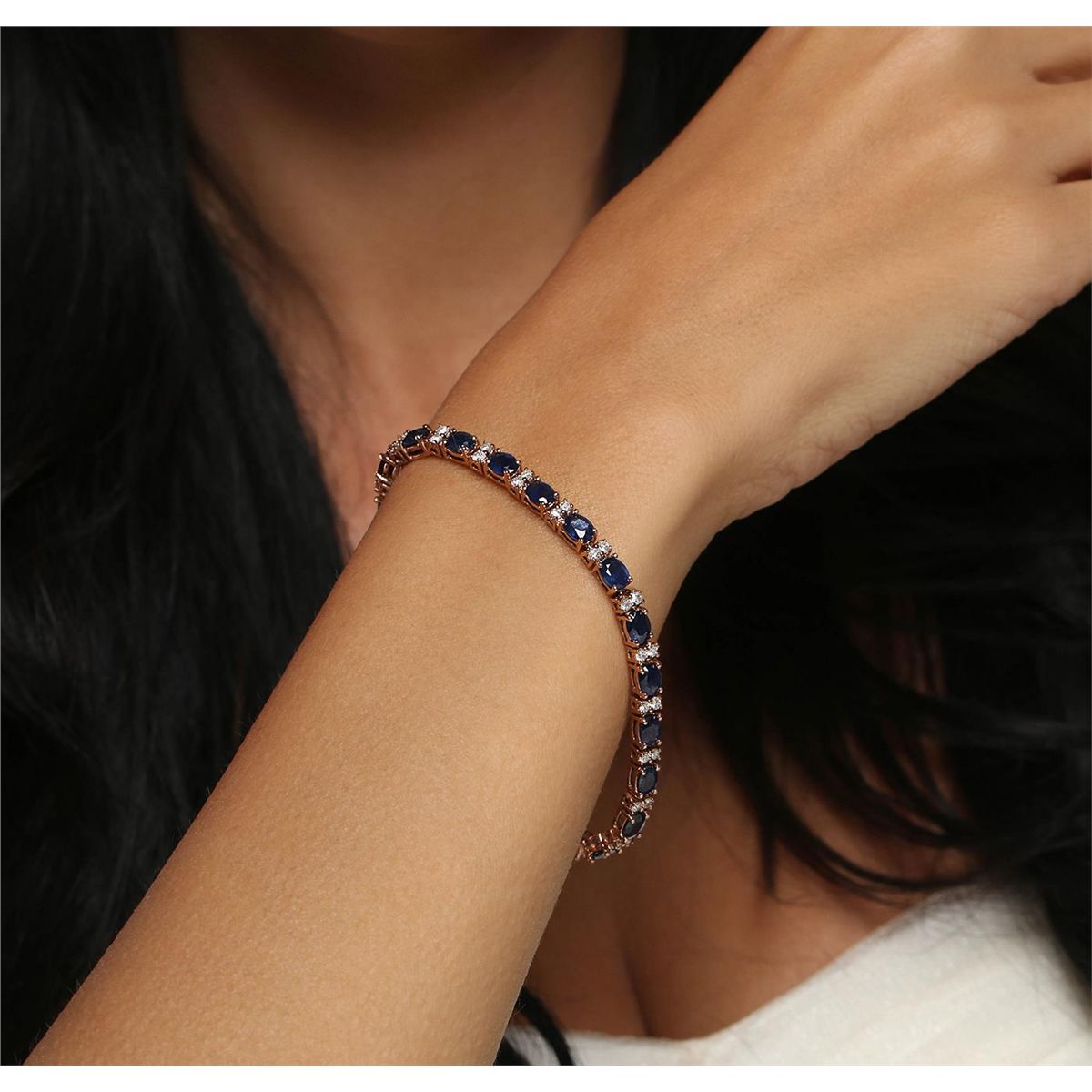 14KT Rose Gold 7.14ctw Sapphire and Diamond Bracelet. One electronically tested 14KT rose gold ladies combination cast & assembled bracelet with a bright polish finish. Measurements: 7" in length. Identified with markings of "14K". Condition is new. Containing: Twenty-one prong set oval modified brilliant cut natural blue sapphires, measuring 5.20 x 3.90 x 2.05mm, approximate total weight of 7.14ct., clarity is heavily included, type II, dark, moderately strong, blue color, (GIA B 7/4), cut is good. Forty-Two prong set round brilliant cut diamonds, measuring 2.00 - 2.00 x 1.20mm (depth est.) approximate total weight of 42 Stones = 1.22ct. Clarity: I-1 to I-2. Color: I - J, Cut is Good. Colored gemstones are presumed to have been subjected to commonly used enhancement processes. All diamonds and colored gemstones are graded in the mounting, unless otherwise stated. Total Weight of Colored Stones 7.14ct. Total Weight of Diamonds 1.22ct. Total Weight of Bracelet 13.10 grams. GGL Appraised at $9,275.00.