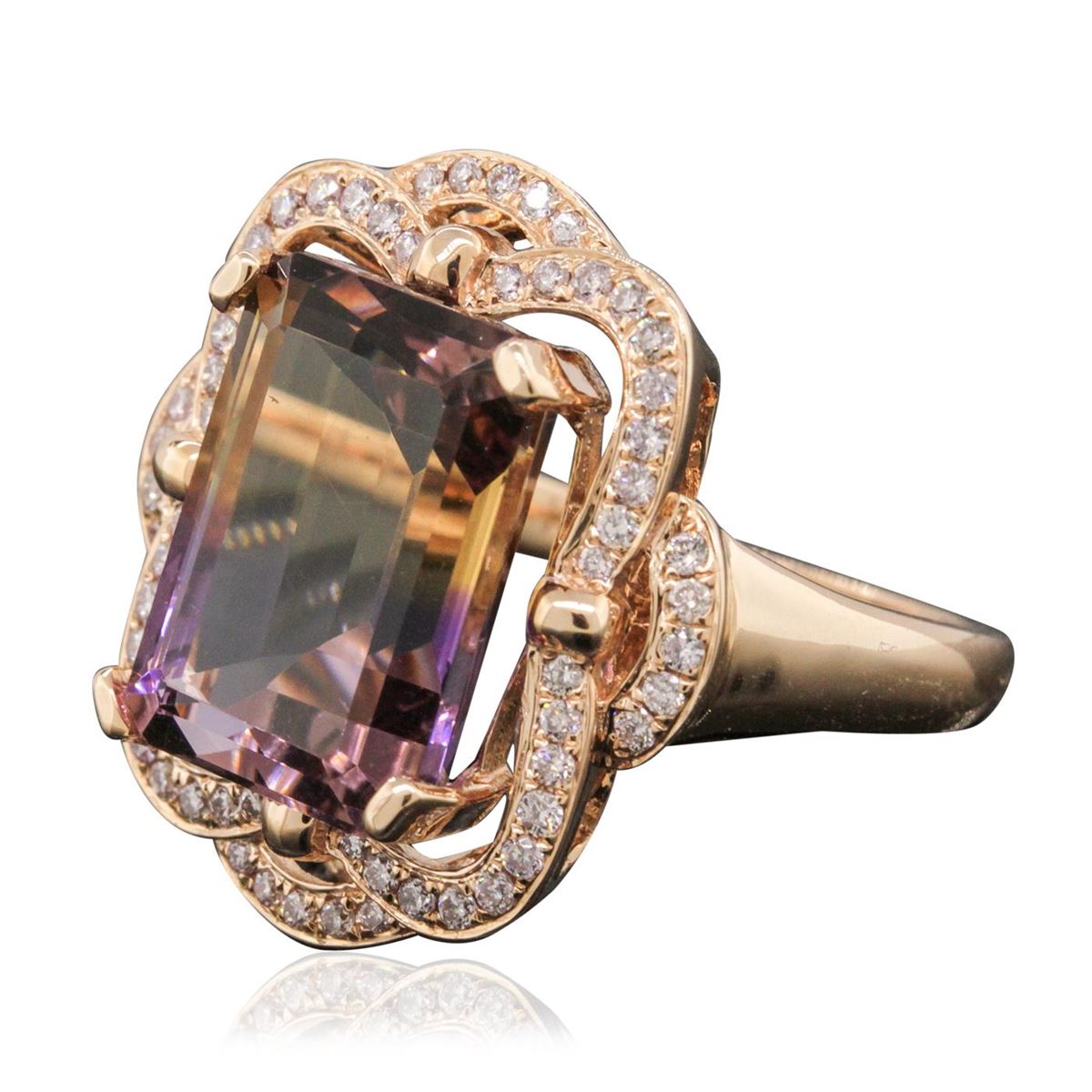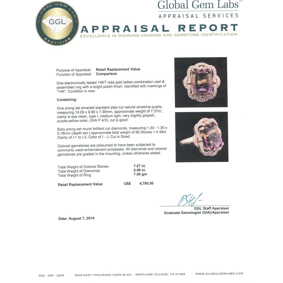 One electronically tested 14KT rose gold ladies combination cast & assembled ring with a bright polish finish. Identified with markings of "14K". Condition is new. Containing: One prong set emerald standard step cut natural ametrine quartz, measuring 14.00 x 9.90 x 7.30mm, approximate weight of 7.27ct., clarity is eye clean, type I, medium light, very slightly grayish, purple - yellow color, (GIA P 4/3), cut is good. Sixty prong set round brilliant cut diamonds, measuring 1.30 - 1.30 x 0.78mm (depth est.) approximate total weight of 60 Stones = 0.48ct. Clarity: I-1 to I-2. Color: I - J, Cut is Good. Colored gemstones are presumed to have been subjected to commonly used enhancement processes. All diamonds and colored gemstones are graded in the mounting, unless otherwise stated. Total Weight of Colored Stones 7.27ct. Total Weight of Diamonds 0.48ct. Total Weight of Ring 7.90 grams. GGL Appraised at $4,780.00.