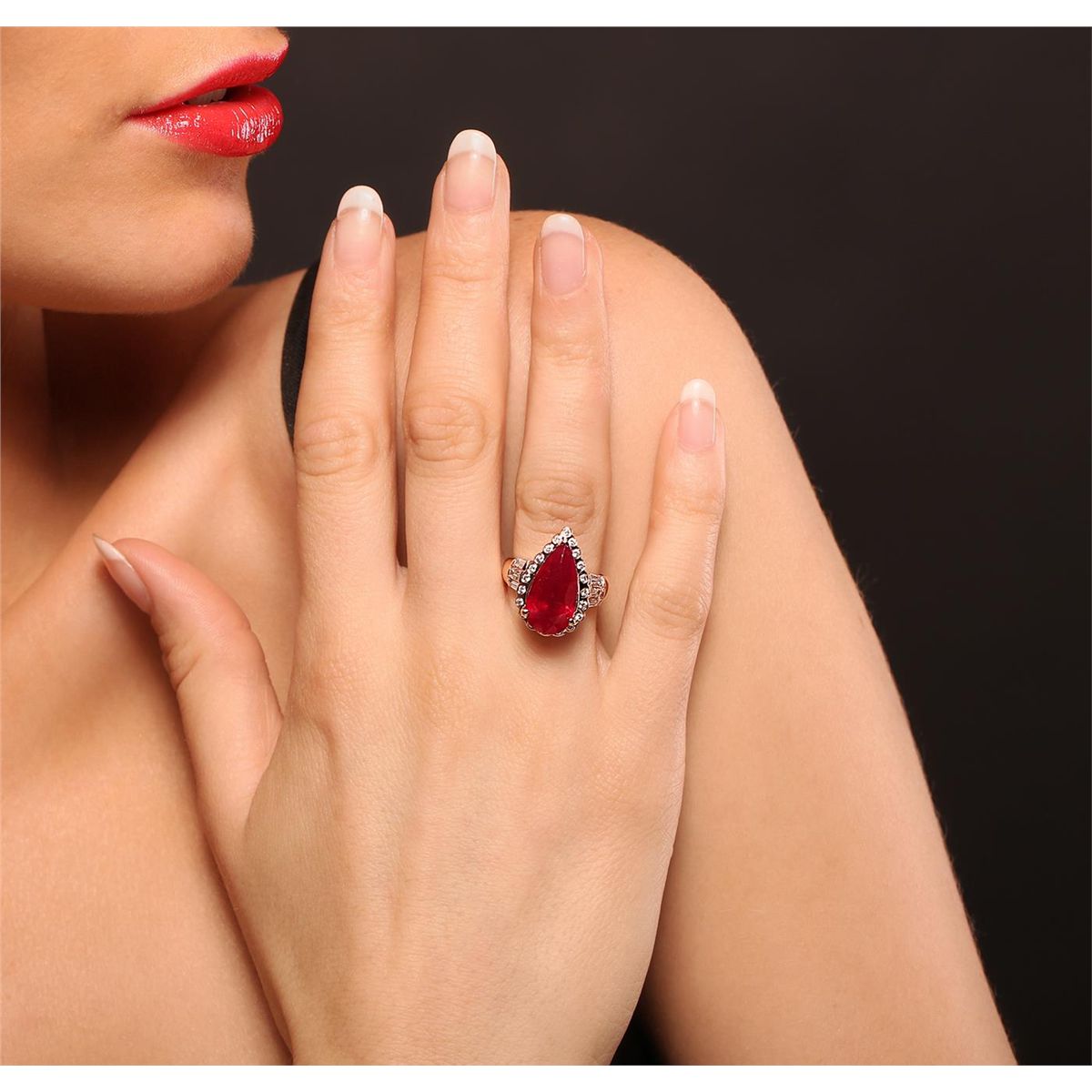 One electronically tested 14KT rose gold Ladies combination cast & assembled fancy ring with a high polish finish. Condition is new. Identified with markings of "14K". Containing: One prong set pear modified brilliant cut natural ruby, measuring 16.00 x 9.00 x 6.80mm, approximate weight of 7.83ct., clarity is heavily included, type II, medium dark, moderately strong, strongly purplish red color, (GIA stpR 6/4), cut is good. Indications of heat treatment with glass and flux residue. Colored gemstones are presumed to have been subjected to commonly used and possible undetectable color/clarity enhancement processes. Nineteen bezel set round brilliant cut diamonds, measuring 1.50 - 1.50 x 0.90mm (depth est.) approximate total weight of 19 Stones = 0.23ct. Clarity of SI-1 to SI-2, Color of I - J, Cut is Good. Six channel set baguette cut (tapered) diamonds, measuring 3.00 x 1.30 x 1.11mm (depth est.) approximate total weight of 6 Stones = 0.24ct. Clarity of VS-2, Color of H - I, Cut is Good. Total Weight of Colored Stones 7.83ct. Total Weight of Diamonds 0.47ct. Total Weight of Ring 7.80gm. GGL Appraised at $6,010.00.