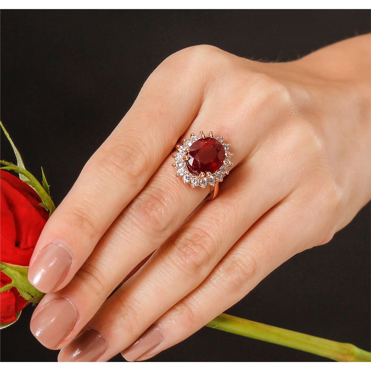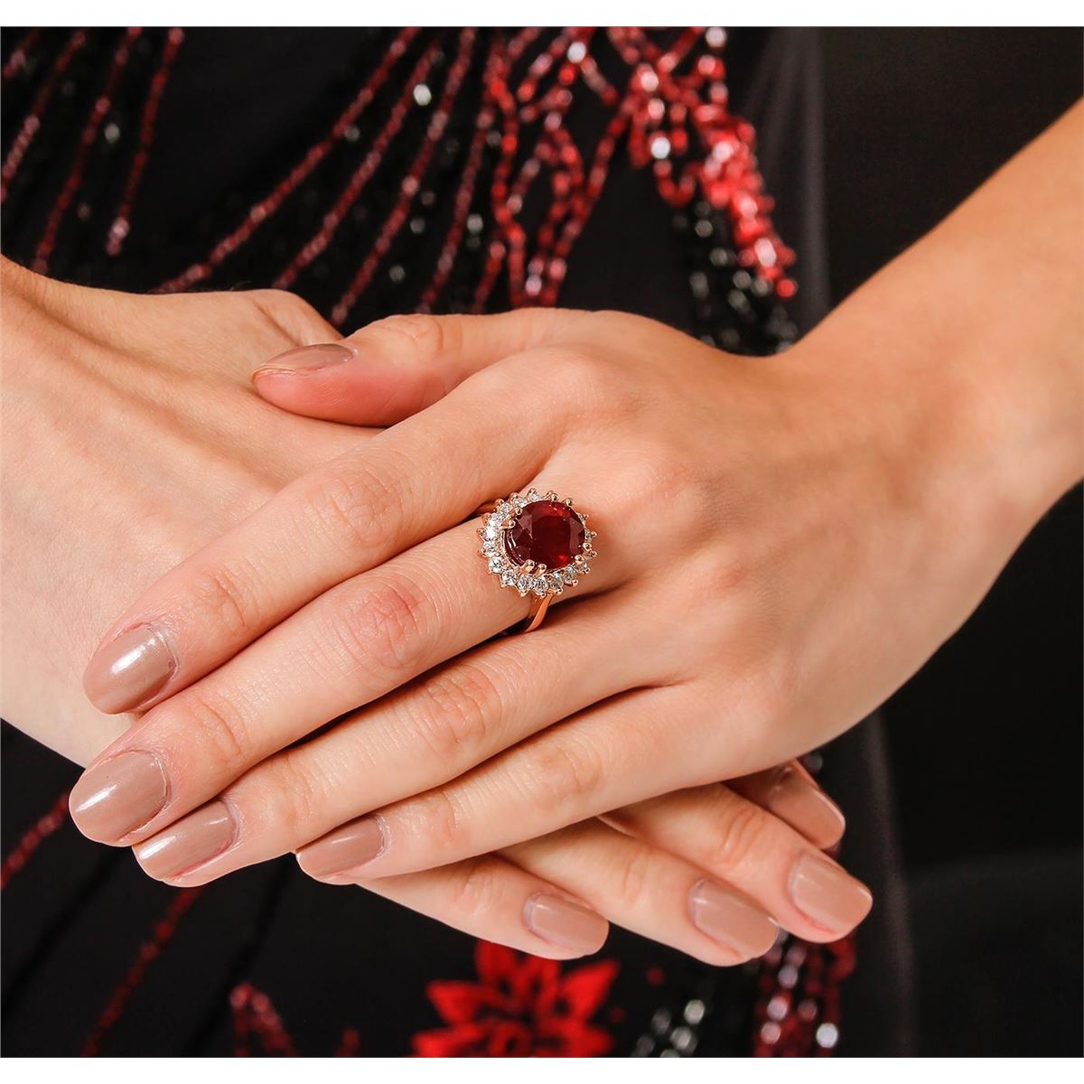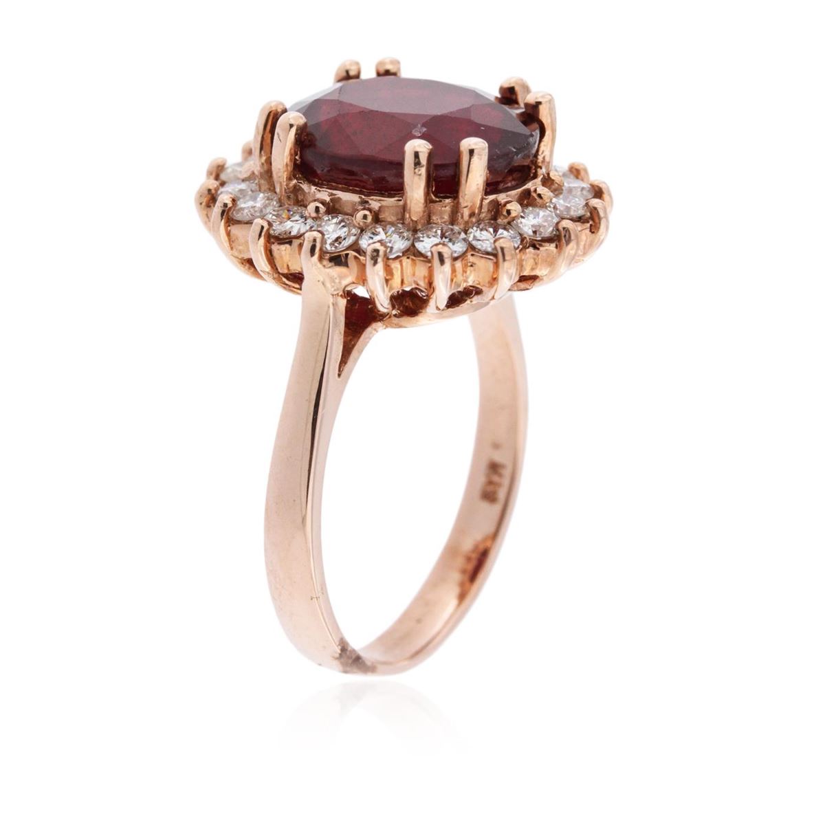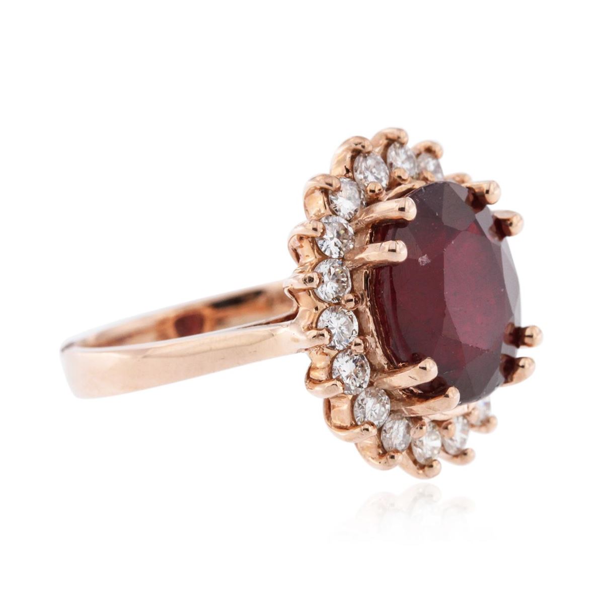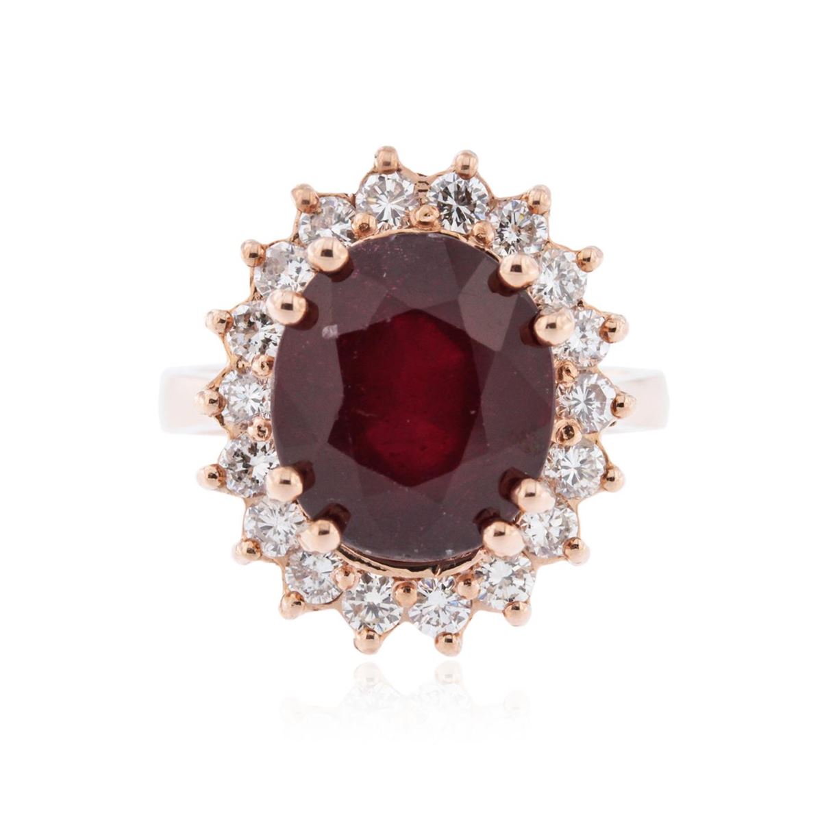 One electronically tested 14KT rose gold ladies cast ruby and diamond ring with a bright polish finish. Condition is new, good workmanship. The featured ruby is set within a diamond bezel, completed by a two and one-half millimeter wide band. Identified with markings of "K14". Containing: One prong set oval mixed cut natural ruby, measuring 11.75 x 10.20 x 7.45mm, approximate weight of 7.94ct., clarity is heavily included, type II, dark, strong, slightly purplish red color, (GIA slpR 7/5), cut is good. Transmitting light somewhat diffusely, transparent to translucent. Naturally occurring internal & external characteristics are present. Indications of laboratory high temperature heat treatment, with glass & flux additives. Colored Stone Grading Report attached. Graded in the setting. Ruby has a low tolerance to rhodium plating, repolishing the surface, & ultrasonic cleaning. Eighteen prong set round brilliant cut diamonds, measuring 2.40 - 2.40 x 1.44mm (depth est.) approximate total weight of 18 Stones = 0.90ct. Graded in the setting. Clarity VS-2 to SI-1. Color F - H. Total Weight of Colored Stones 7.94ct. Total Weight of Diamonds 0.90ct. Total Weight of Ring 7.50gm. AIG Appraised at $6,885.00.
