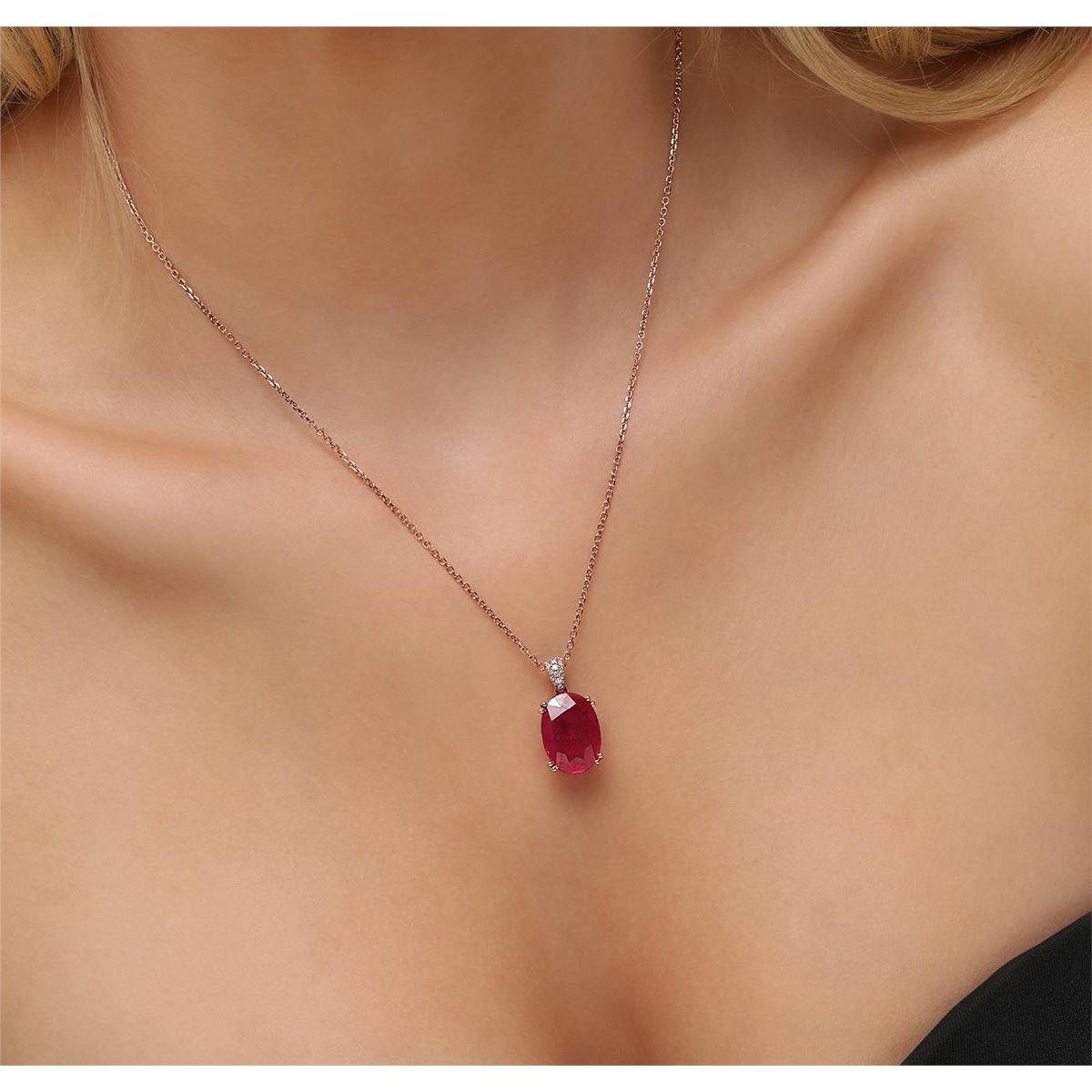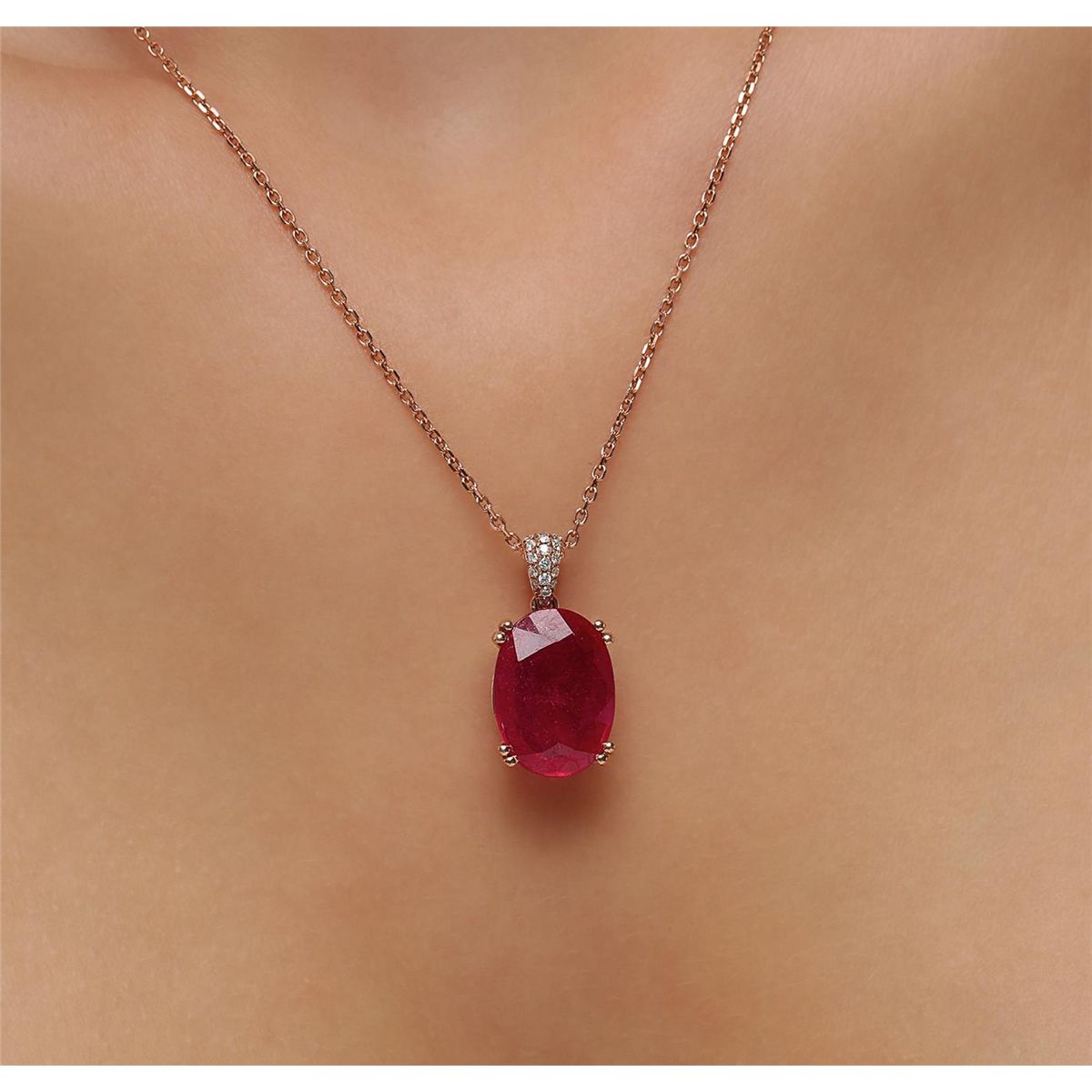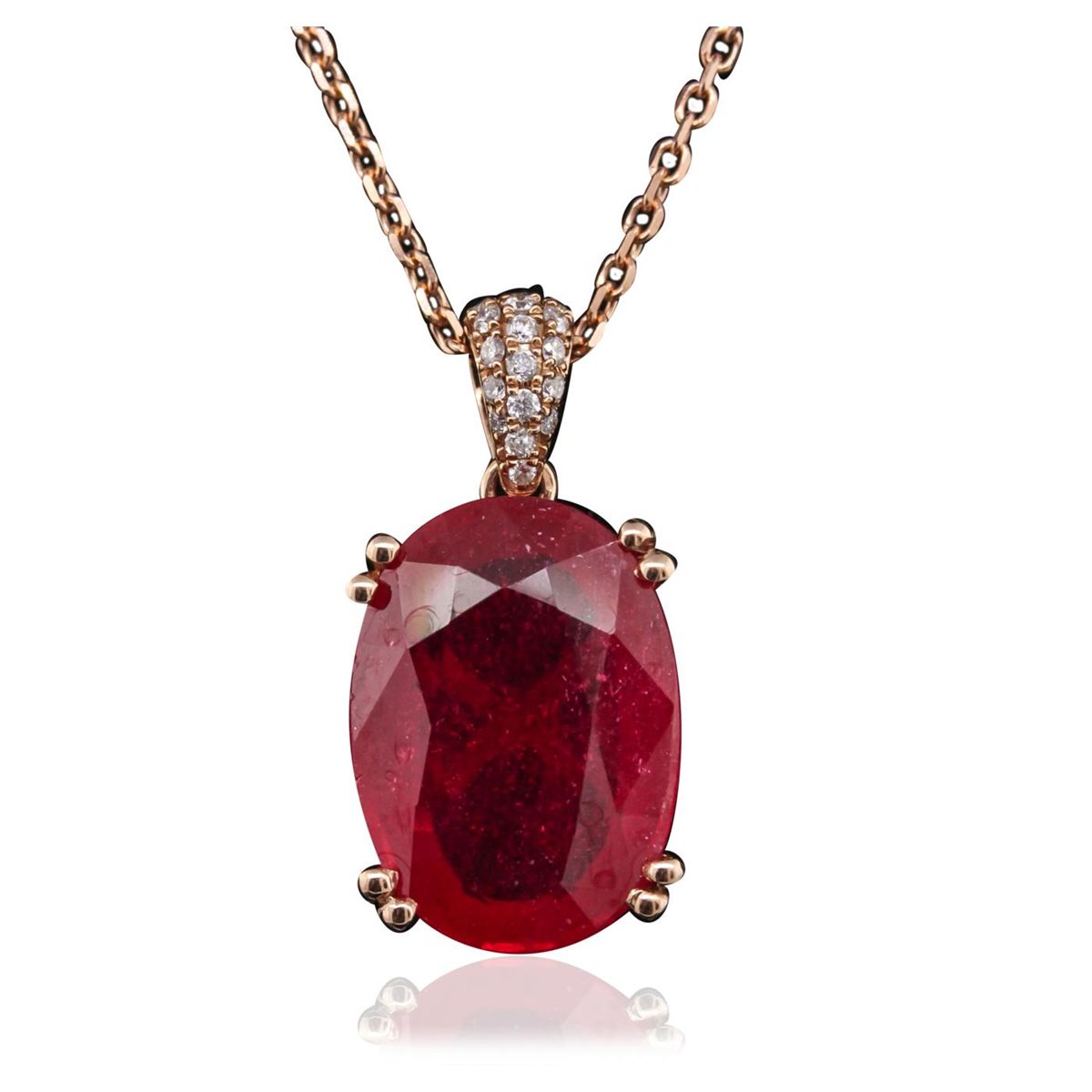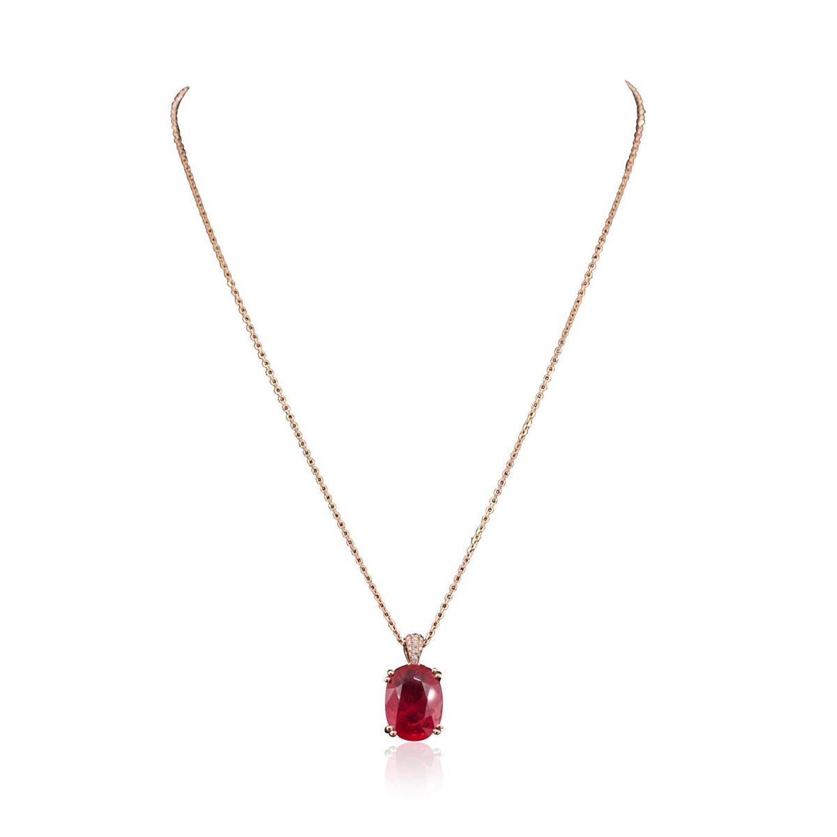 One electronically tested 14KT rose gold ladies cast & assembled ruby and diamond pendant with chain. Condition is new, good workmanship. The pendant features a ruby set within a lattice basket, completed by a diamond set bail. The pendant is supported by an eighteen inch length 14KT rose gold designer style chain, terminating in a lobster claw clasp. Bright polish finish. Identified with markings of "14K". Containing: One prong set oval mixed cut natural ruby, measuring 16.00 x 10.50 x 5.10mm, 12%. bulge factor, approximate weight of 8.12ct., clarity is heavily included, type II, medium dark, very slightly brownish, slightly purplish red color, (GIA slpR 6/3), cut is good. Transmitting light somewhat diffusely, transparent to translucent. Naturally occurring internal & external characteristics are present. Indications of laboratory high temperature heat treatment, with glass & flux additives. Graded in the setting. Ruby has a low tolerance to rhodium plating, repolishing the surface, & ultrasonic cleaning. Seventeen bead set round brilliant cut diamonds, measuring 1.20 - 1.00 x 0.66mm (depth est.) approximate. Total Weight of 17 Stones = 0.18ct. Graded in the setting. Clarity: SI-1 to I-1. Color: G - I. Total Weight of Colored Stones 8.12ct. Total Weight of Diamonds 0.18ct. Total Weight of Pendant With Chain 6.78 grams. AIG Appraised at $3,270.00.