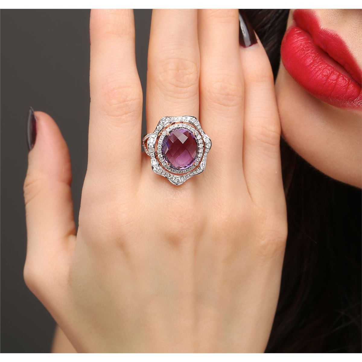 One ring featuring: 14KT rose gold weighing 6.00 grams containing one amethyst center stone with a total weight of 8.25ct and 98 round diamonds with a total weight of 0.90ct.