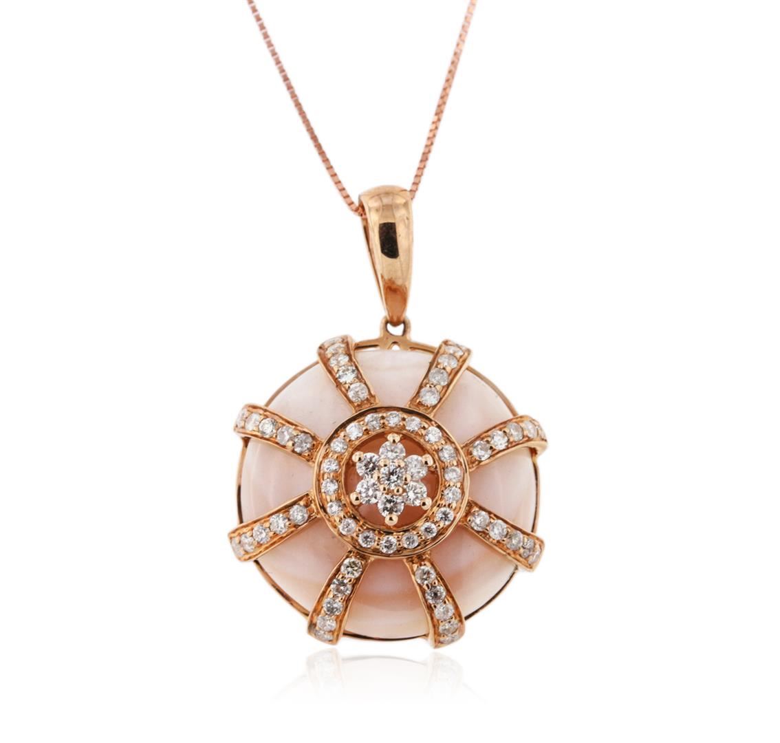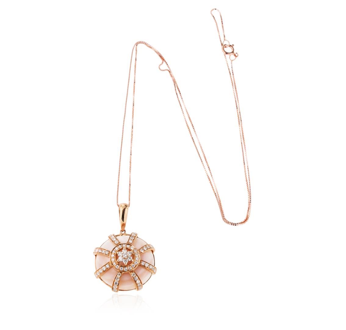 One pendant with chain featuring: 14KT rose gold weighing 2.15 grams containing one mother of pearl with a total weight of 8.39ct and 65 round diamonds with a total weight of 0.56ct.