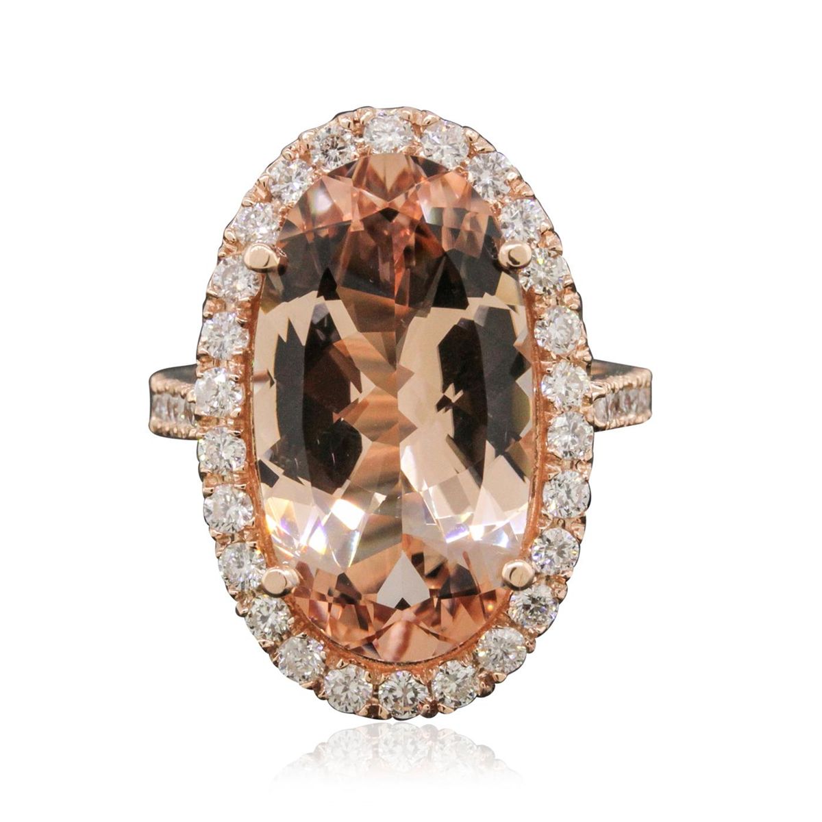 One electronically tested 14KT rose gold ladies combination cast & assembled ring with a bright polish finish. Condition is new. Identified with markings of "K14". Containing: One prong set oval modified brilliant cut natural morganite, measuring 20.14 x 11.18 x 6.61mm, approximate weight of 8.82ct., clarity is eye clean, type I, light, brownish, reddish orange color, (GIA rO 3/1), cut is good. Forty prong set round brilliant cut diamonds, measuring 2.00 - 1.50 x 1.05mm (depth est.) approximate. Total Weight of 40 Stones = 0.78ct. Clarity: SI-2 to I-1. Color: J - K, Cut is Good. Colored gemstones are presumed to have been subjected to commonly used enhancement processes. All diamonds and colored gemstones are graded in the mounting, unless otherwise stated. Total Weight of Colored Stones 8.82ct. Total Weight of Diamonds 0.78ct. Total Weight of Ring 8.10 grams. GGL Appraised at $9,310.00.