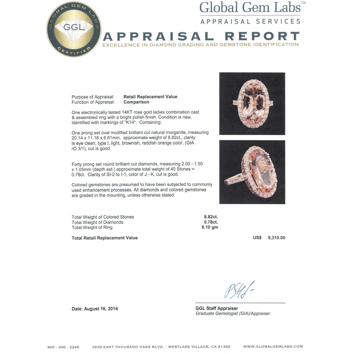 One electronically tested 14KT rose gold ladies combination cast & assembled ring with a bright polish finish. Condition is new. Identified with markings of "K14".  Containing: One prong set oval modified brilliant cut natural morganite, measuring 20.14 x 11.18 x 6.61mm, approximate weight of 8.82ct., clarity is eye clean, type I, light, brownish, reddish orange color, (GIA rO 3/1), cut is good. Forty prong set round brilliant cut diamonds, measuring 2.00 - 1.50 x 1.05mm (depth est.) approximate. Total Weight of 40 Stones = 0.78ct. Clarity: SI-2 to I-1. Color: J - K, Cut is Good. Colored gemstones are presumed to have been subjected to commonly used enhancement processes. All diamonds and colored gemstones are graded in the mounting, unless otherwise stated. Total Weight of Colored Stones 8.82ct. Total Weight of Diamonds 0.78ct. Total Weight of Ring 8.10 grams. GGL Appraised at $9,310.00.