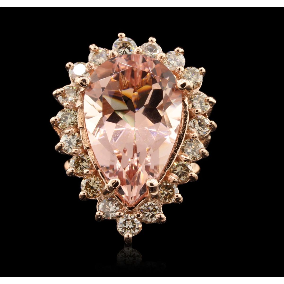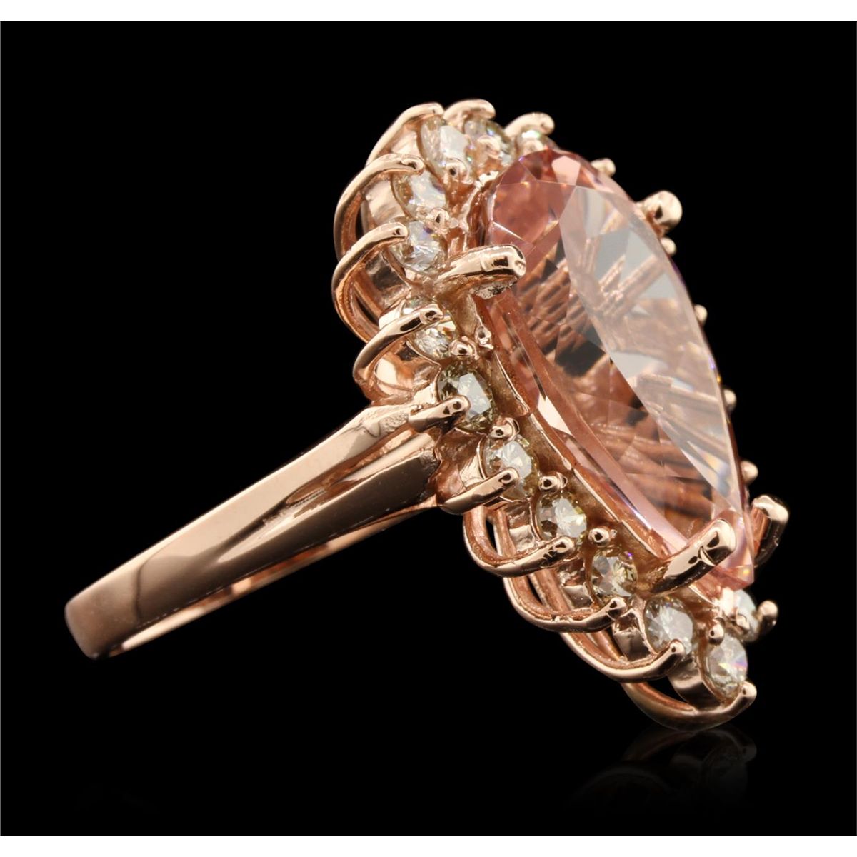 14KT rose gold 8.85ct Morganite and Diamond Ring A6603. One electronically tested 14KT rose gold ladies cast morganite and diamond ring with a bright polish finish. The featured morganite is set within a diamond bezel supported by split shoulders, completed by a two and one-half millimeter wide band. Identified with markings of "14K". Condition is new, good workmanship. Containing: One prong set pear mixed cut natural morganite, measuring 18.20 x 11.60 x 7.70mm, approximate weight of 8.85ct., clarity is eye clean, type I, light, moderately strong, red color, (GIA R 3/4), cut is good. Transmitting light with no distortion, transparent. Colored Stone Grading Report attached. Graded in the setting.Eighteen prong set round brilliant cut diamonds, measuring 2.90 - 2.80 x 1.71mm (depth est.) approximate. Total Weight of 18 Stones = 1.58ct. Color grade is an average for the group. Graded in the setting. Clarity: VS-2 to SI-1. Total Weight of Colored Stones 8.85ct. Total Weight of Diamonds 1.58ct. AIG Appraised at $10,660.00.
