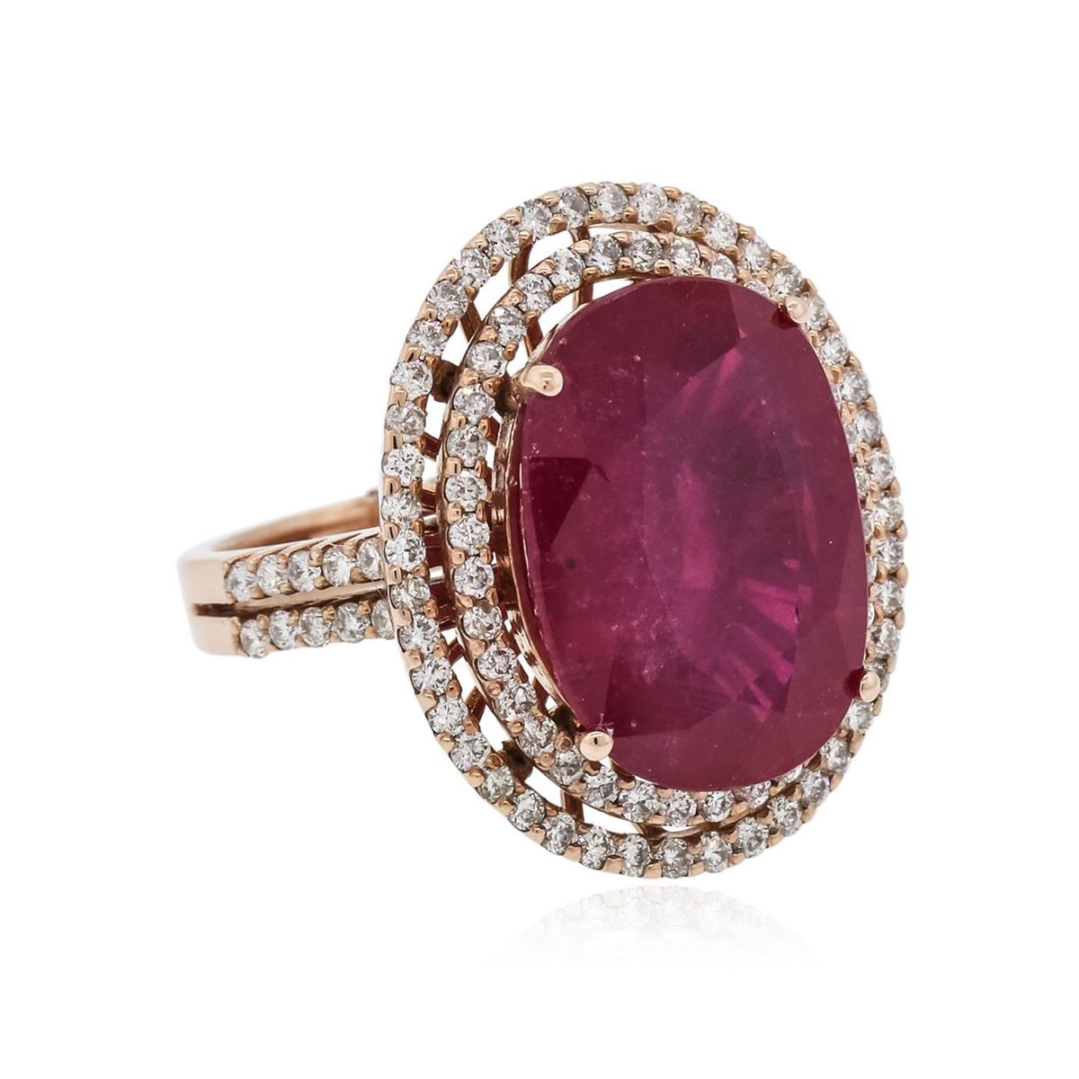One electronically tested 14KT rose gold ladies cast & assembled ruby and diamond ring with a bright polish finish. Condition is new, good workmanship. The featured ruby is set within two tiered diamond bezels supported by diamond set split shoulders, completed by a three millimeter wide band. Identified with markings of "K14". Containing: One prong set oval mixed cut natural ruby, measuring 16.45 x 10.25 x 5.70mm, 10% bulge factor, approximate weight of 9.04ct., clarity is heavily included, type II, medium dark, very slightly brownish, red color, (GIA R 6/3), cut is good. Transmitting light somewhat diffusely, transparent to translucent. Naturally occurring internal & external characteristics are present. Indications of laboratory high temperature heat treatment, with glass & flux additives. Graded in the setting. Ruby has a low tolerance to rhodium plating, repolishing the surface, & ultrasonic cleaning. One Hundred Ten prong set round brilliant cut diamonds, measuring 1.50 - 1.40 x 0.87mm (depth est.) approximate total weight of 110 Stones = 1.32ct. Graded in the setting. Clarity: SI-1 to I-1. Color: H - J. Total Weight of Colored Stones 9.04ct. Total Weight of Diamonds 1.32ct. Total Weight of Ring 9.40 grams. AIG Appraised at $7,410.00.