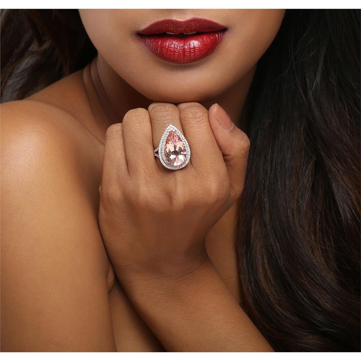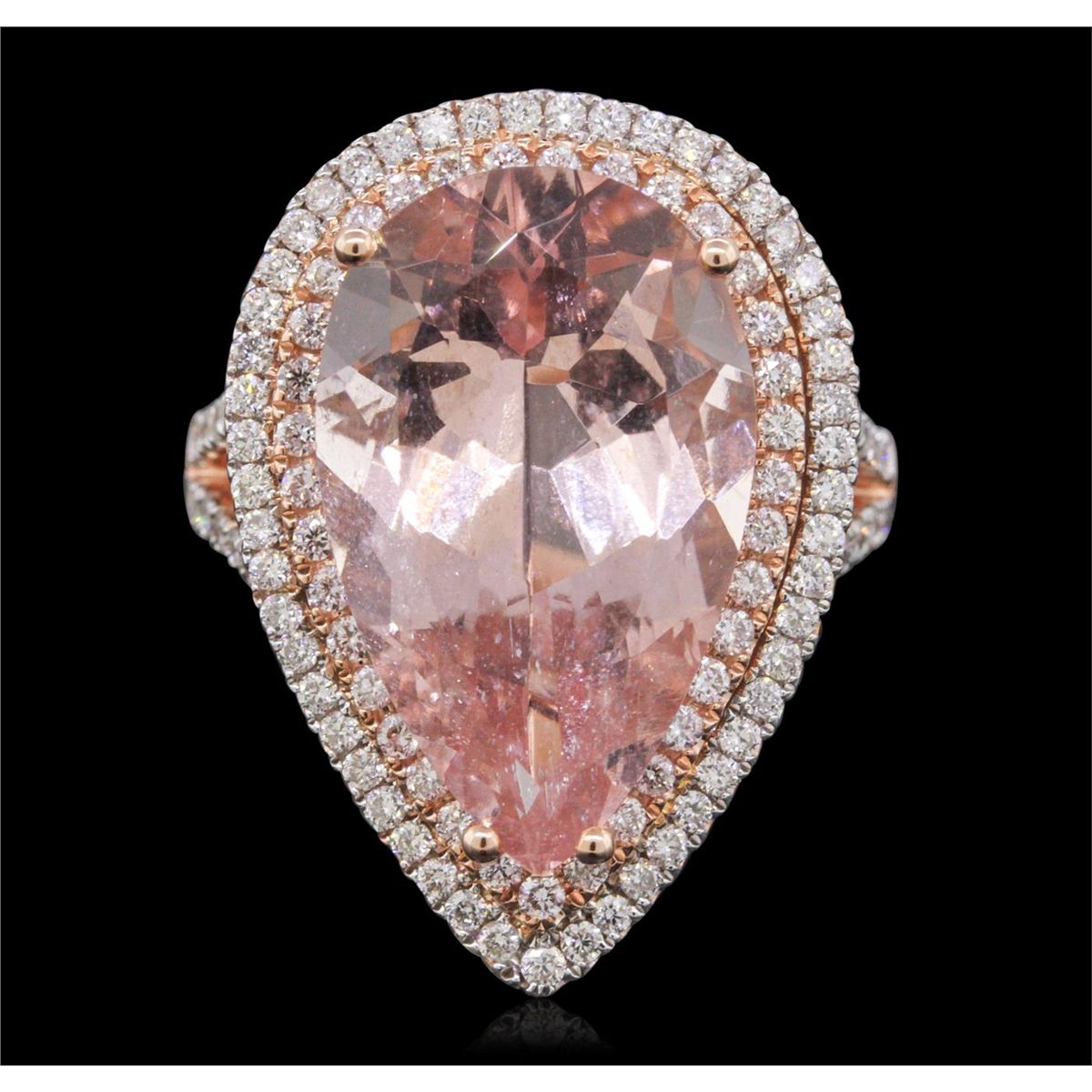 One electronically tested 14KT rose gold ladies combination cast & assembled ring with a split shoulder shank with a bright polish finish. Identified with markings of "14K". Condition is new. Containing: One prong set pear modified brilliant cut natural morganite, measuring 18.94 x 11.76 x 7.77mm, approximate weight of 9.41ct., clarity is eye clean, type I, light, slightly brownish, reddish orange color, (GIA rO 3/2), cut is good. One Hundred Thirteen prong set round brilliant cut diamonds, measuring 1.10 - 1.10 x 0.66mm (depth est.) approximate total weight of 113 Stones = 0.54ct. Clarity: SI-2 to I-2. Color: I - J, Cut is Good. Colored gemstones are presumed to have been subjected to commonly used enhancement processes. All diamonds and colored gemstones are graded in the mounting, unless otherwise stated. Total Weight of Colored Stones 9.41ct. Total Weight of Diamonds 0.54ct. Total Weight of Ring 6.60 grams. GGL Appraised at $9,125.00.