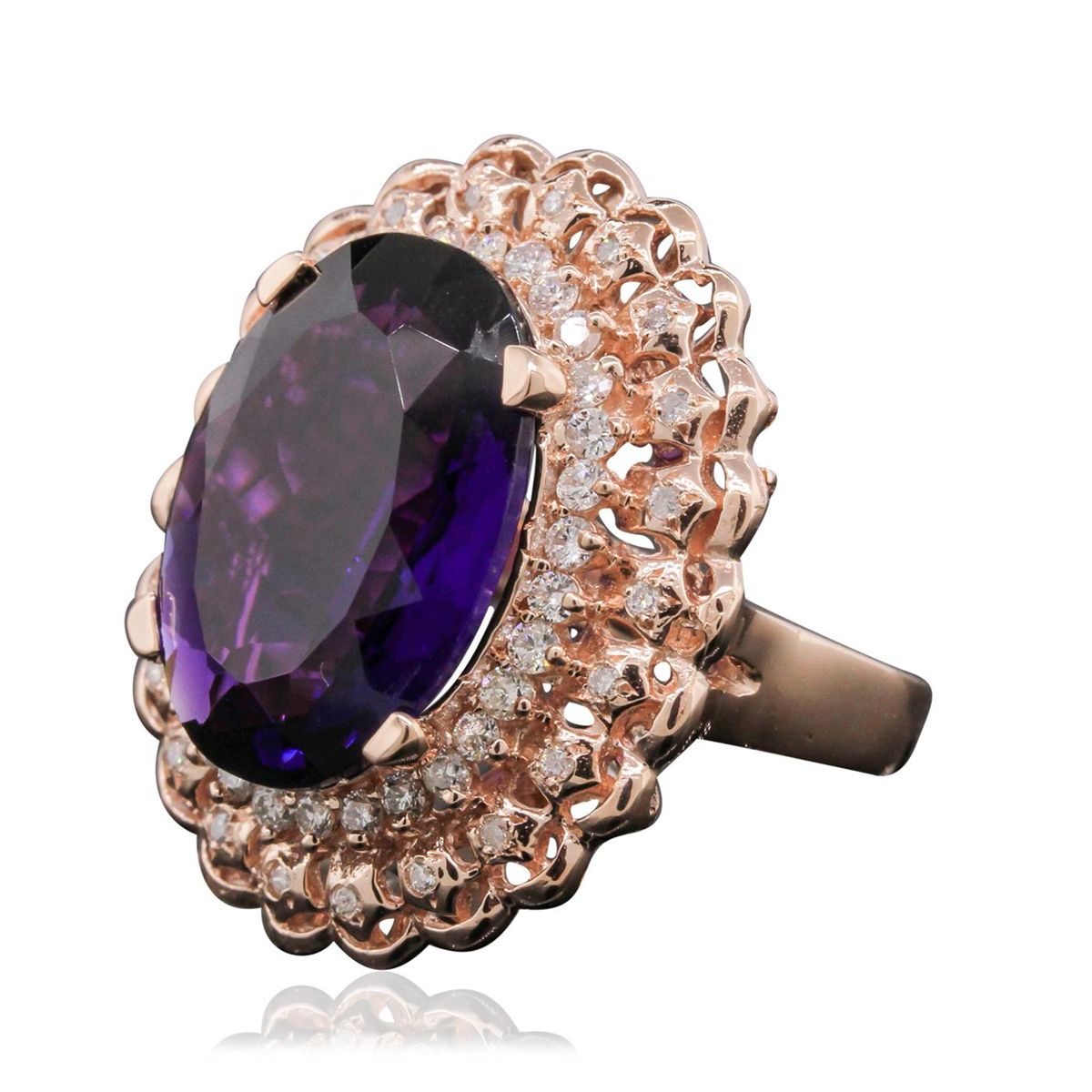 One electronically tested 14KT rose gold Ladies combination cast & assembled ring with a high polish finish. Condition is new. Identified with markings of "K14". Containing: One prong set oval modified mixed cut natural amethyst, measuring 18.00 x 13.00 x 7.15mm, approximate weight of 9.45ct., clarity is eye clean, type II, medium dark, moderately strong, purple color, (GIA P 6/4), cut is good. Colored gemstones are presumed to have been subjected to commonly used color/clarity enhancement processes. Twenty-Two prong set round brilliant cut diamonds, measuring 1.10 - 1.10 x 0.66mm (depth est.) approximate. Total Weight of 22 Stones = 0.15ct. Clarity: I-1 to I-2. Color: I - J, Cut is Good. Thirty-One prong set round brilliant cut diamonds, measuring 1.60 - 1.60 x 0.96mm (depth est.) approximate. Total Weight of 31 Stones = 0.55ct. Clarity: SI-2 to I-1. Color: H - I, Cut is Good. Total Weight of Colored Stones 9.45ct. Total Weight of Diamonds 0.70ct. Total Weight of Ring 9.60 grams. GGL Appraised at $5,300.00.