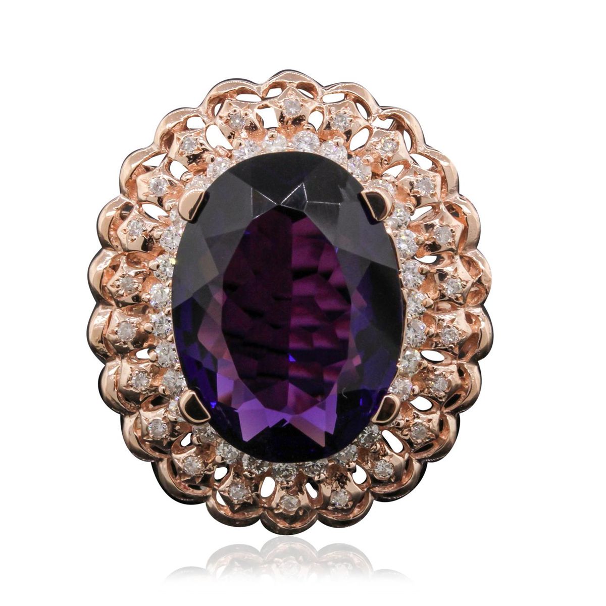 One electronically tested 14KT rose gold Ladies combination cast & assembled ring with a high polish finish. Condition is new. Identified with markings of "K14". Containing: One prong set oval modified mixed cut natural amethyst, measuring 18.00 x 13.00 x 7.15mm, approximate weight of 9.45ct., clarity is eye clean, type II, medium dark, moderately strong, purple color, (GIA P 6/4), cut is good. Colored gemstones are presumed to have been subjected to commonly used color/clarity enhancement processes. Twenty-Two prong set round brilliant cut diamonds, measuring 1.10 - 1.10 x 0.66mm (depth est.) approximate. Total Weight of 22 Stones = 0.15ct. Clarity: I-1 to I-2. Color: I - J, Cut is Good. Thirty-One prong set round brilliant cut diamonds, measuring 1.60 - 1.60 x 0.96mm (depth est.) approximate. Total Weight of 31 Stones = 0.55ct. Clarity: SI-2 to I-1. Color: H - I, Cut is Good. Total Weight of Colored Stones 9.45ct. Total Weight of Diamonds 0.70ct. Total Weight of Ring 9.60 grams. GGL Appraised at $5,300.00.