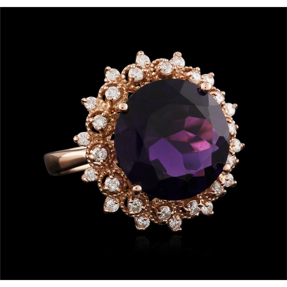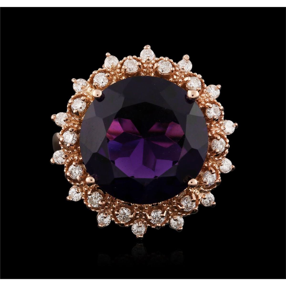 One electronically tested 14KT rose gold ladies cast amethyst and diamond ring with a bright polish finish. Identified with markings of "14K". Condition is new. Containing: One prong set round modified brilliant cut natural amethyst, measuring 14.00 - 14.00 x 9.10 mm, approximate weight of 9.49ct., clarity is eye clean, type II, medium dark, moderately strong, purple color, (GIA P 6/4), cut is good. Twenty-Six prong set round brilliant cut diamonds, measuring 1.30 - 1.30 x 0.78mm (depth est.) approximate total weight of 26 Stones = 0.21ct. Clarity: I-1 to I-2. Color: I - J. Colored gemstones are presumed to have been subjected to commonly used enhancement processes. All diamonds and colored gemstones are graded in the mounting, unless otherwise stated. Total Weight of Colored Stones 9.49ct. Total Weight of Diamonds 0.21ct. Total Weight of Ring 6.80 grams. GGL Appraised at $2,575.00.