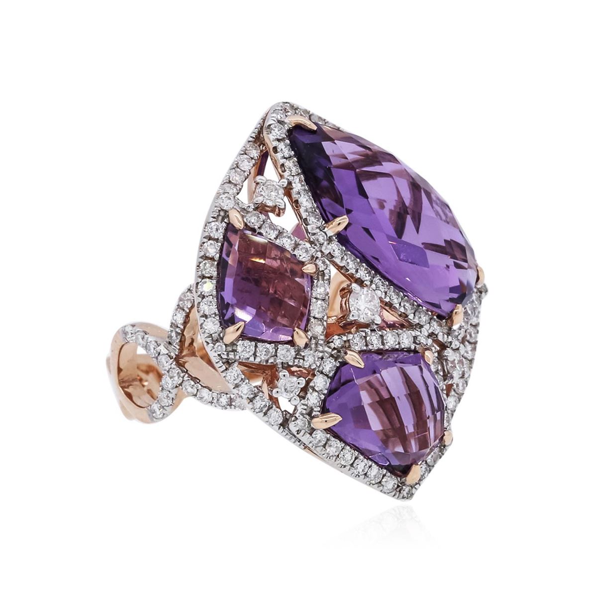 One ring featuring: 14KT rose gold weighing 7.65 grams containing three amethysts center stones with a total weight of 9.59ct and 134 round diamonds with a total weight of 0.99ct.