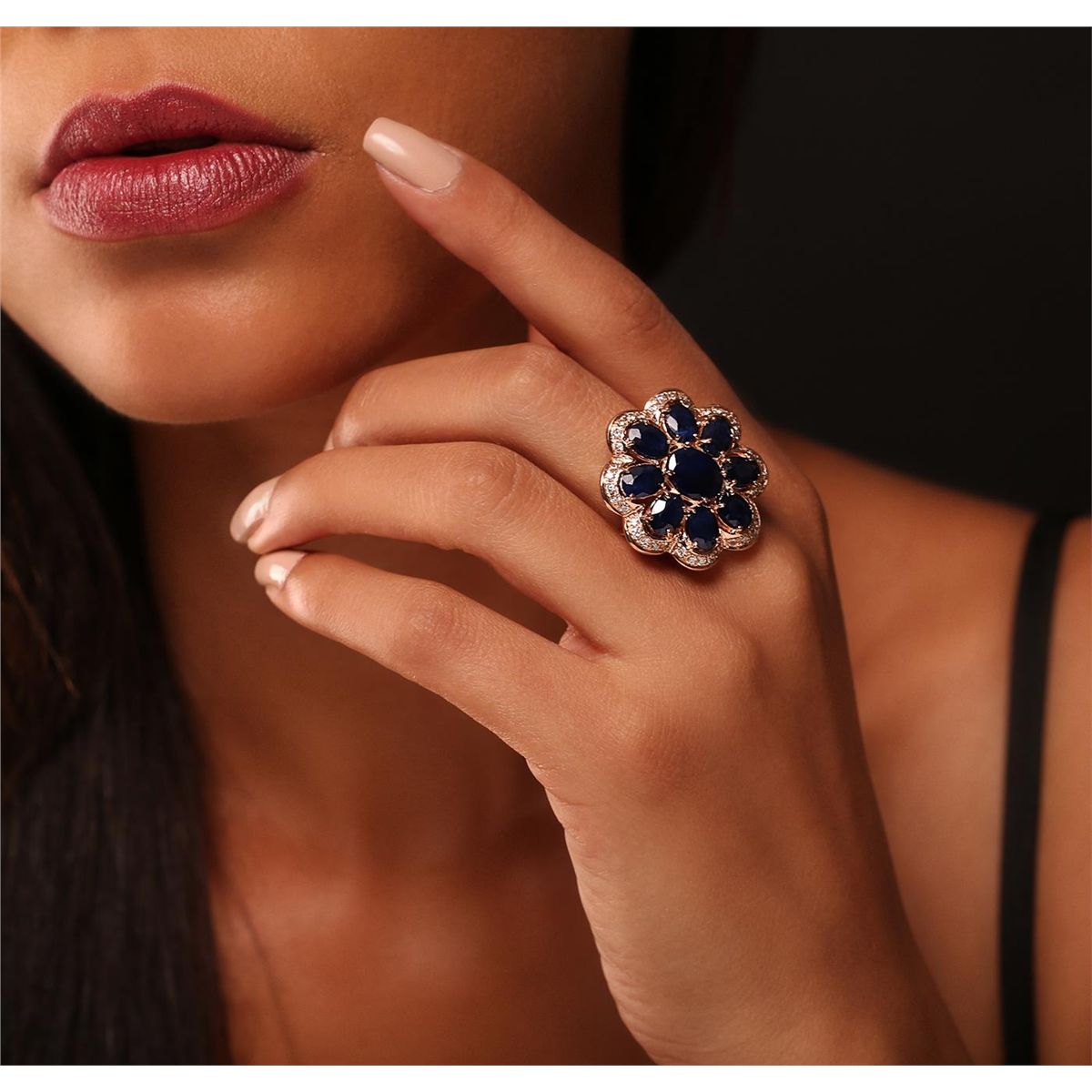 One electronically tested 14KT rose gold ladies cast sapphire and diamond ring with a bright polish finish. Condition is new, good workmanship. The ring features a sapphire floret set within a stylized diamond set bezel, completed by a three millimeter wide band. Identified with markings of "14K". Containing: One prong set oval mixed cut natural blue sapphire, measuring 10.00 x 7.50 x 4.40mm, 5%. bulge factor, approximate weight of 2.93ct., clarity is severely included, type II, dark, very slightly grayish, violetish blue color, (GIA vB 7/3), cut is good. Transmitting light very diffusely, opaque. Naturally occurring internal & external characteristics are present. Indications of multiple laboratory enhancements, including high temperature heat treatment and diffusion treatment. Graded in the setting. Eight prong set oval mixed cut natural blue sapphires, measuring 7.00 x 5.00 x 3.00mm, approximate. Total Weight of 6.98ct., clarity is heavily included, type II, medium dark, very slightly grayish, violetish blue color, (GIA vB 6/3), cut is good. Transmitting light diffusely translucent. Naturally occurring internal & external characteristics are present, including partial color zoning. Measurements & the color grade are an average for the group. Indications of multiple laboratory enhancements, including high temperature heat treatment and diffusion treatment. Graded in the setting. Forty bead set round brilliant cut diamonds, measuring 1.70 - 1.60 x 0.99mm (depth est.) approximate. Total Weight of 40 Stones = 0.75ct. Graded in the setting. Clarity: VS-2 to SI-2. Color: H - J. Total Weight of Colored Stones 9.91ct. Total Weight of Diamonds 0.75ct. Total Weight of Ring 15.95 grams. AIG Appraised at $7,165.00.