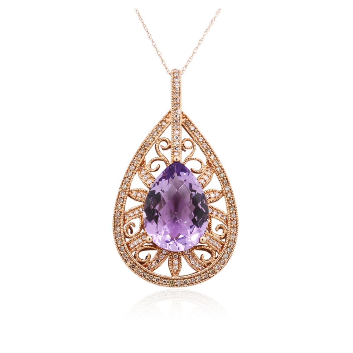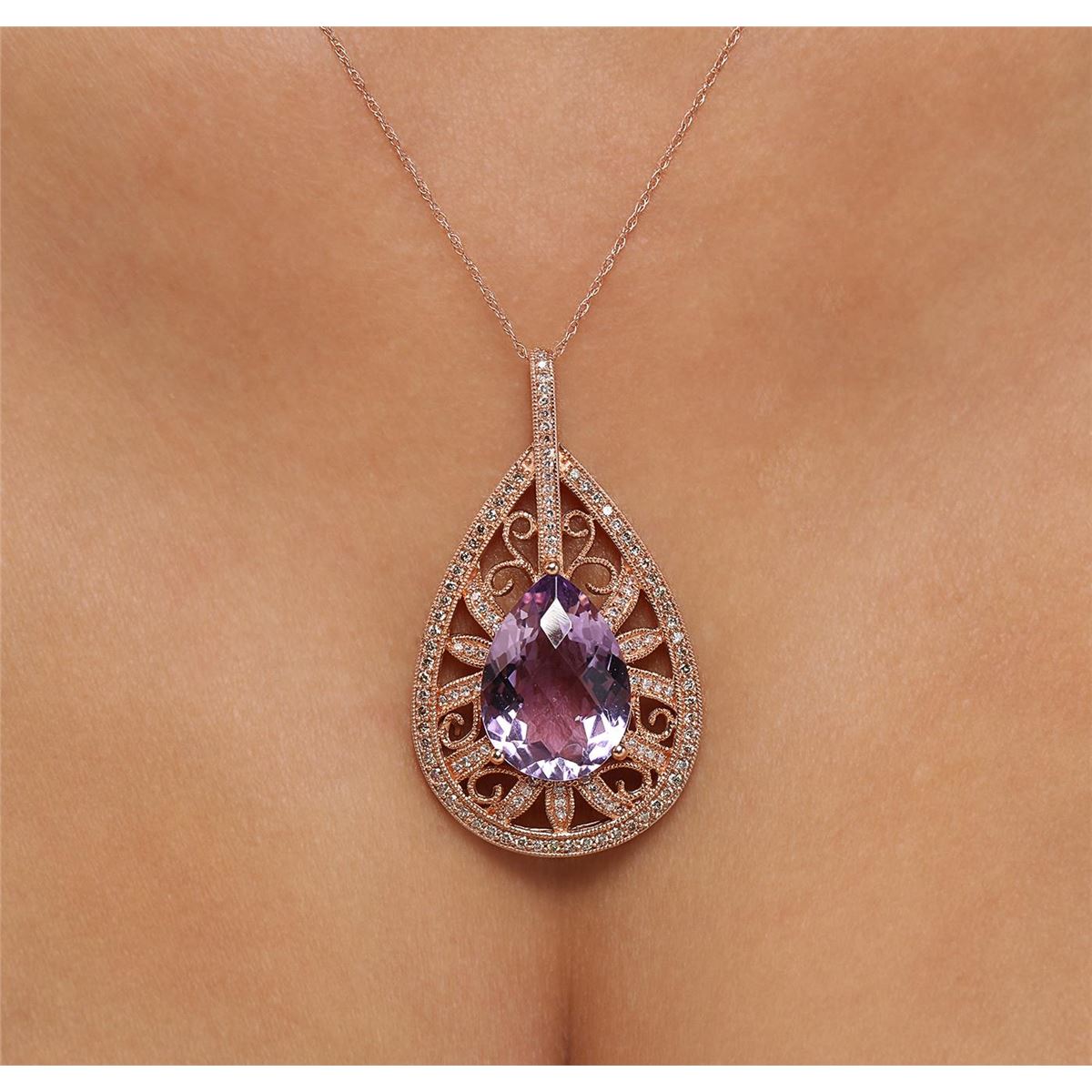 One electronically tested 14KT rose gold ladies combination cast & assembled amethyst and diamond pendant & chain 18.0" long, cable link with a spring ring clasp with a bright polish finish. Identified with markings of "14K". Condition is new. Containing: One prong set pear modified mixed cut natural amethyst, measuring 17.58 x 12.82 x 8.33mm, approximate weight of 9.99ct., clarity is eye clean, type II, light, very slightly grayish, purple color, (GIA P 3/3), cut is good. One Hundred Twenty-Three prong set round brilliant cut diamonds, measuring 1.30 - 1.00. x 0.69mm (depth est.) approximate total weight of 123 Stones = 0.68ct. Clarity: SI-1 to SI. Color: M - N, Cut is Good. Colored gemstones are presumed to have been subjected to commonly used enhancement processes. All diamonds and colored gemstones are graded in the mounting, unless otherwise stated. Total Weight of Colored Stones 9.99ct. Total Weight of Diamonds 0.68ct. Total Weight of Pendant & Chain 8.70 grams. GGL Appraised at $3,345.00.