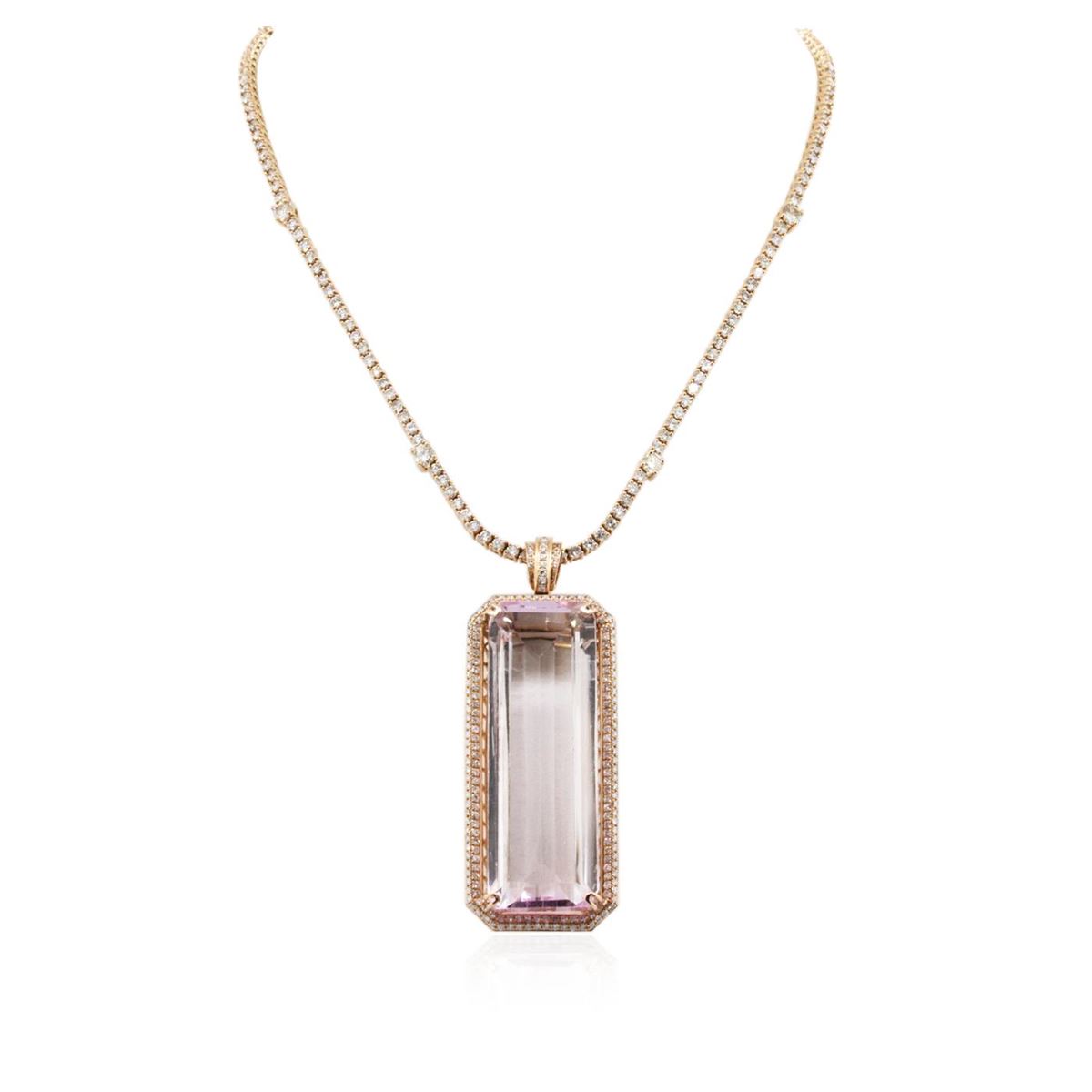 One electronically tested 14KT rose gold ladies cast & assembled kunzite and diamond pendant/enhancer with chain. Condition is new, good workmanship. The pendant/enhancer features a kunzite set within a tiered diamond bezel, completed by a diamond set snap-locking clasp. The pendant/enhancer is supported by a seventeen and one-quarter inch length 14KT rose gold diamond set chain, terminating in a concealed clasp with safety. Bright polish finish with milgrain detailing. Identified with markings of "585". Containing: One prong set octagonal step cut natural kunzite, measuring 55.81 x 19.36 x 13.08mm, exact weight 162.70ct., type I Clarity is eye clean, light, very slightly grayish, purplish-pink color, (GIA pPi 3/3), cut is good. Transmitting light with no distortion, transparent. GIA Gemological Report attached. Graded loose prior to setting in the GIA Laboratory, Report #1166000102.Three Hundred Seventy-Four prong set round brilliant cut diamonds (depth est.) approximate. Total Weight of 374 Stones = 11.93ct. Graded in the setting. Clarity: SI-1 to I-1. Color: G - J. Total Weight of Colored Stones162.70ct. Total Weight of Diamonds 11.93ct. Total Weight of Pendant/Enhancer With Chain 74.22 grams. AIG Appraised at $72,765.00.