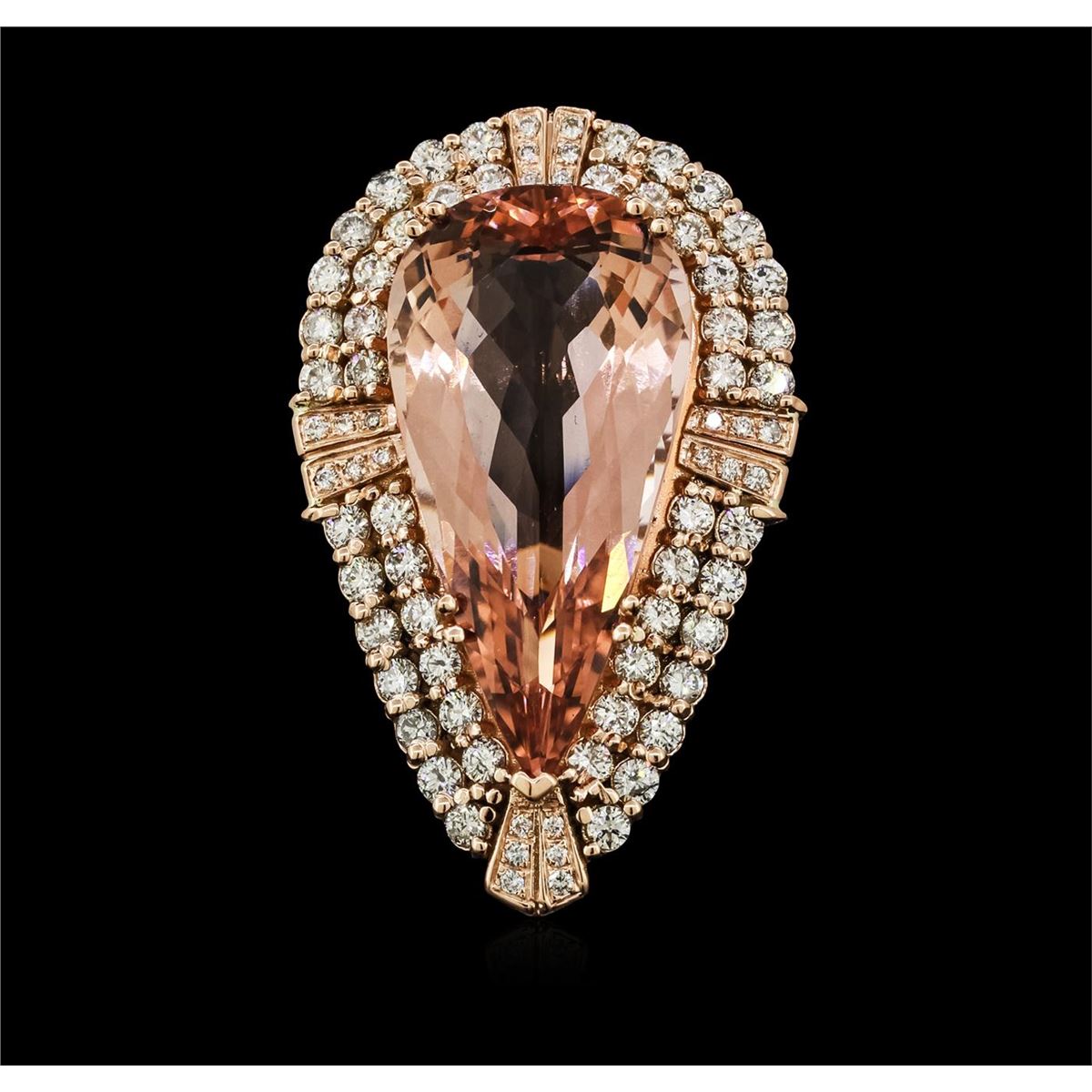 One electronically tested 14KT rose gold ladies cast morganite and diamond ring with a bright polish finish. The featured morganite is set within two tiered diamond bezels, completed by a four millimeter wide band. Identified with markings of "14K". Condition is new, good workmanship. Containing: One prong set pear modified brilliant cut natural morganite, measuring 31.81 x 15.91 x 9.20mm, exact weight 24.71ct., type I Clarity is slightly included, medium dark, very slightly brownish, pinkish orange color, (GIA piO 6/3), cut is good. Transmitting light with minimum of distortion, transparent. Naturally occurring internal & external characteristics are present. GIA Gemological Report attached. Graded loose prior to setting in the GIA Laboratory, Report #2151957715.Fifty-One prong set round brilliant cut diamonds, measuring 2.40 - 2.30 x 1.41mm (depth est.) approximate total weight of 51 Stones = 2.52ct. Graded in the setting. Clarity: SI-1 to I-1. Color: H - J Twenty-Four bead set round brilliant cut diamonds, measuring 1.40 - 1.20 x 0.78mm (depth est.) approximate total weight of 24 Stones = 0.25ct. Graded in the setting. Clarity: SI-1 to SI-2. Color: H - J. Total Weight of Colored Stones 24.71ct. Total Weight of Diamonds 2.77ct. Total Weight of Ring 20.51 grams. AIG Appraised at $28,625.00.