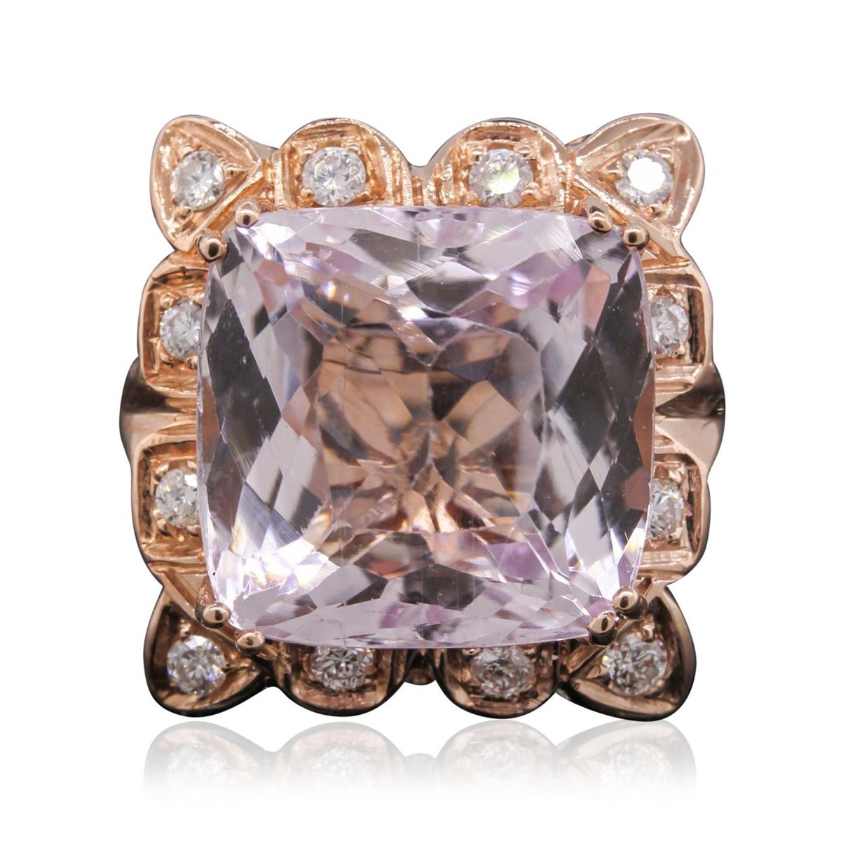 One electronically tested 14KT rose gold ladies cast kunzite spodumene and diamond ring with a bright polish finish. Condition is new, good workmanship. The featured kunzite spodumene is set within a diamond bezel, completed by a three and one-half millimeter wide band. Identified with markings of "14K". Containing: One prong set rectangular cushion modified brilliant cut natural kunzite, measuring 16.90 x 16.14 x 10.67mm, exact weight 25.19ct., type I, light, very slightly grayish, purple red color, (GIA PR 3/3) Clarity is slightly included, medium, very slightly grayish, Pink-Purple color, (GIA PiP 3/3), cut is good. Transmitting light with minimum distortion, transparent. GIA Gemological Report attached. Graded loose prior to setting in the GIA Laboratory, Report # 6157953659.Twelve bead set round brilliant cut diamonds, measuring 2.30 - 2.30 x 1.38mm (depth est.) approximate. Total Weight of 12 Stones = 0.63ct. Graded in the setting. Clarity: SI-2 to I-1. Color: F - H. Total Weight of Colored Stones 25.19ct. Total Weight of Diamonds 0.63ct. Total Weight of Ring 18.30 grams. AIG Appraised at $11,215.00.