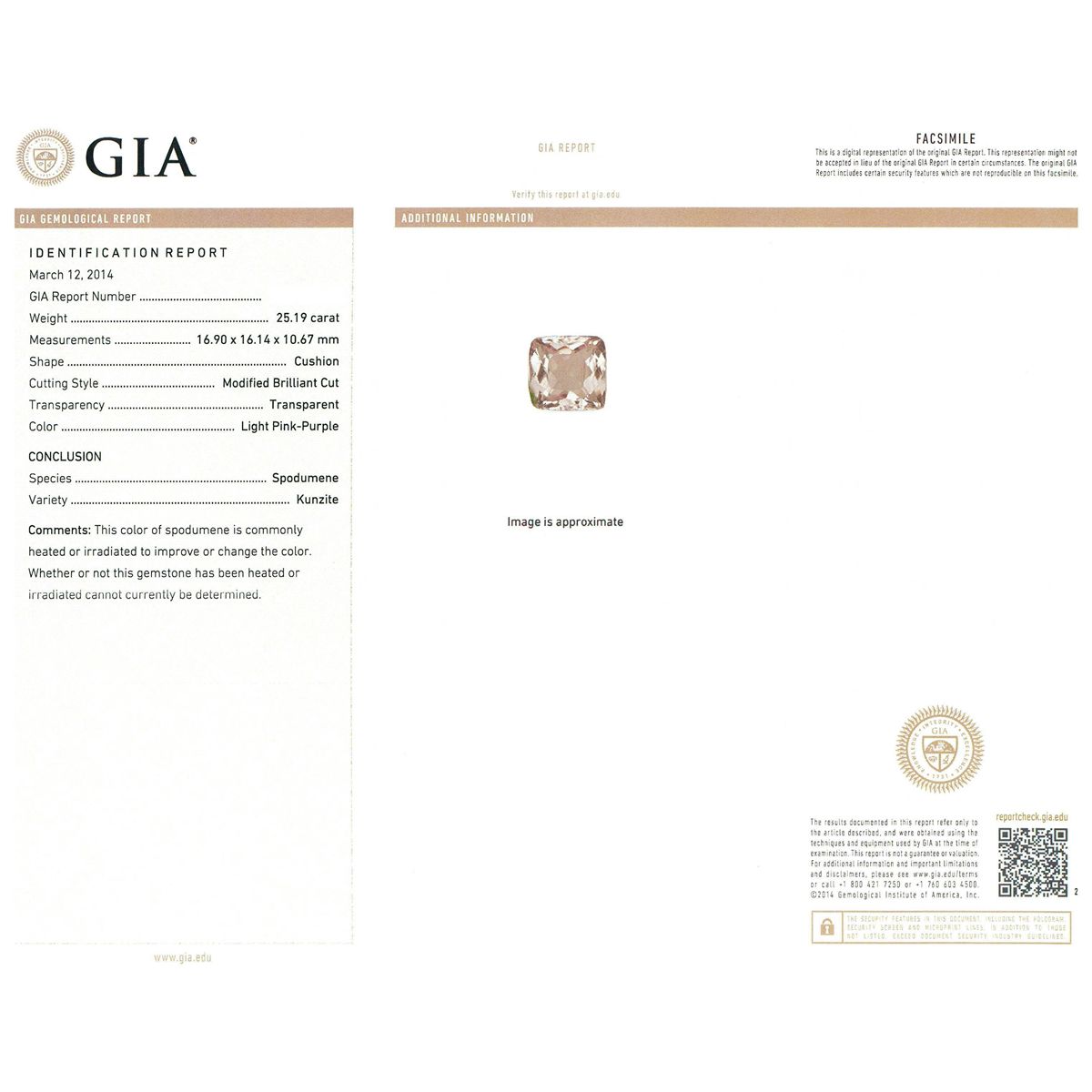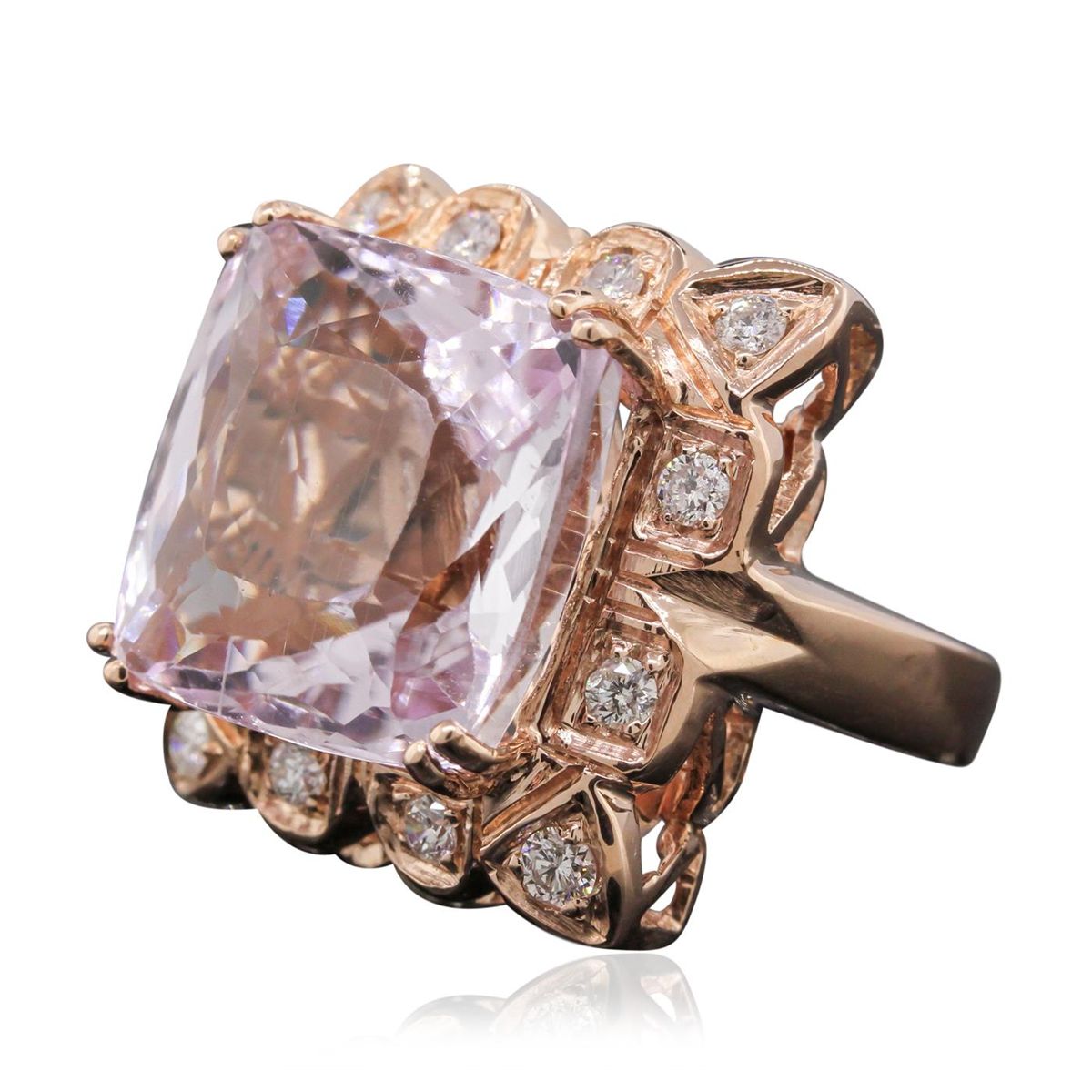 One electronically tested 14KT rose gold ladies cast kunzite spodumene and diamond ring with a bright polish finish. Condition is new, good workmanship. The featured kunzite spodumene is set within a diamond bezel, completed by a three and one-half millimeter wide band. Identified with markings of "14K". Containing: One prong set rectangular cushion modified brilliant cut natural kunzite, measuring 16.90 x 16.14 x 10.67mm, exact weight 25.19ct., type I, light, very slightly grayish, purple red color, (GIA PR 3/3) Clarity is slightly included, medium, very slightly grayish, Pink-Purple color, (GIA PiP 3/3), cut is good. Transmitting light with minimum distortion, transparent. GIA Gemological Report attached. Graded loose prior to setting in the GIA Laboratory, Report # 6157953659.Twelve bead set round brilliant cut diamonds, measuring 2.30 - 2.30 x 1.38mm (depth est.) approximate. Total Weight of 12 Stones = 0.63ct. Graded in the setting. Clarity: SI-2 to I-1. Color: F - H. Total Weight of Colored Stones 25.19ct. Total Weight of Diamonds 0.63ct. Total Weight of Ring 18.30 grams. AIG Appraised at $11,215.00.
