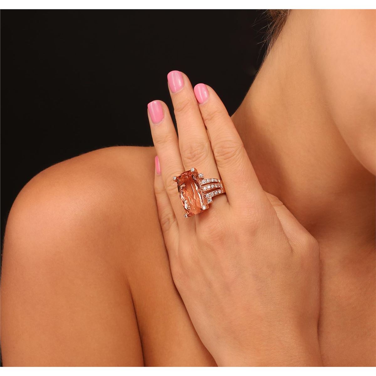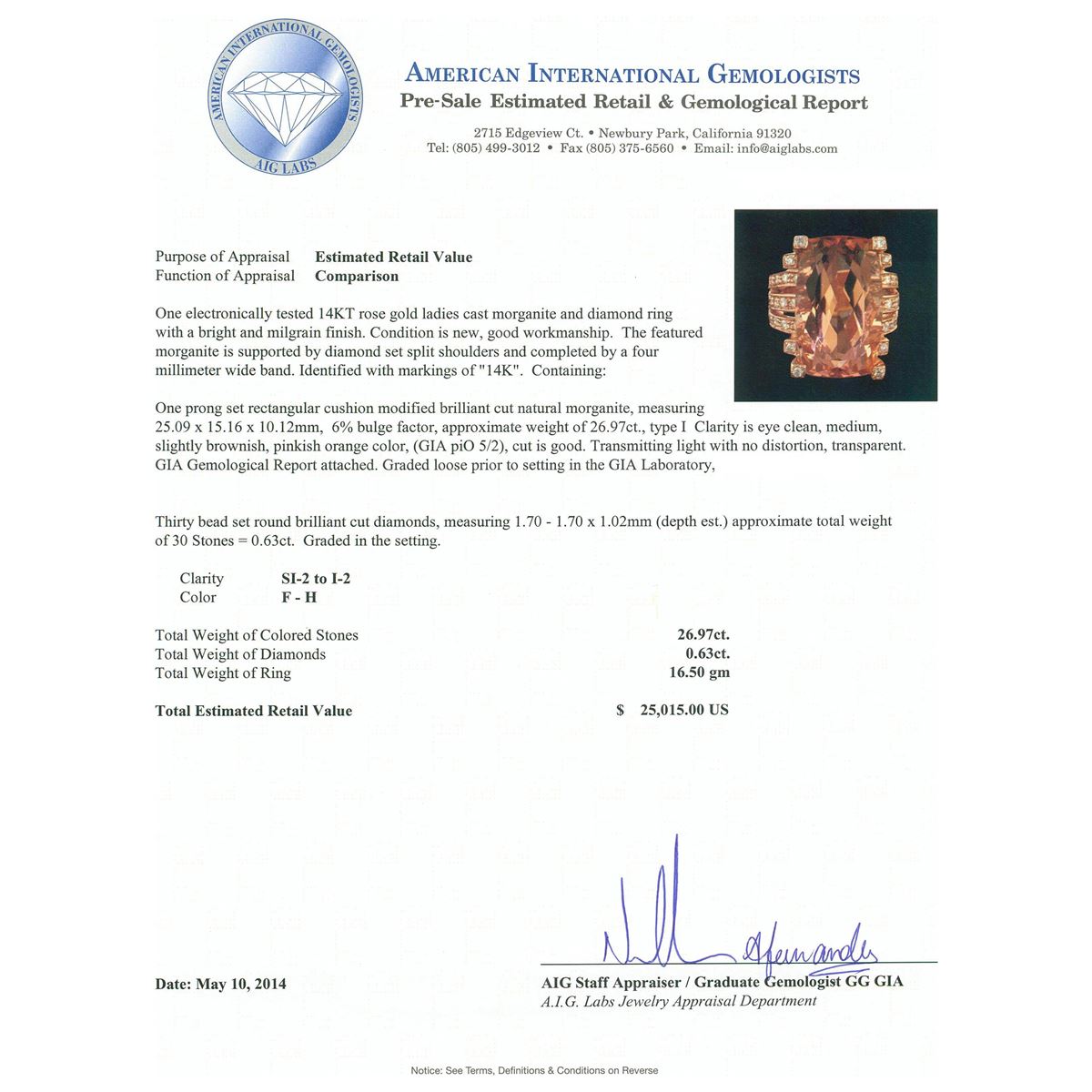 One electronically tested 14KT rose gold ladies cast morganite and diamond ring with a bright and milgrain finish. Condition is new, good workmanship. The featured morganite is supported by diamond set split shoulders and completed by a four millimeter wide band. Identified with markings of "14K". Containing: One prong set rectangular cushion modified brilliant cut natural morganite, measuring 25.09 x 15.16 x 10.12mm, 6%. bulge factor, approximate weight of 26.97ct., type I Clarity is eye clean, medium, slightly brownish, pinkish orange color, (GIA piO 5/2), cut is good. Transmitting light with no distortion, transparent. GIA Gemological Report attached. Graded loose prior to setting in the GIA Laboratory, Report #1156951959.Thirty bead set round brilliant cut diamonds, measuring 1.70 - 1.70 x 1.02mm (depth est.) approximate. Total Weight of 30 Stones = 0.63ct. Graded in the setting. Clarity: SI-2 to I-2. Color: F - H. Total Weight of Colored Stones 26.97ct. Total Weight of Diamonds 0.63ct. Total Weight of Ring 16.50grams. AIG Appraised at $25,015.00.