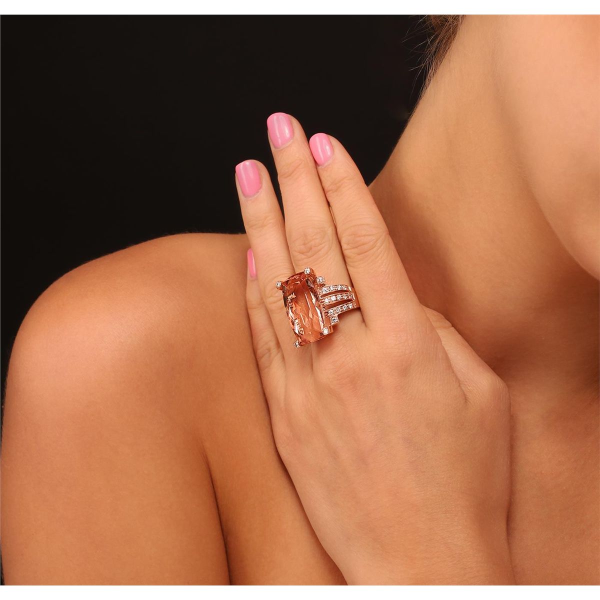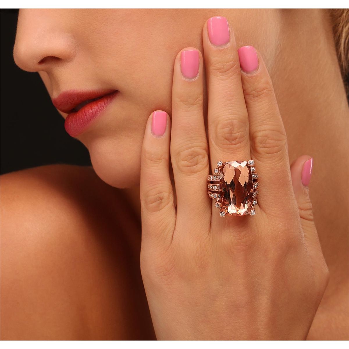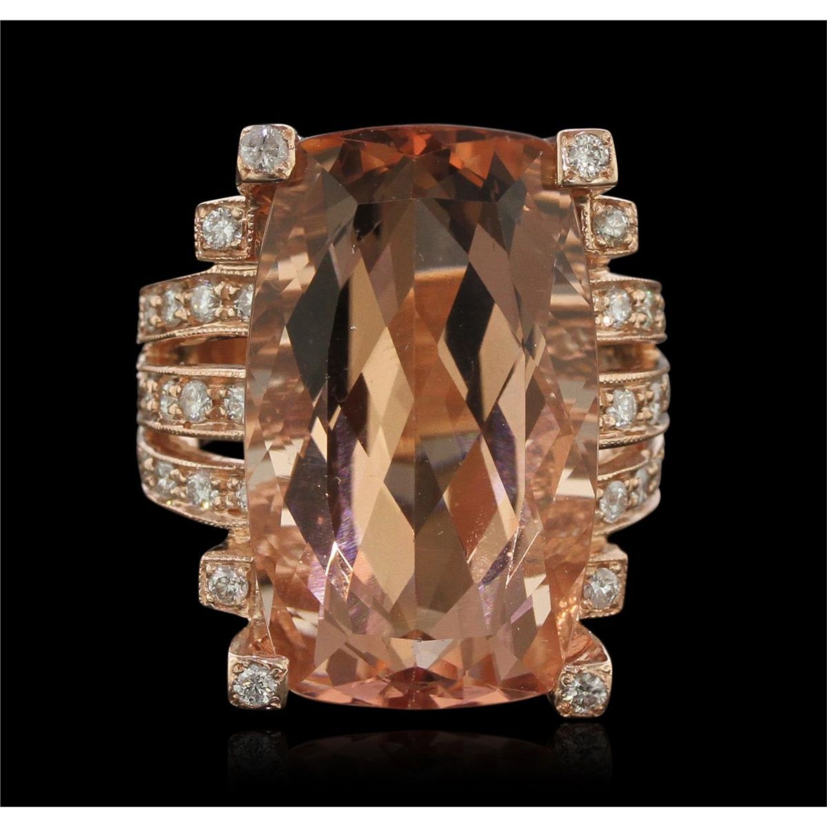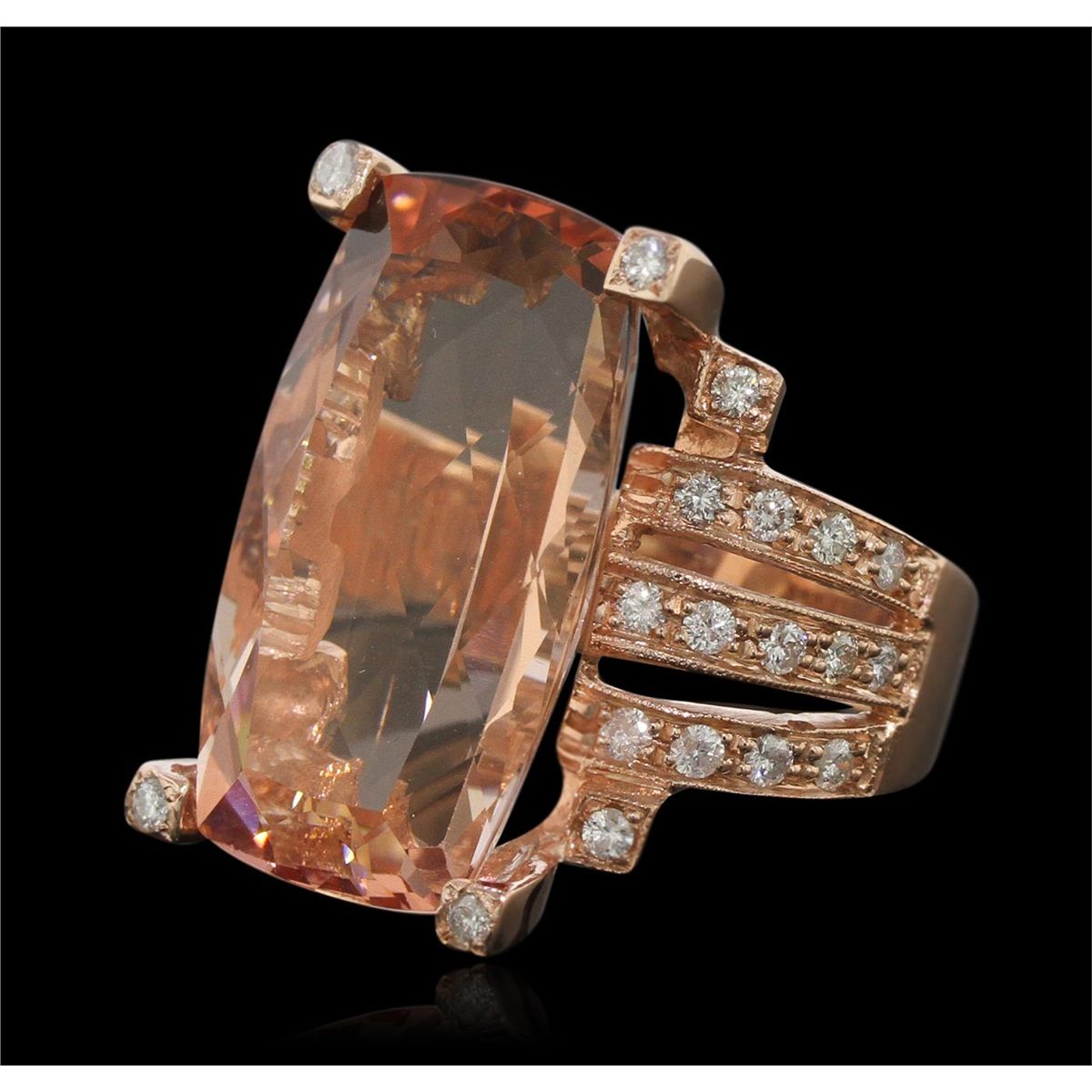 One electronically tested 14KT rose gold ladies cast morganite and diamond ring with a bright and milgrain finish. Condition is new, good workmanship. The featured morganite is supported by diamond set split shoulders and completed by a four millimeter wide band. Identified with markings of "14K". Containing: One prong set rectangular cushion modified brilliant cut natural morganite, measuring 25.09 x 15.16 x 10.12mm, 6%. bulge factor, approximate weight of 26.97ct., type I Clarity is eye clean, medium, slightly brownish, pinkish orange color, (GIA piO 5/2), cut is good. Transmitting light with no distortion, transparent. GIA Gemological Report attached. Graded loose prior to setting in the GIA Laboratory, Report #1156951959.Thirty bead set round brilliant cut diamonds, measuring 1.70 - 1.70 x 1.02mm (depth est.) approximate. Total Weight of 30 Stones = 0.63ct. Graded in the setting. Clarity: SI-2 to I-2. Color: F - H. Total Weight of Colored Stones 26.97ct. Total Weight of Diamonds 0.63ct. Total Weight of Ring 16.50grams. AIGAppraised at $25,015.00.