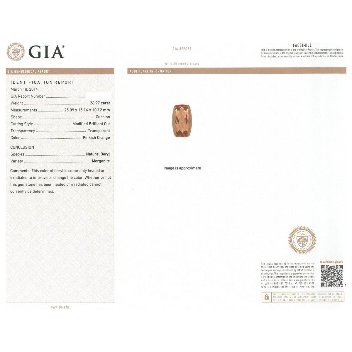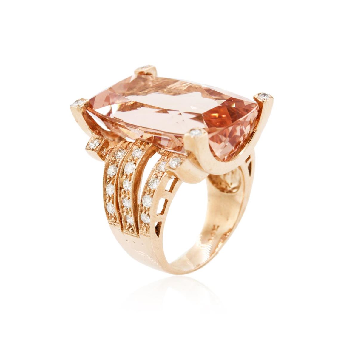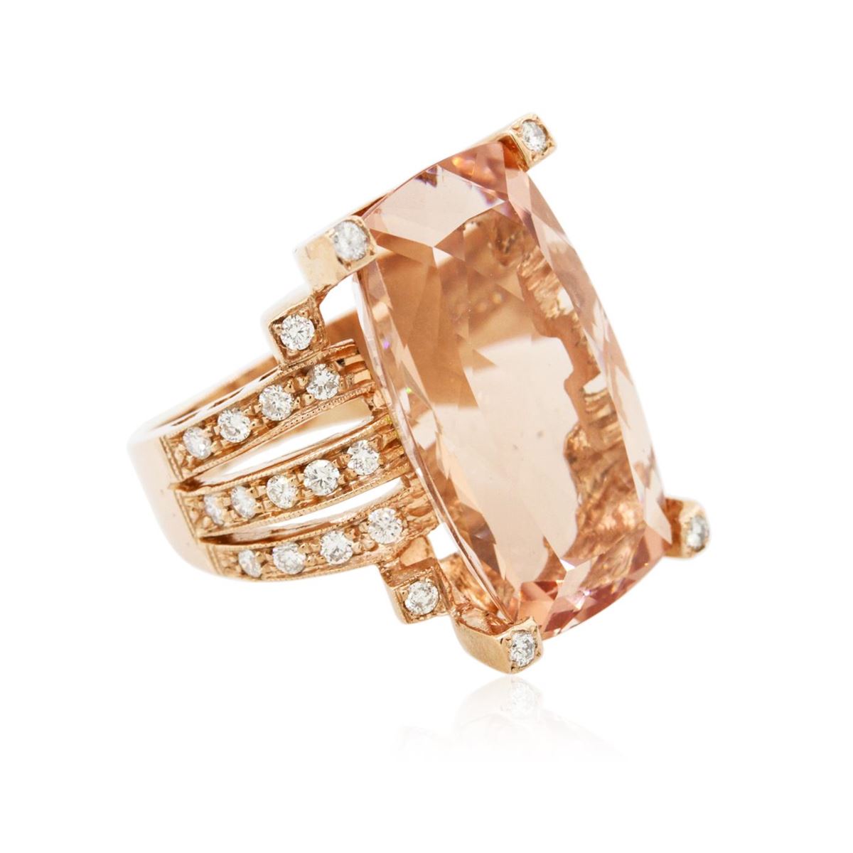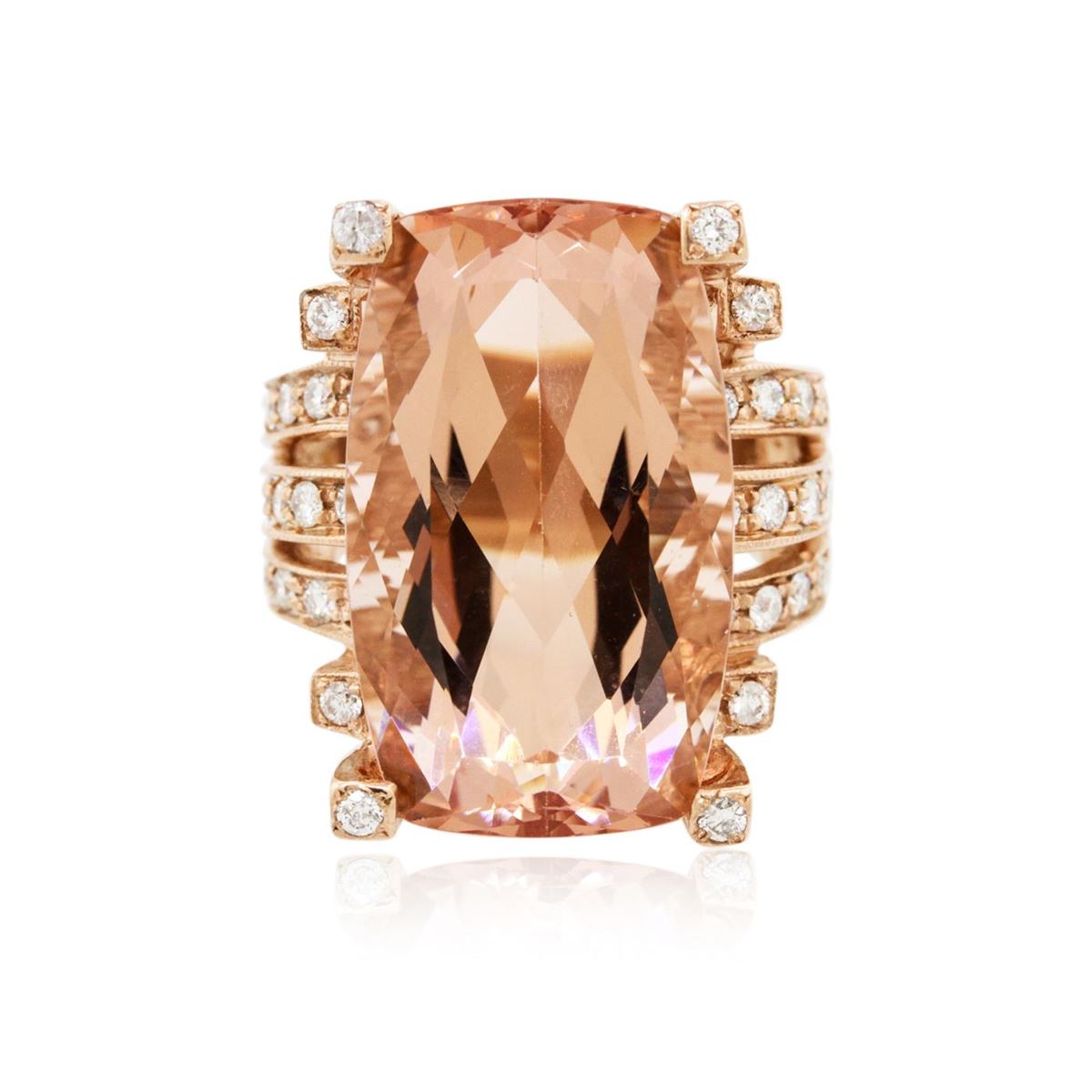 One electronically tested 14KT rose gold ladies cast morganite and diamond ring with a bright and milgrain finish. Condition is new, good workmanship. The featured morganite is supported by diamond set split shoulders and completed by a four millimeter wide band. Identified with markings of "14K". Containing: One prong set rectangular cushion modified brilliant cut natural morganite, measuring 25.09 x 15.16 x 10.12mm, 6%. bulge factor, approximate weight of 26.97ct., type I Clarity is eye clean, medium, slightly brownish, pinkish orange color, (GIA piO 5/2), cut is good. Transmitting light with no distortion, transparent. GIA Gemological Report attached. Graded loose prior to setting in the GIA Laboratory, Report #1156951959.Thirty bead set round brilliant cut diamonds, measuring 1.70 - 1.70 x 1.02mm (depth est.) approximate. Total Weight of 30 Stones = 0.63ct. Graded in the setting. Clarity: SI-2 to I-2. Color: F - H. Total Weight of Colored Stones 26.97ct. Total Weight of Diamonds 0.63ct. Total Weight of Ring 16.50grams. AIG Appraised at $25,015.00.