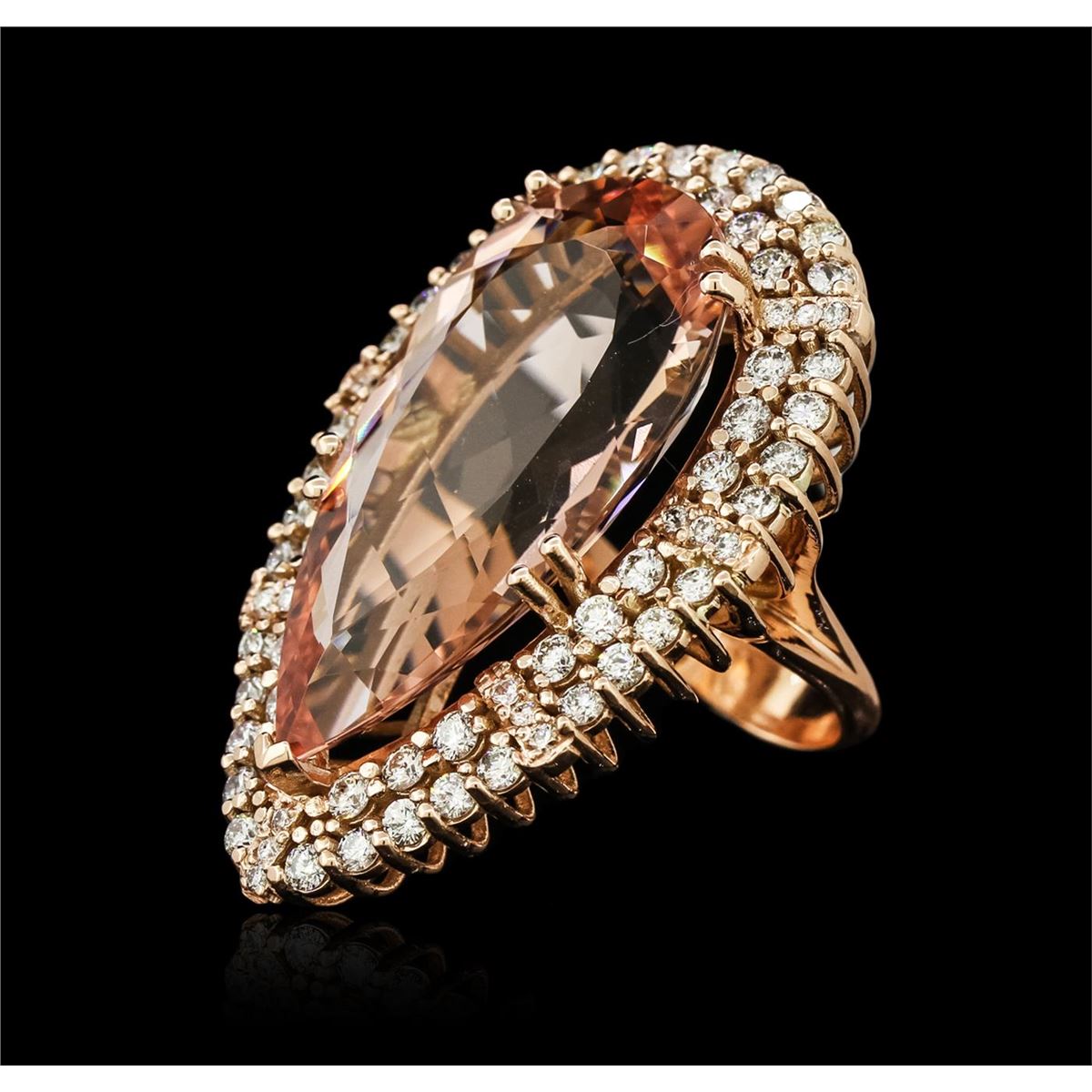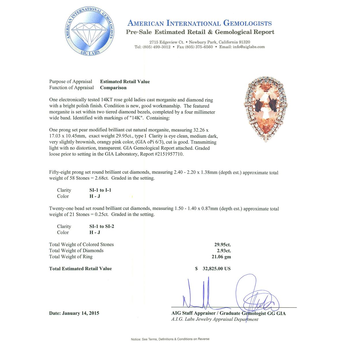 One electronically tested 14KT rose gold ladies cast morganite and diamond ring with a bright polish finish. The featured morganite is set within two tiered diamond bezels, completed by a four millimeter wide band. Identified with markings of "14K". Condition is new, good workmanship. Containing: One prong set pear modified brilliant cut natural morganite, measuring 32.26 x 17.03 x 10.45mm, exact weight 29.95ct., type I Clarity is eye clean, medium dark, very slightly brownish, orangy pink color, (GIA oPi 6/3), cut is good. Transmitting light with no distortion, transparent. GIA Gemological Report attached. Graded loose prior to setting in the GIA Laboratory, Report #2151957710.Fifty-Eight prong set round brilliant cut diamonds, measuring 2.40 - 2.20 x 1.38mm (depth est.) approximate total weight of 58 Stones = 2.68ct. Graded in the setting. Clarity: SI-1 to I-1. Color: H - J Twenty-One bead set round brilliant cut diamonds, measuring 1.50 - 1.40 x 0.87mm (depth est.) approximate total weight of 21 Stones = 0.25ct. Graded in the setting. Clarity: SI-1 to SI-2. Color: H - J. Total Weight of Colored Stones 29.95ct. Total Weight of Diamonds 2.93ct. Total Weight of Ring 21.06 grams. AIG Appraised at $32,825.00.