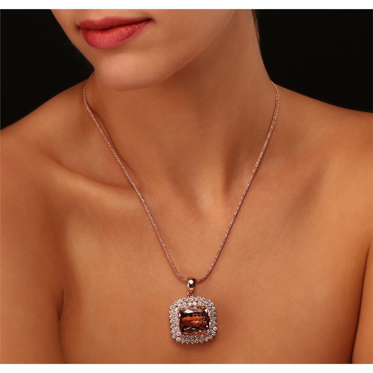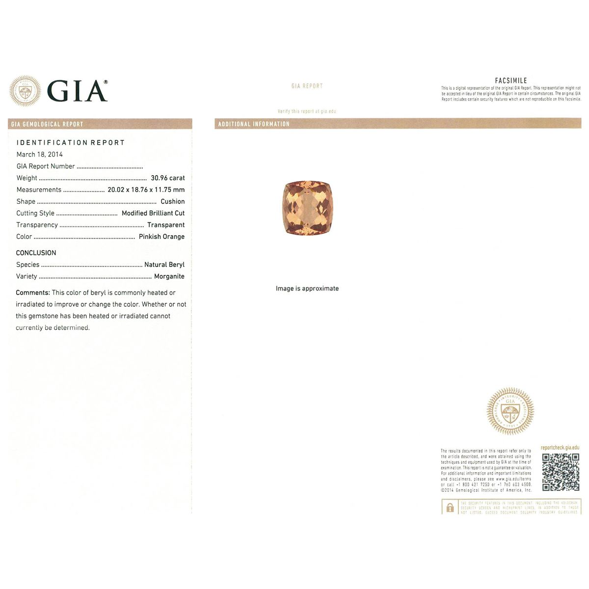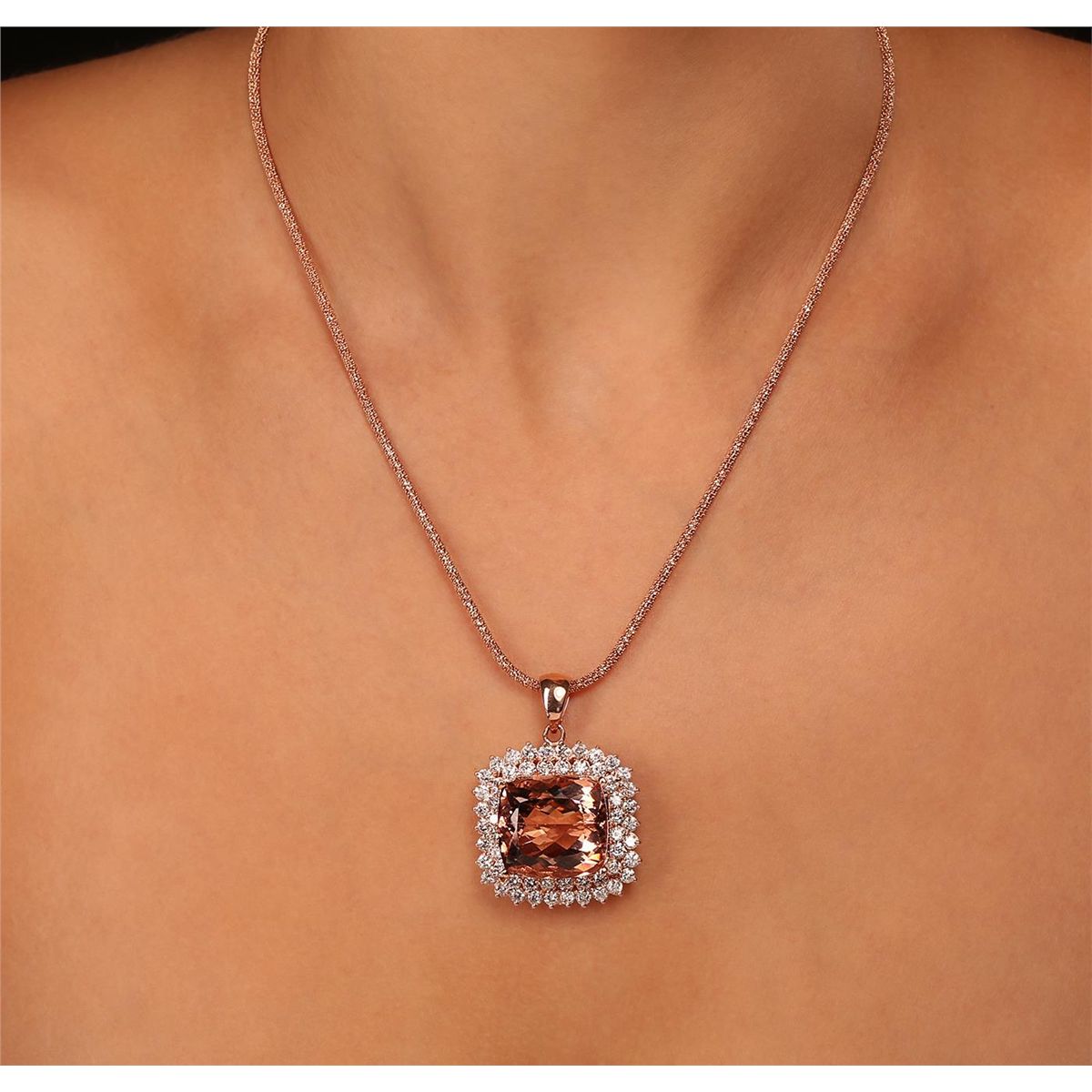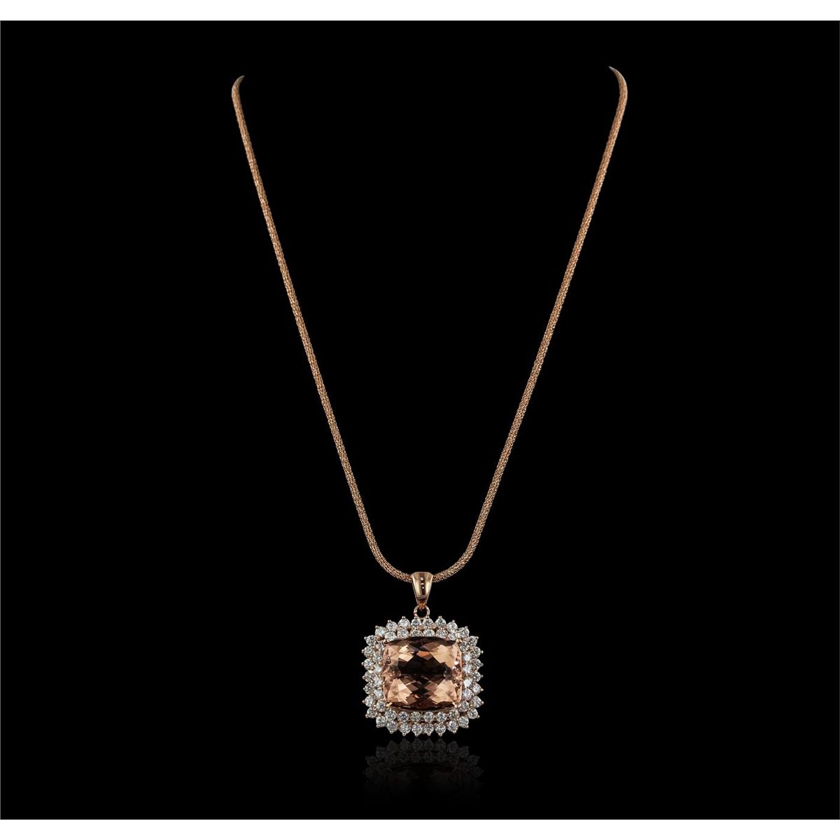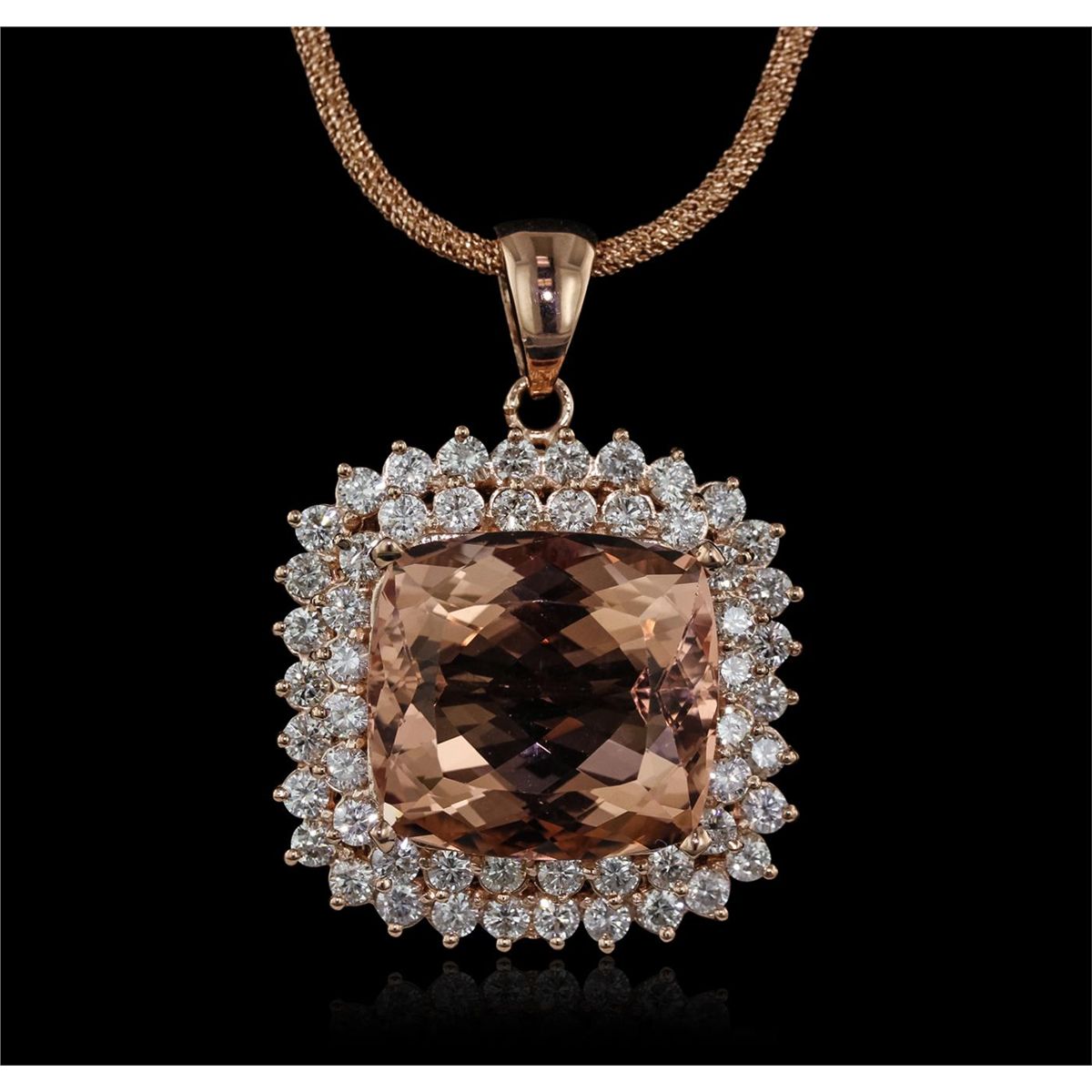 One electronically tested 14KT rose gold ladies cast & assembled morganite and diamond pendant with chain. Condition is new, good workmanship. The pendant features a morganite set within two tiered diamond bezels, completed by a rose gold bail. The pendant is supported by an eighteen inch length 14KT rose gold woven chain, terminating in a lobster claw clasp. Bright polish finish. Identified with markings of "K14". Containing: One prong set cushion modified brilliant cut natural morganite, measuring 20.02 x 18.76 x 11.75mm, exact weight 30.96ct., type I Clarity is eye clean, medium, very slightly brownish, pinkish orange color, (GIA piO 5/3), cut is good. Transmitting light with no distortion, transparent. GIA Gemological Report attached. Graded loose prior to setting in the GIA Laboratory, Report #2151962559.Fifty-Four prong set round brilliant cut diamonds, measuring 2.90 - 2.80 x 1.71mm (depth est.) approximate. Total Weight of 54 Stones = 4.67ct. Graded in the setting. Clarity: SI-1 to I-1. Color: G - I. Total Weight of Colored Stones 30.96ct. Total Weight of Diamonds 4.67ct. Total Weight of Pendant With Chain 31.82 grams. AIGAppraised at $39,340.00.