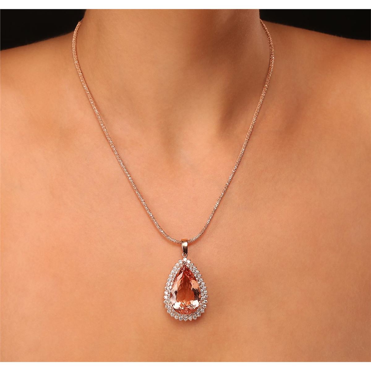 One electronically tested 14KT rose gold ladies cast & assembled morganite and diamond pendant with chain. Condition is new, good workmanship. The pendant features a morganite set within a two tiered diamond bezel, completed by a rose gold bail. The pendant is supported by an eighteen inch length 14KT rose gold woven chain, terminating in a lobster claw clasp. Bright polish finish. Identified with markings of "14K". Containing: One prong set pear modified brilliant cut natural morganite, measuring 28.44 x 17.56 x 10.86mm, exact weight 31.73ct., type I Clarity is eye clean, medium, very slightly brownish, pinkish orange color, (GIA piO 5/3), cut is good. Transmitting light with no distortion, transparent. GIA Gemological Report attached. Graded loose prior to setting in the GIA Laboratory, Report #2151957696.Sixty-Eight prong set round brilliant cut diamonds, measuring 2.30 - 2.10 x 1.32mm (depth est.) approximate. Total Weight of 68 Stones = 2.74ct. Graded in the setting. Clarity: SI-1 to I-1. Color: G - I. Total Weight of Colored Stones 31.73ct. Total Weight of Diamonds 2.74ct. Total Weight of Pendant With Chain 27.02 grams. AIG Appraised at $33,505.00.