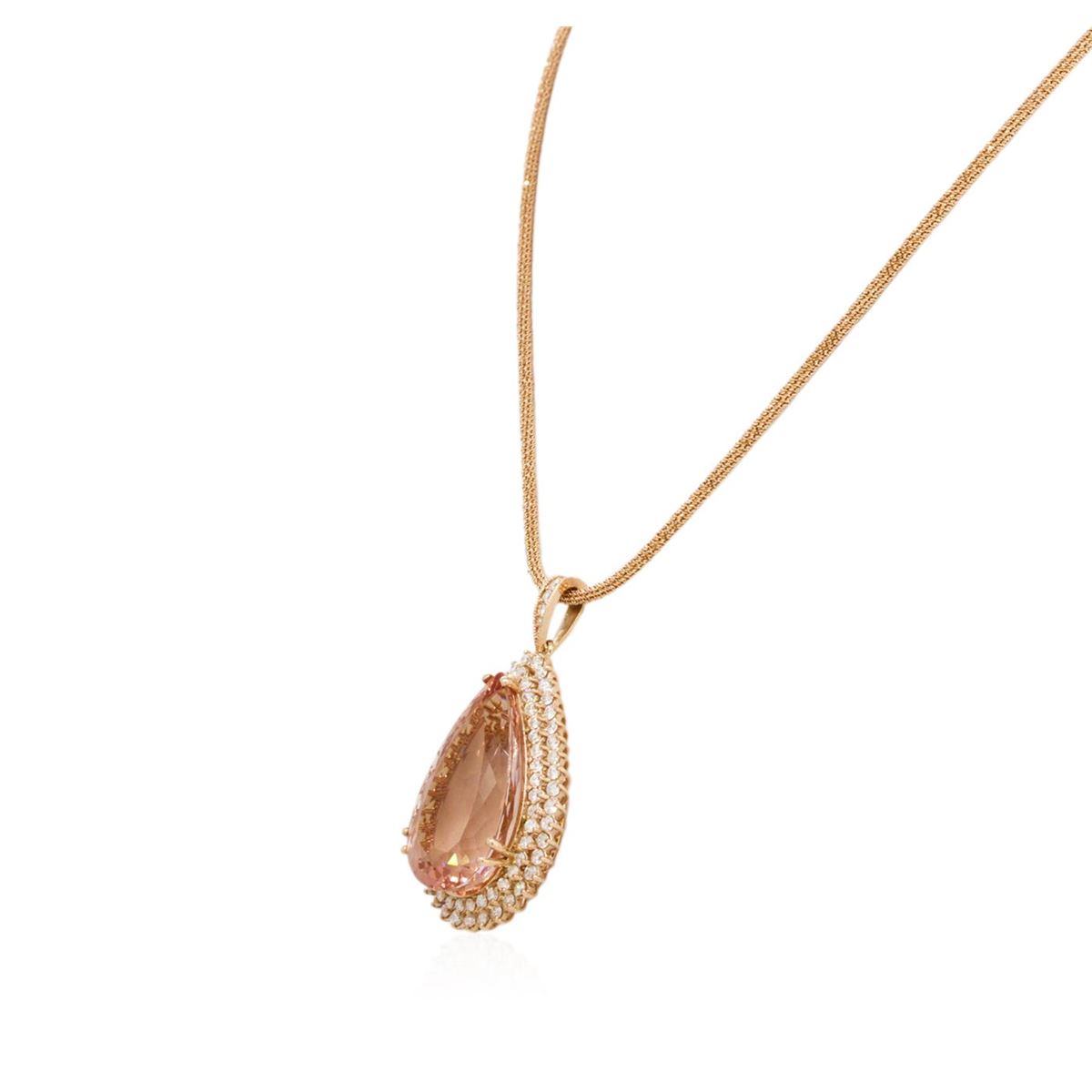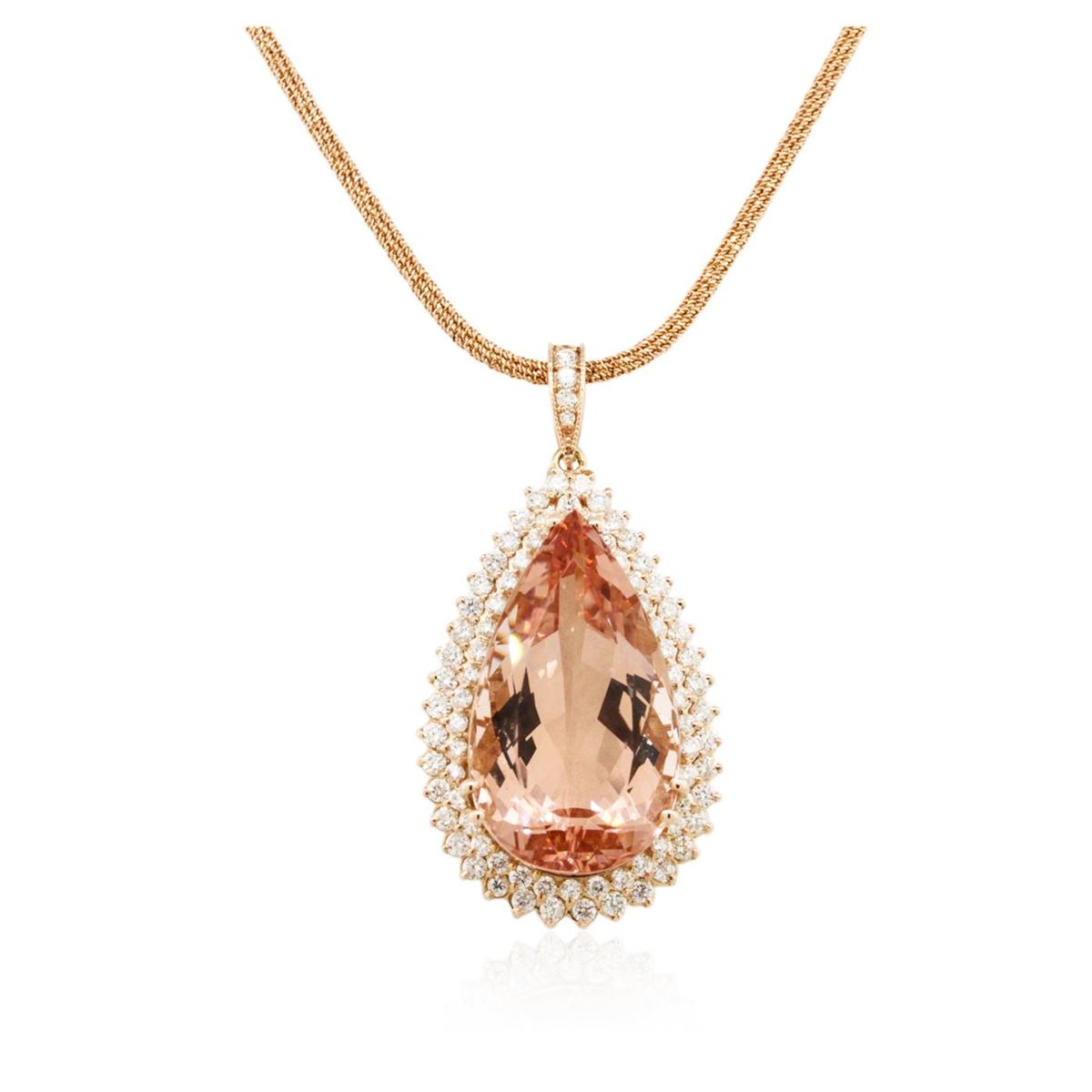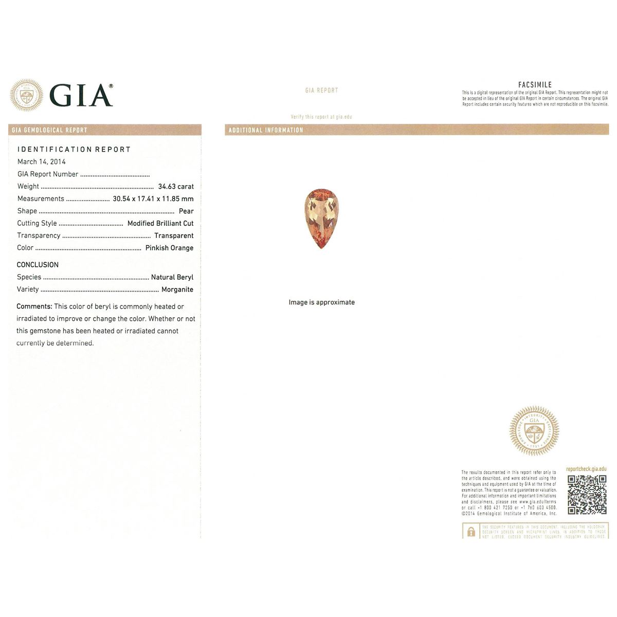 One electronically tested 14KT rose gold ladies cast & assembled morganite and diamond pendant with chain. Condition is new, good workmanship. The pendant features a morganite set within two tiered diamond bezels, completed by a diamond set bail. The pendant is supported by an eighteen inch length 14KT rose gold woven chain, terminating in a lobster claw clasp. Bright polish finish with milgrain detailing. Identified with markings of "14K". Containing: One prong set pear modified brilliant cut natural morganite, measuring 30.54 x 17.41 x 11.85mm, exact weight 34.63ct., type I Clarity is eye clean, medium, very slightly brownish, pinkish orange color, (GIA piO 5/3), cut is good. Transmitting light with no distortion, transparent. GIA Gemological Report attached. Graded loose prior to setting in the GIA Laboratory, Report #2151961054.Eighty-Five prong set round brilliant cut diamonds, measuring 2.20 - 1.90 x 1.23mm (depth est.) approximate. Total Weight of 85 Stones = 2.78ct. Graded in the setting. Clarity: SI-1 to I-1. Color: G - I. Total Weight of Colored Stones 34.63ct. Total Weight of Diamonds 2.78ct. Total Weight of Pendant With Chain 27.04 grams. AIG Appraised at $35,015.00.