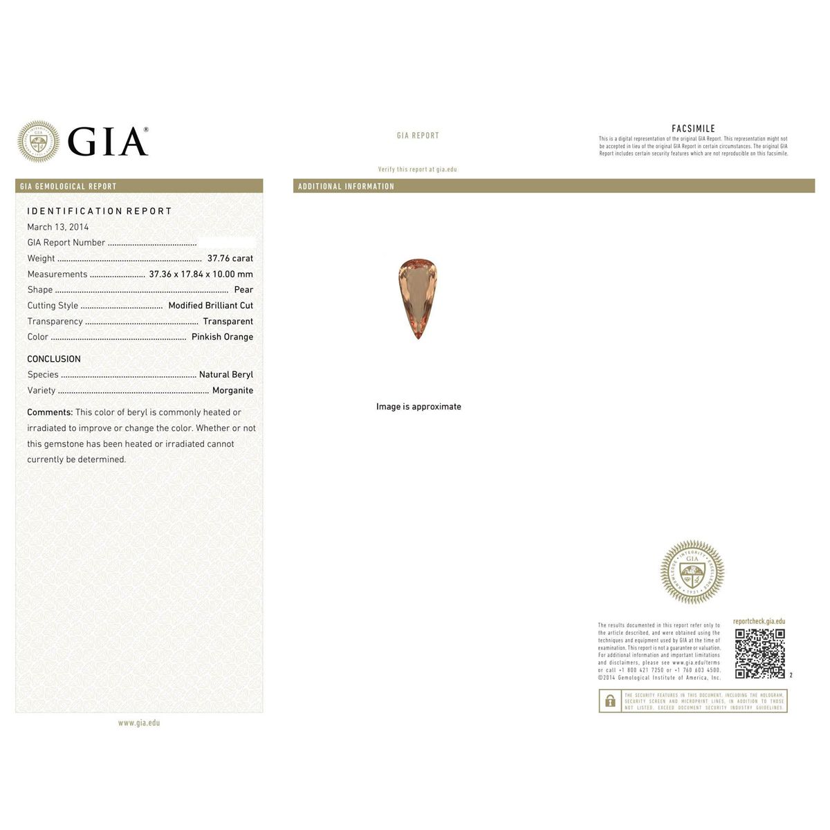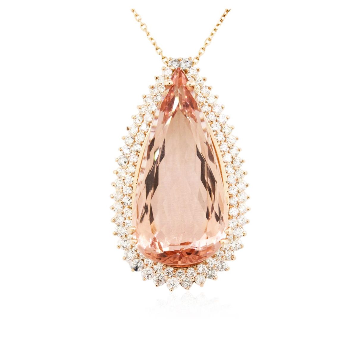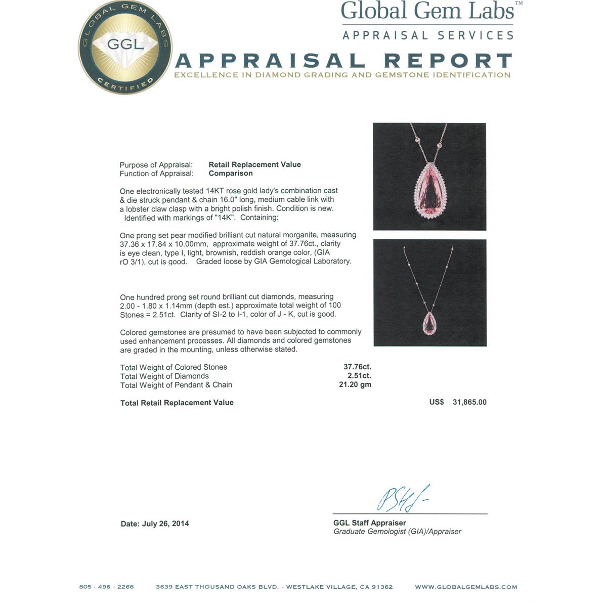 One electronically tested 14KT rose gold lady's combination cast & die struck pendant & chain 16.0" long, medium cable link with a lobster claw clasp with a bright polish finish. Condition is new. Identified with markings of "14K". Containing: One prong set pear modified brilliant cut natural morganite, measuring 37.36 x 17.84 x 10.00mm, approximate weight of 37.76ct., clarity is eye clean, type I, light, brownish, reddish orange color, (GIA rO 3/1), cut is good. GIA REPORT: 2151952523. One Hundred prong set round brilliant cut diamonds, measuring 2.00 - 1.80 x 1.14mm (depth est.) approximate. Total Weight of 100 Stones = 2.51ct. Clarity: SI-2 to I-1. Color: J - K, Cut is Good. Colored gemstones are presumed to have been subjected to commonly used enhancement processes. All diamonds and colored gemstones are graded in the mounting, unless otherwise stated. Total Weight of Colored Stones 37.76ct. Total Weight of Diamonds 2.51ct. Total Weight of Pendant & Chain 21.20 grams. GGL Appraised at $31,865.00.