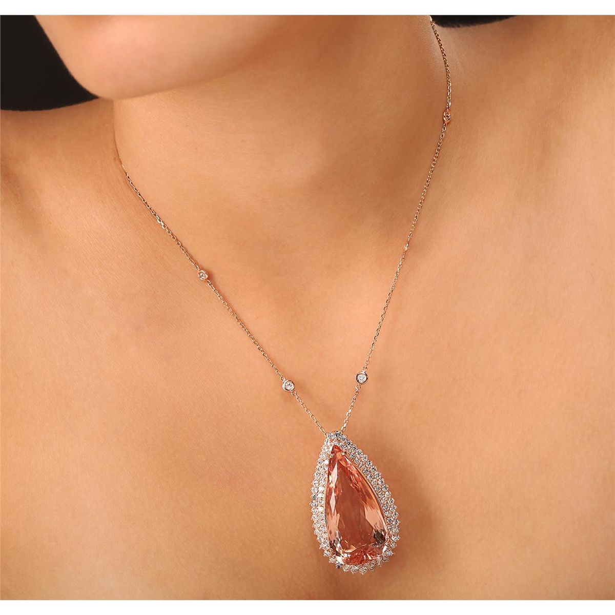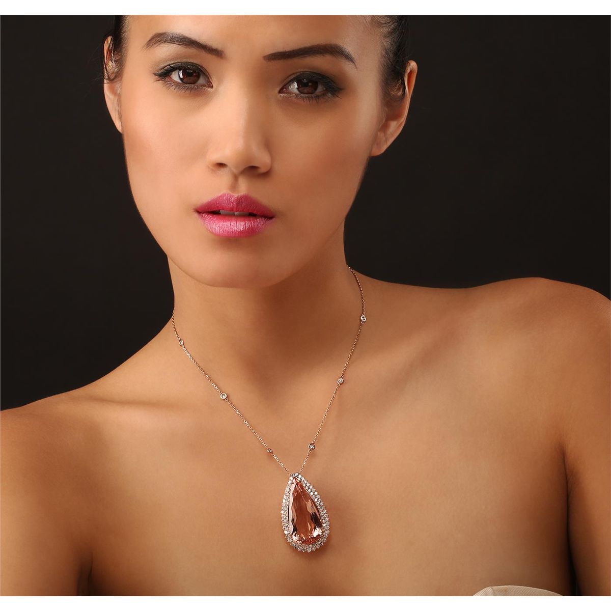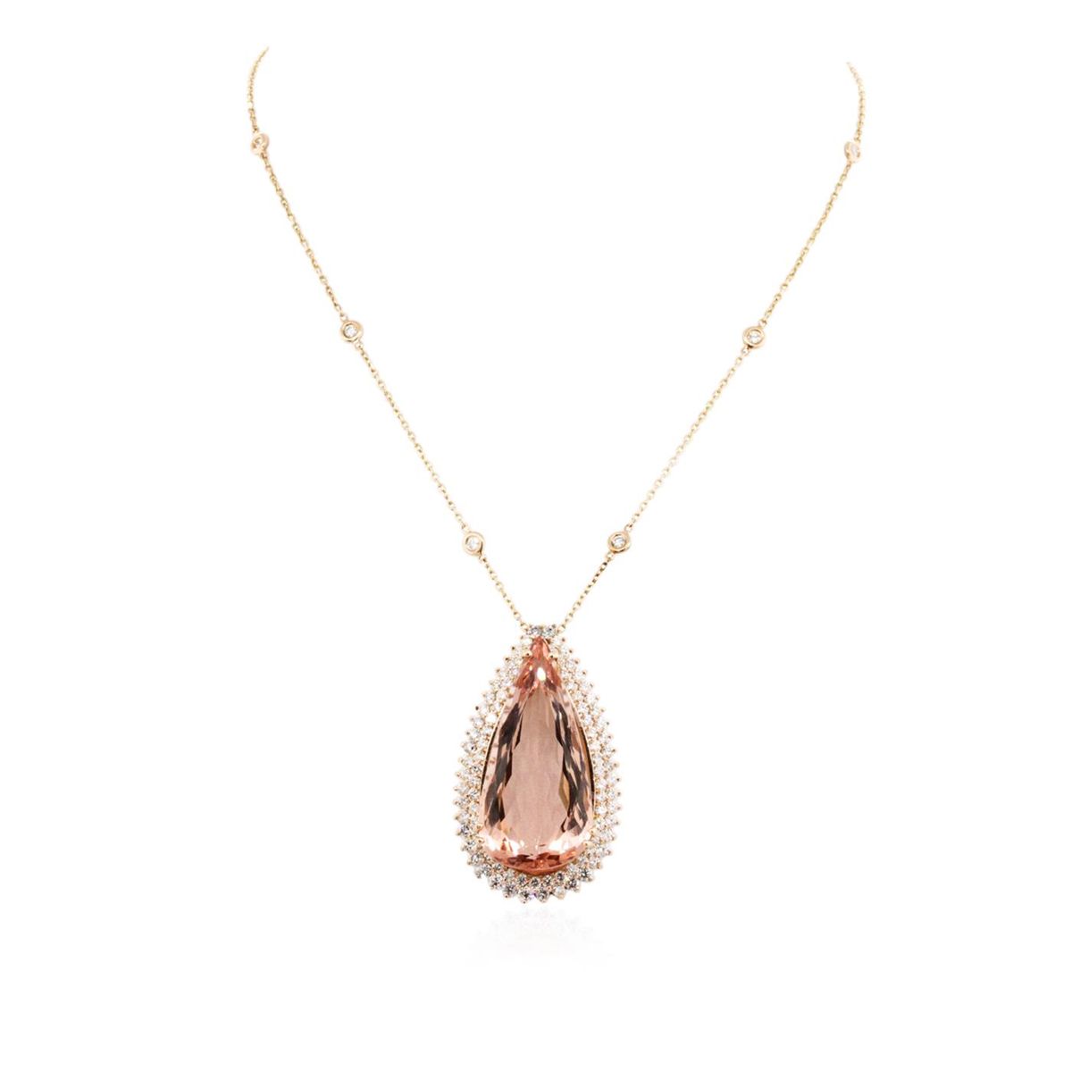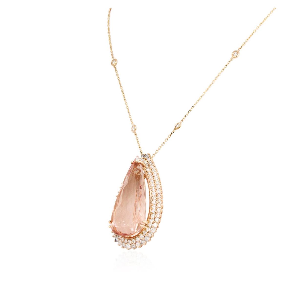 One electronically tested 14KT rose gold lady's combination cast & die struck pendant & chain 16.0" long, medium cable link with a lobster claw clasp with a bright polish finish. Condition is new. Identified with markings of "14K". Containing: One prong set pear modified brilliant cut natural morganite, measuring 37.36 x 17.84 x 10.00mm, approximate weight of 37.76ct., clarity is eye clean, type I, light, brownish, reddish orange color, (GIA rO 3/1), cut is good. GIA REPORT: 2151952523. One Hundred prong set round brilliant cut diamonds, measuring 2.00 - 1.80 x 1.14mm (depth est.) approximate. Total Weight of 100 Stones = 2.51ct. Clarity: SI-2 to I-1. Color: J - K, Cut is Good. Colored gemstones are presumed to have been subjected to commonly used enhancement processes. All diamonds and colored gemstones are graded in the mounting, unless otherwise stated. Total Weight of Colored Stones 37.76ct. Total Weight of Diamonds 2.51ct. Total Weight of Pendant & Chain 21.20 grams. GGL Appraised at $31,865.00.