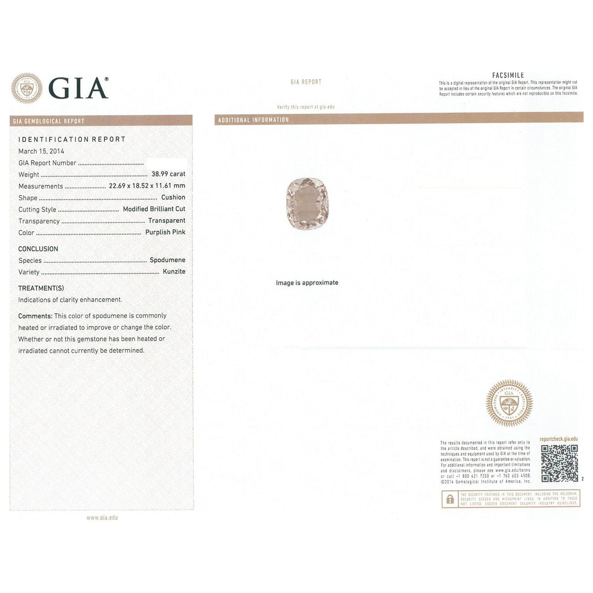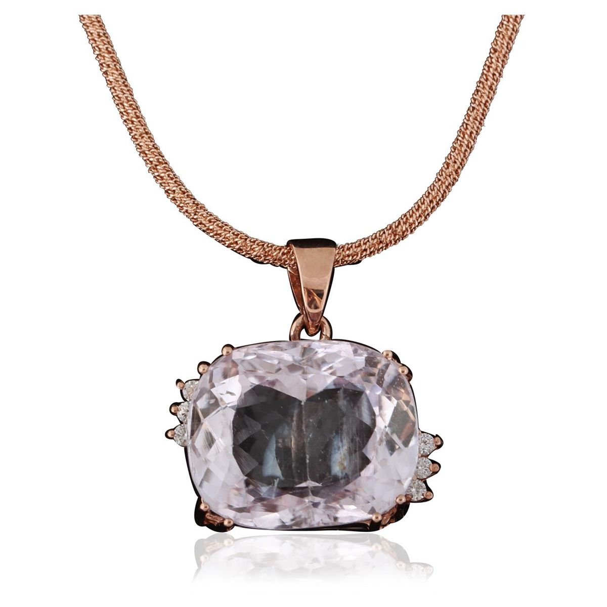 One electronically tested 14KT rose gold ladies cast & assembled kunzite & diamond pendant with chain. Condition is new, good workmanship. The pendant features a kunzite accented by diamond ribbons, terminating in a rose gold bail. The pendant is supported by an eighteen inch length 14KT rose gold designer style chain, terminating in a lobster claw clasp. Bright polish finish. Condition is new, good workmanship. Identified with markings of "14K". Containing: One prong set cushion modified brilliant cut natural kunzite, measuring 22.69 x 18.52 x 11.61mm, exact weight 38.99ct., medium, very slightly grayish Clarity is slightly included, medium, very slightly brownish, purplish pink color, (GIA pPi 5/3), cut is good. Transmitting light with no distortion, transparent. Naturally occurring internal & external characteristics are present. GIA Gemological Report attached. Graded loose prior to setting in the GIA Laboratory, Report #2151952127.Six prong set round brilliant cut diamonds, measuring 2.20 - 2.10 x 1.29mm (depth est.) approximate. Total Weight of 6 Stones = 0.31ct. Graded in the setting. Clarity: SI-1 to SI-2. Color: G - I. Total Weight of Colored Stones 38.99ct. Total Weight of Diamonds 0.31ct. Total Weight of Pendant With Chain 24.79gm. AIG Appraised at $28,100.00.