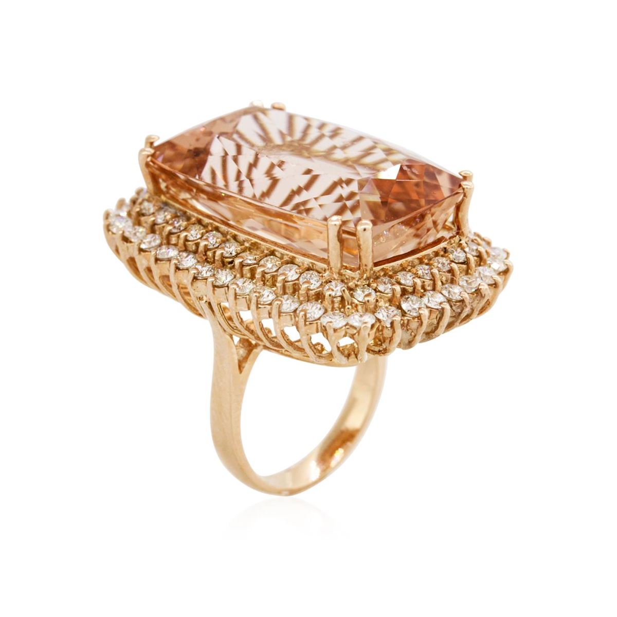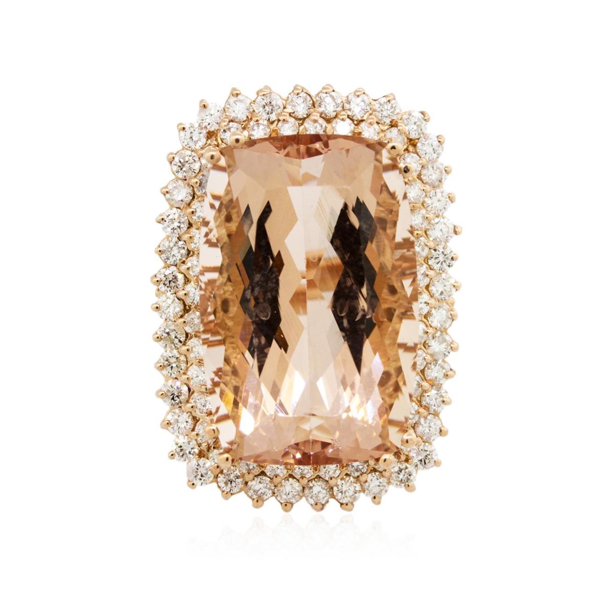 One electronically tested 14KT rose gold ladies cast morganite and diamond ring with a bright polish finish. Condition is new, good workmanship. The featured morganite is set within a two tiered diamond lattice gallery, completed by a three millimeter wide band. Identified with markings of "K14". Containing: One prong set rectangular cushion modified brilliant cut natural morganite, measuring 27.11 x 17.90 x 12.09mm, 8%. bulge factor, exact weight 40.64ct., type I Clarity is eye clean, medium, slightly brownish, pinkish orange color, (GIA piO 5/2), cut is good. Transmitting light with no distortion, transparent. GIA Gemological Report attached. Graded loose prior to setting in the GIA Laboratory, Report #6157951940.Seventy-Six prong set round brilliant cut diamonds, measuring 2.40 - 1.90 x 1.29mm (depth est.) approximate. Total Weight of 76 Stones = 3.05ct. Graded in the setting. Clarity: SI-2 to I-1. Color: G - I. Total Weight of Colored Stones 40.64ct. Total Weight of Diamonds 3.05ct. Total Weight of Ring 22.80grams. AIG Appraised at $43,370.00.