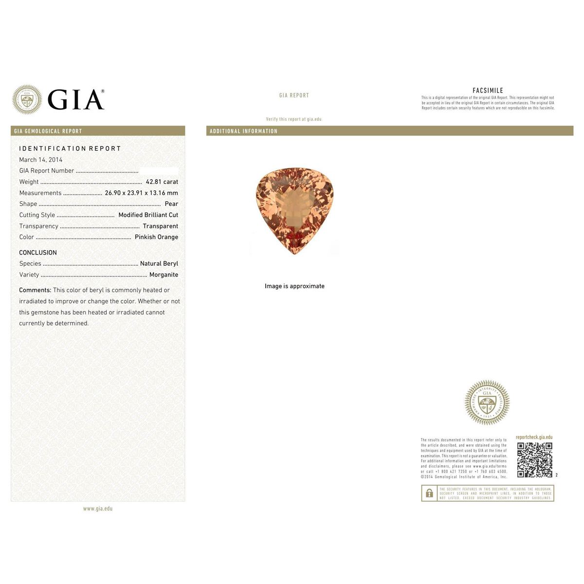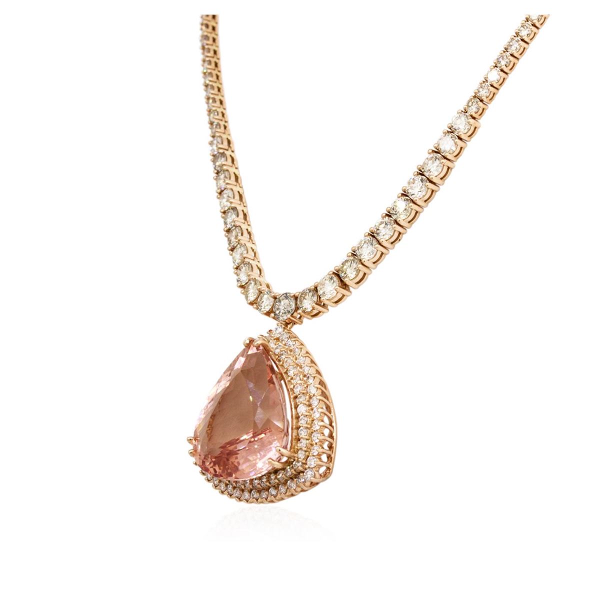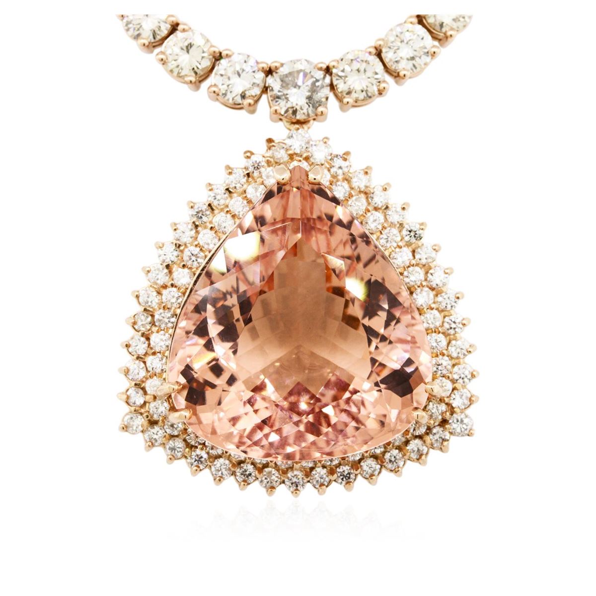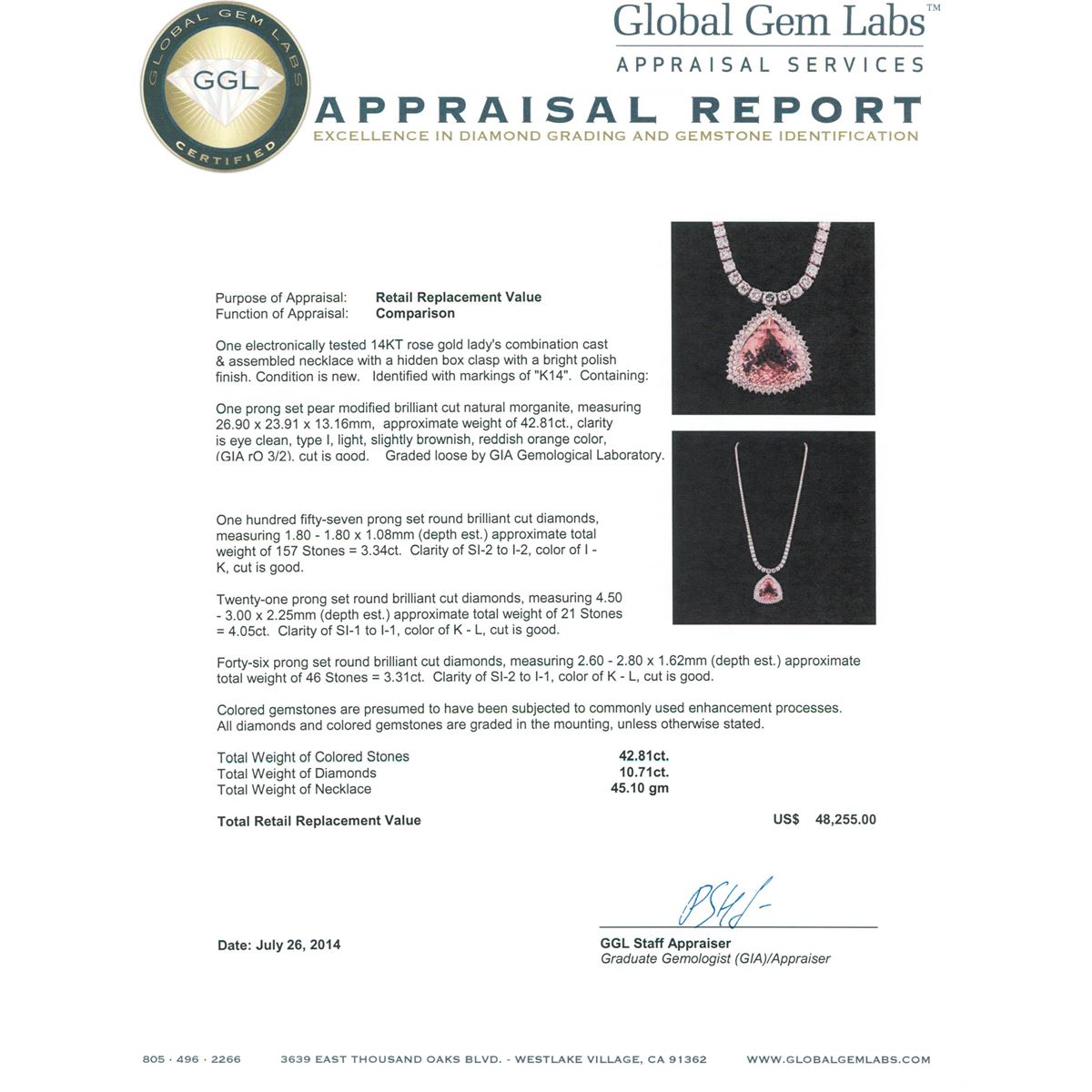 One electronically tested 14KT rose gold lady's combination cast & assembled necklace with a hidden box clasp with a bright polish finish. Condition is new. Identified with markings of "K14". Containing: One prong set pear modified brilliant cut natural morganite, measuring 26.90 x 23.91 x 13.16mm, approximate weight of 42.81ct., clarity is eye clean, type I, light, slightly brownish, reddish orange color, (GIA rO 3/2), cut is good. GIA REPORT: 6157962136. One Hundred Fifty-Seven prong set round brilliant cut diamonds, measuring 1.80 - 1.80 x 1.08mm (depth est.) approximate. Total Weight of 157 Stones = 3.34ct. Clarity: SI-2 to I-2. Color: I - K, Cut is Good. Twenty-One prong set round brilliant cut diamonds, measuring 4.50 - 3.00. x 2.25mm (depth est.) approximate. Total Weight of 21 Stones = 4.05ct. Clarity: SI-1 to I-1. Color: K - L, Cut is Good. Forty-Six prong set round brilliant cut diamonds, measuring 2.60 - 2.80 x 1.62mm (depth est.) approximate. Total Weight of 46 Stones = 3.31ct. Clarity: SI-2 to I-1. Color: K - L, Cut is Good. Colored gemstones are presumed to have been subjected to commonly used enhancement processes. All diamonds and colored gemstones are graded in the mounting, unless otherwise stated. Total Weight of Colored Stones 42.81ct. Total Weight of Diamonds 10.71ct. Total Weight of Necklace 45.10 grams. GGL Appraised at $48,255.00.