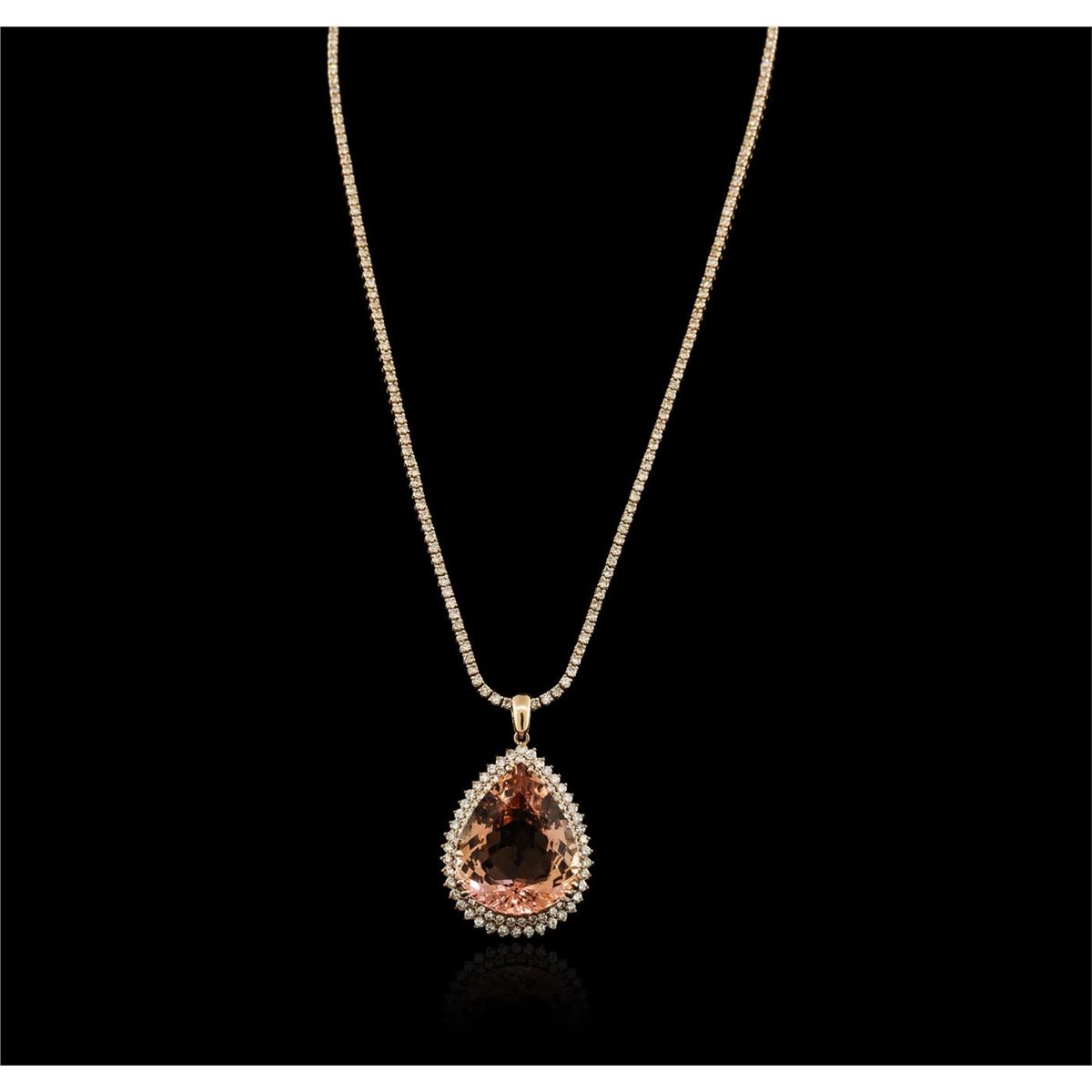 One electronically tested 14KT rose gold ladies cast & assembled morganite and diamond pendant with chain. The pendant features a morganite set within two tiered diamond bezels, completed by a rose gold bail. The pendant is supported by a seventeen and one-quarter inch length flexible diamond chain, terminating in a hidden clasp with safety bar. Bright polish finish. Identified with markings of "14K". Condition is new, good workmanship. Containing: One prong set pear modified brilliant cut natural morganite, measuring 29.55 x 24.06 x 12.22mm, exact weight 46.33ct., type I Clarity is eye clean, medium dark, very slightly brownish, pinkish orange color, (GIA piO 6/3), cut is good. Transmitting light with no distortion, transparent. GIA Gemological Report attached. Graded loose prior to setting in the GIA Laboratory, Report #2151966317.Eighty-Three prong set round brilliant cut diamonds, measuring 2.10 - 2.00 x 1.23mm (depth est.) approximate total weight of 83 Stones = 2.71ct. Graded in the setting. Clarity: SI-1 to I-1. Color: G - I One Hundred Eighty prong set round brilliant cut diamonds, measuring 2.20 - 2.10 x 1.29mm (depth est.) approximate total weight of 180 Stones = 6.63ct. Faint brown secondary color throughout. Graded in the setting. Clarity: SI-1 to I-1. Color: J - L. Total Weight of Colored Stones 46.33ct. Total Weight of Diamonds 9.34ct. Total Weight of Pendant With Chain 41.59 grams. AIG Appraised at $59,965.00.