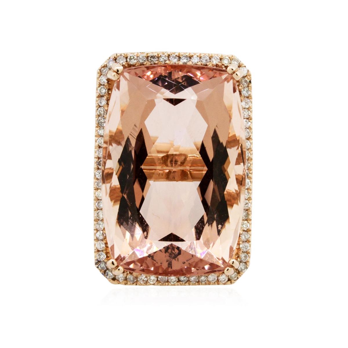 One electronically tested 14KT rose gold Ladies combination cast & assembled ring with a bright polish finish. Condition is new. Identified with markings of "K14". Containing: One prong set rectangular cushion modified brilliant cut natural morganite, measuring 28.10 x 19.18 x 13.07mm, approximate weight of 52.72ct., clarity is eye clean, type I, light, very slightly brownish, reddish orange color, (GIA rO 3/3), cut is good. GIA Report: 1156966337Colored gemstones are presumed to have been subjected to commonly used color/clarity enhancement processes. Sixty-Six prong set round brilliant cut diamonds, measuring 1.30 - 1.30 x 0.78mm (depth est.) approximate. Total Weight of 66 Stones = 0.53ct. Clarity: I-1 to I-2. Color: J - K, Cut is Good. Total Weight of Colored Stones 52.72ct. Total Weight of Diamonds 0.53ct. Total Weight of Ring 19.10 grams. GGL Appraised at $34,855.00.