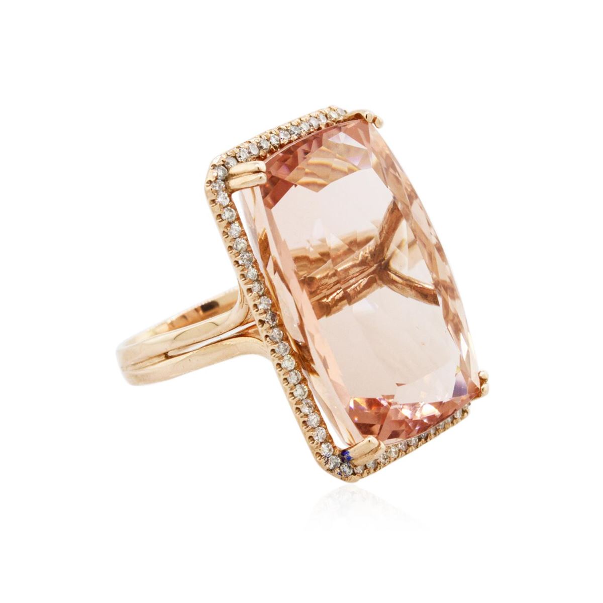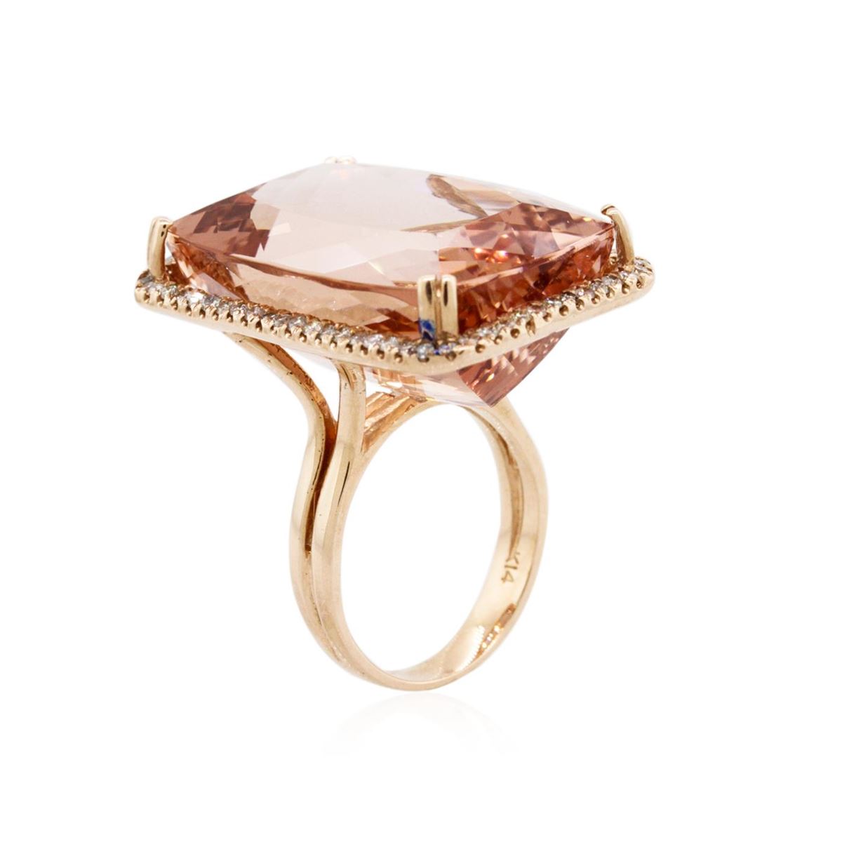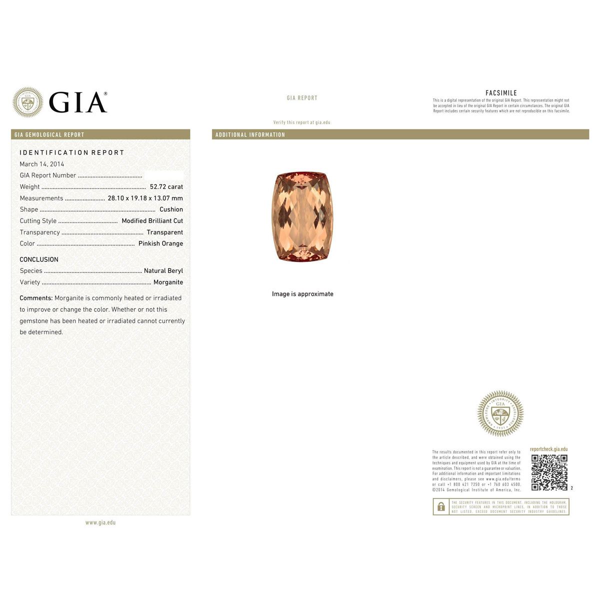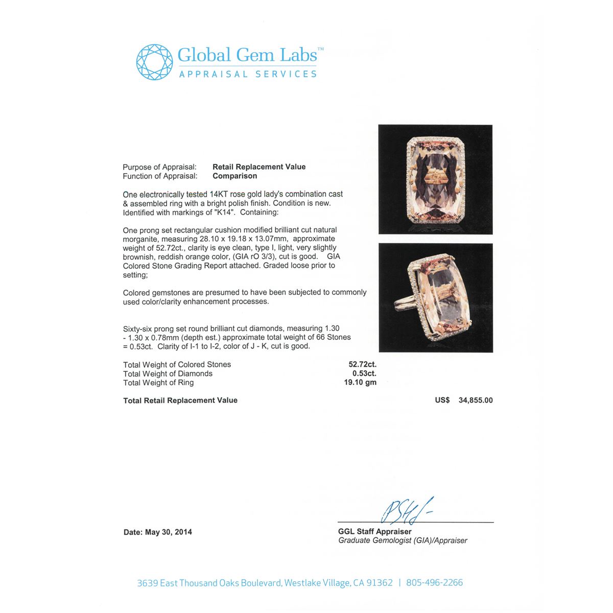 One electronically tested 14KT rose gold Ladies combination cast & assembled ring with a bright polish finish. Condition is new. Identified with markings of "K14". Containing: One prong set rectangular cushion modified brilliant cut natural morganite, measuring 28.10 x 19.18 x 13.07mm, approximate weight of 52.72ct., clarity is eye clean, type I, light, very slightly brownish, reddish orange color, (GIA rO 3/3), cut is good. GIA Report: 1156966337Colored gemstones are presumed to have been subjected to commonly used color/clarity enhancement processes. Sixty-Six prong set round brilliant cut diamonds, measuring 1.30 - 1.30 x 0.78mm (depth est.) approximate. Total Weight of 66 Stones = 0.53ct. Clarity: I-1 to I-2. Color: J - K, Cut is Good. Total Weight of Colored Stones 52.72ct. Total Weight of Diamonds 0.53ct. Total Weight of Ring 19.10 grams. GGL Appraised at $34,855.00.