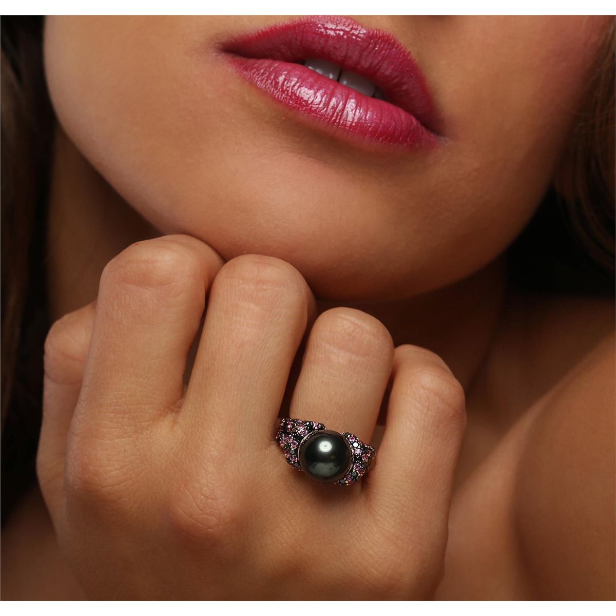 One ring featuring: 14KT yellow gold weighing 5.52 grams containing one black pearl measuring 10.40mm, 70 black diamonds with a total weight 0.93cts, and 70 pink sapphires with a total weight of 0.90cts.