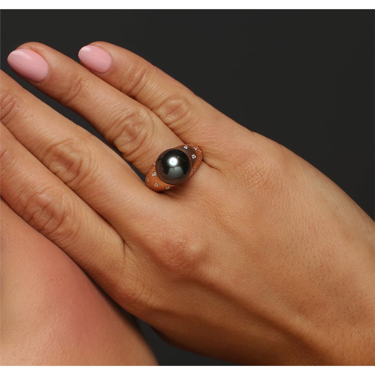 One ring featuring: 14KT rose gold weighing 5.56 grams containing one black pearl and 25 round cut diamonds with a total weight of 0.38cts.