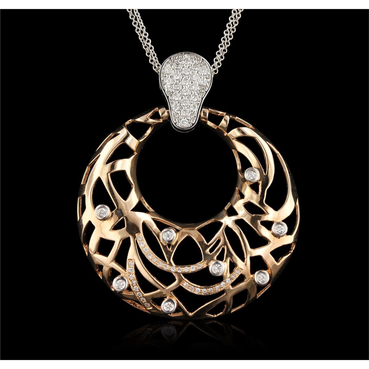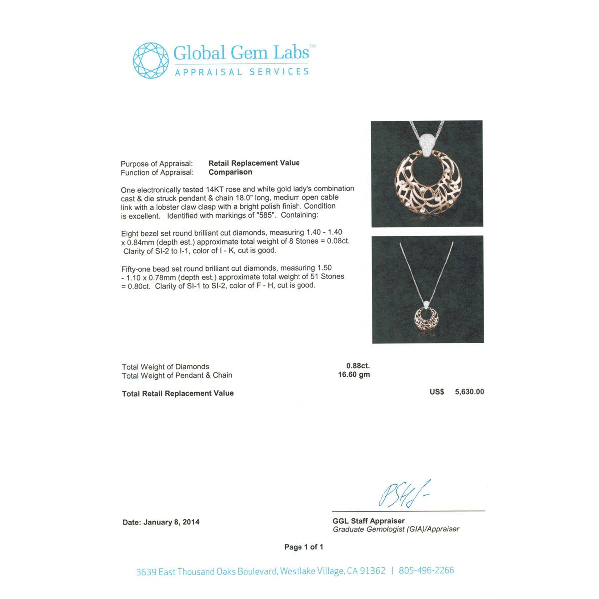 One electronically tested 14KT rose and white gold Ladies combination cast & die struck pendant & chain 18.0" long, medium open cable link with a lobster claw clasp with a bright polish finish. Identified with markings of "585". Condition is excellent. Containing: Eight bezel set round brilliant cut diamonds, measuring 1.40 - 1.40 x 0.84mm (depth est.) approximate total weight of 8 Stones = 0.08ct. Clarity of SI-2 to I-1, Color of I - K, Cut is Good. Fifty-One bead set round brilliant cut diamonds, measuring 1.50 - 1.10 x 0.78mm (depth est.) approximate total weight of 51 Stones = 0.80ct. Clarity of SI-1 to SI-2, Color of F - H, Cut is Good. Total Weight of Diamonds 0.88ct. Total Weight of Pendant & Chain 16.60gm. GGL Appraised at $5,630.00.